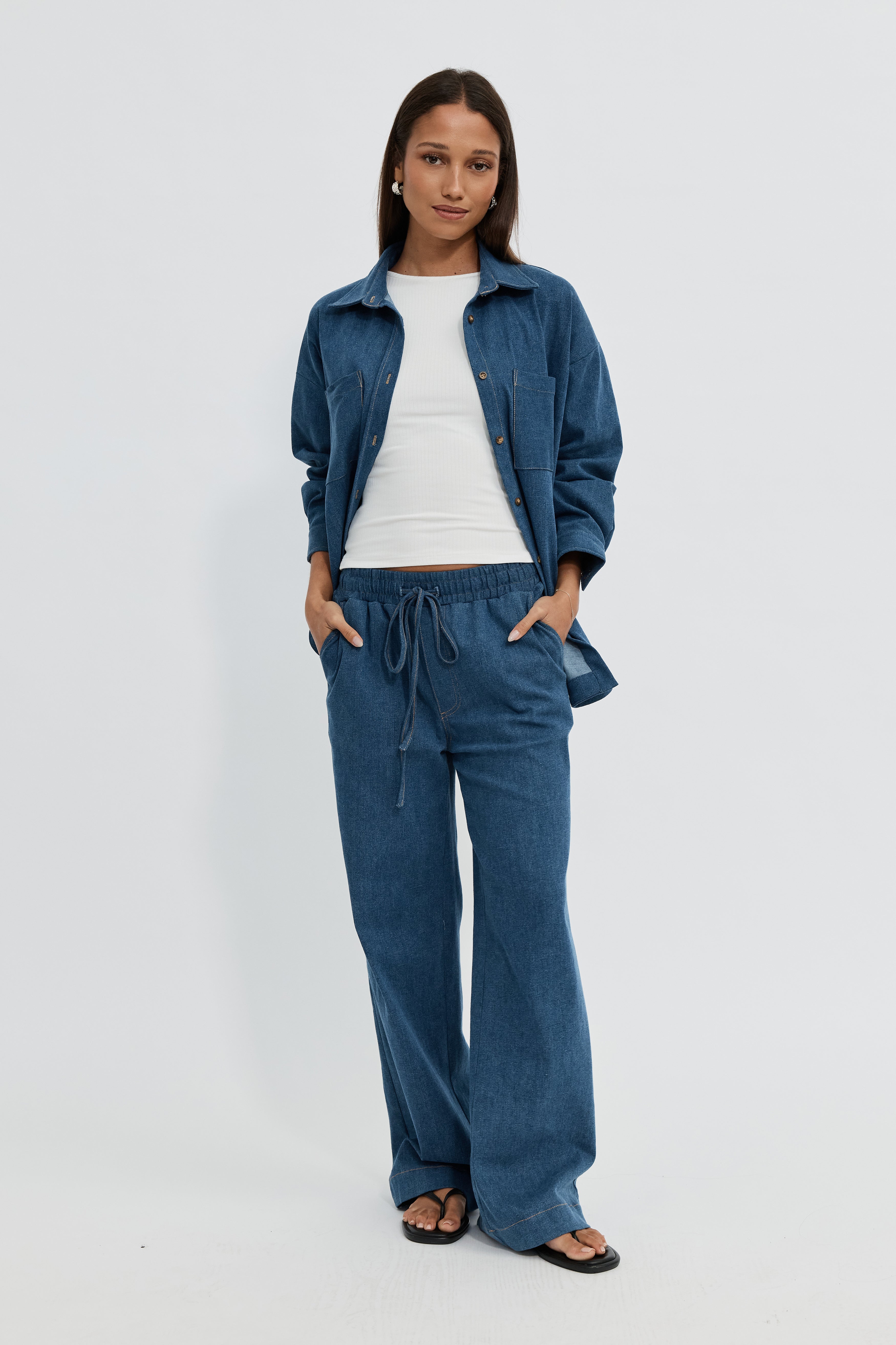 Meet Apéro's very first and highly anticipated Claudia Elastic-Waist Denim Look Pant in Medium Blue. Claudia is designed to bring comfort and versatility to every stage of motherhood. Featuring a super stretchy elastic waistband, this style can be worn over a small growing bump or folded down under a bigger bump for a custom fit. A drawstring tie secures the waist post-pregnancy, making them a truly transitional piece.