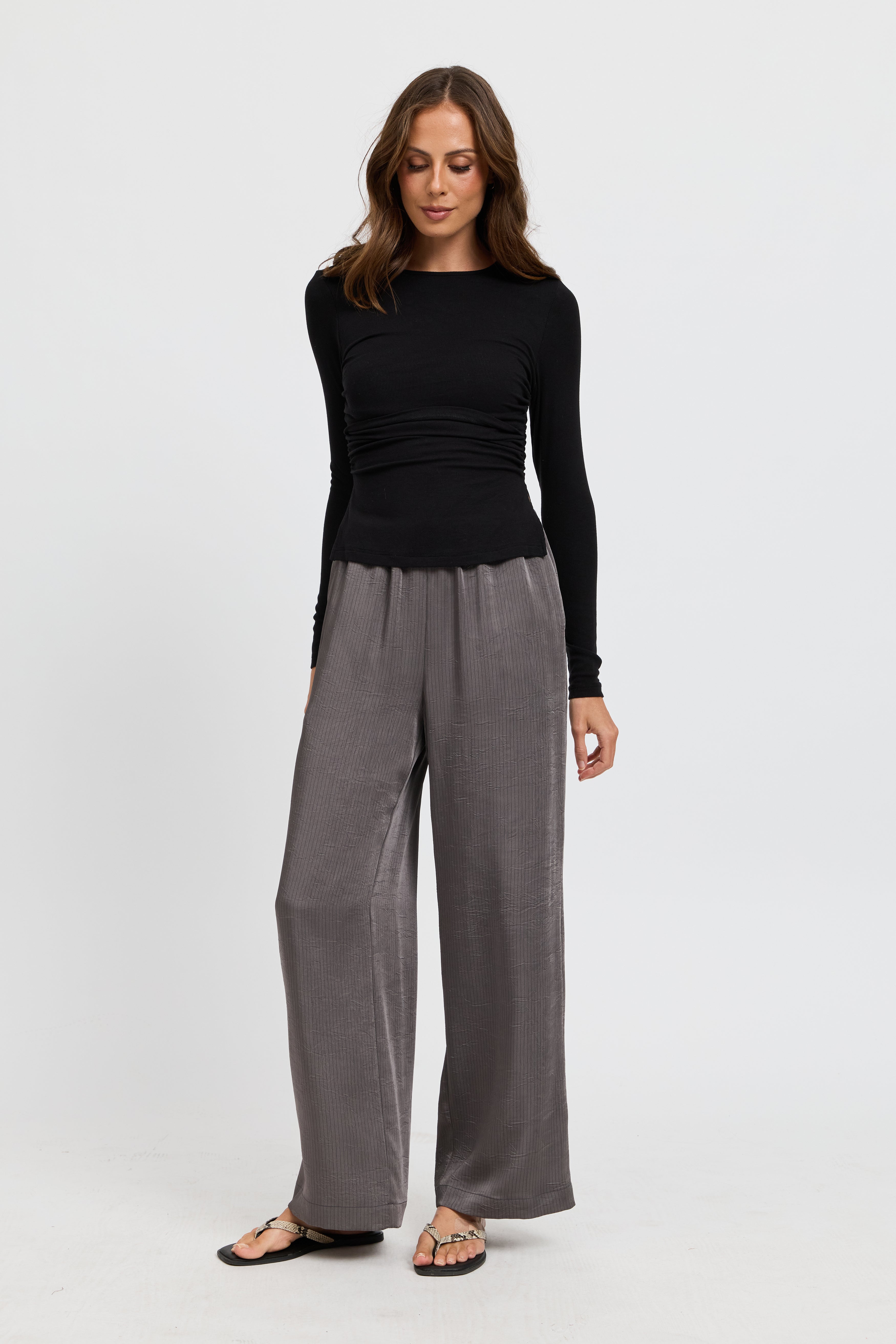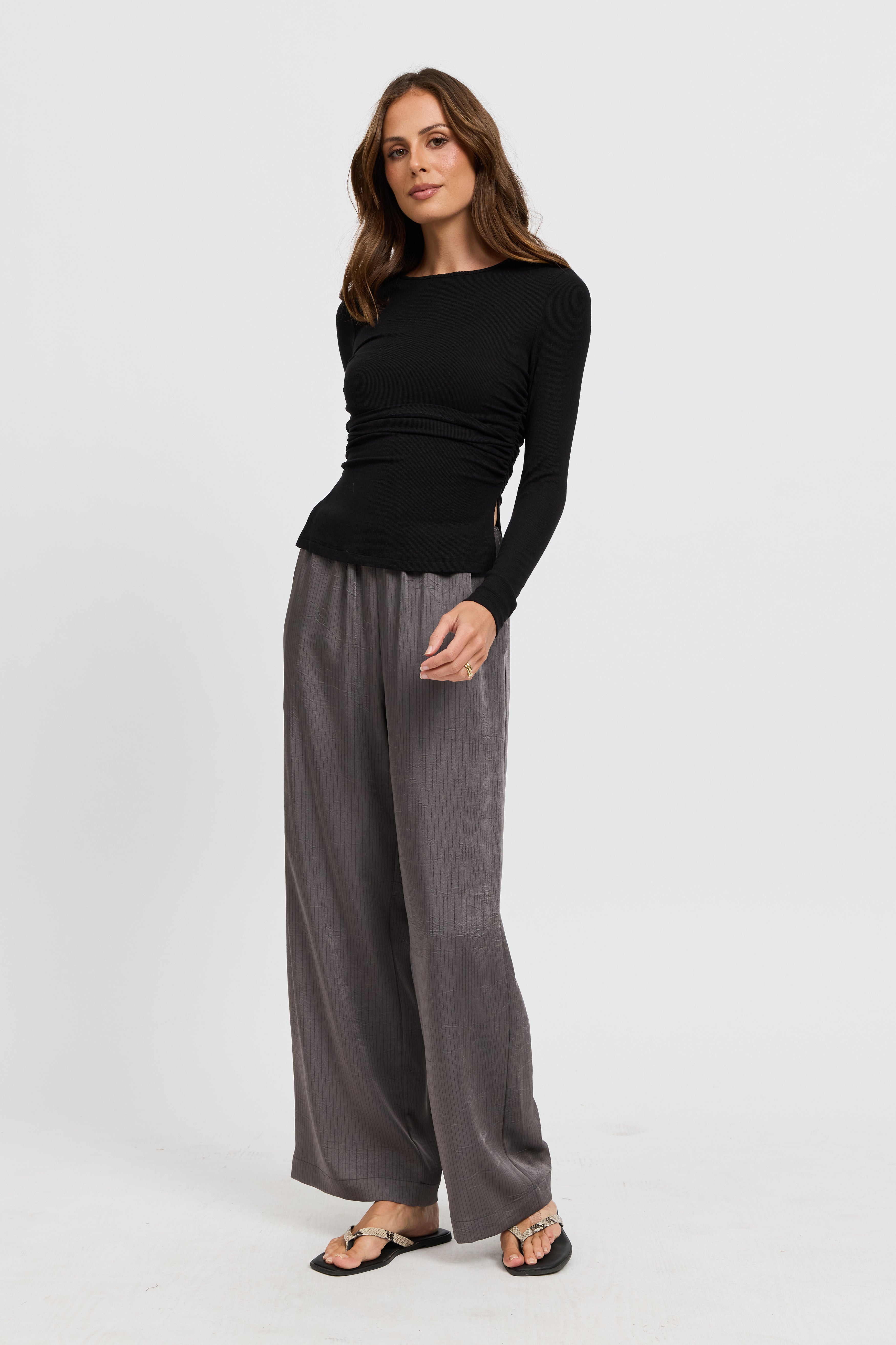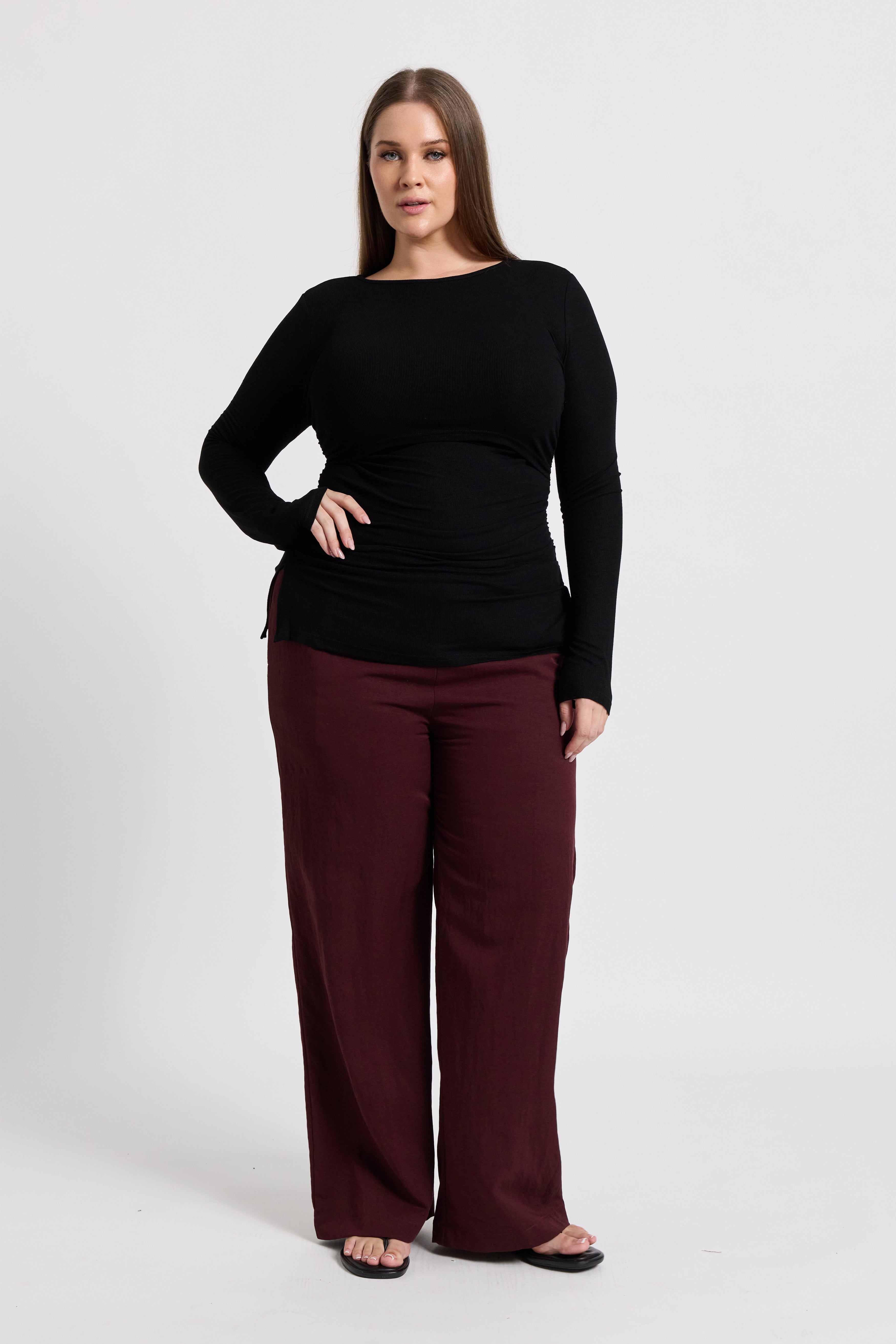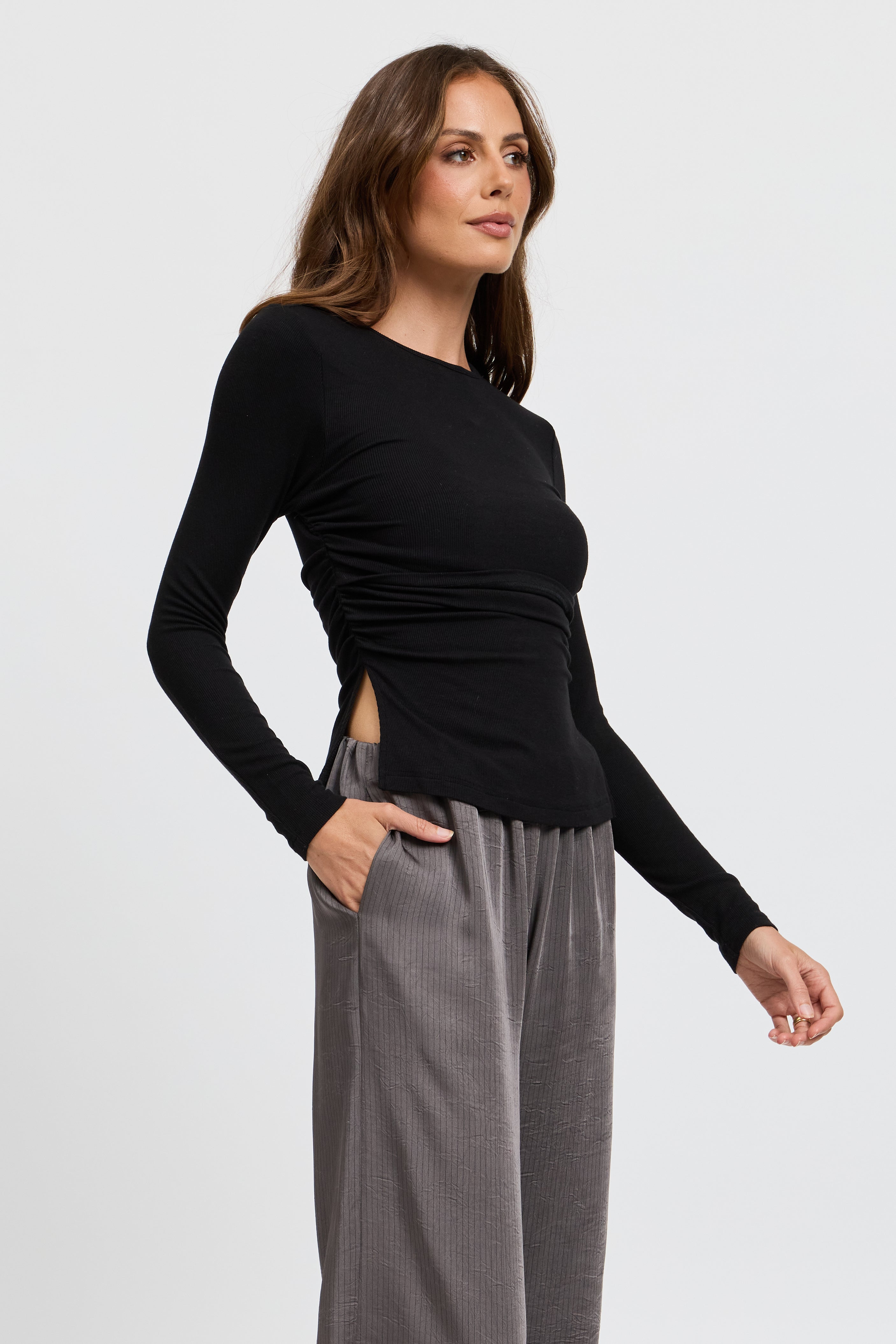 The Ari Ribbed Long Sleeve Top in Black is a sleek, everyday staple designed to support you through every stage of motherhood. Crafted from an ultra-soft, stretchy ribbed knit in classic black, it offers a close body fit with gentle gathering at the side seams to flatter your figure and comfortably accommodate a growing bump.