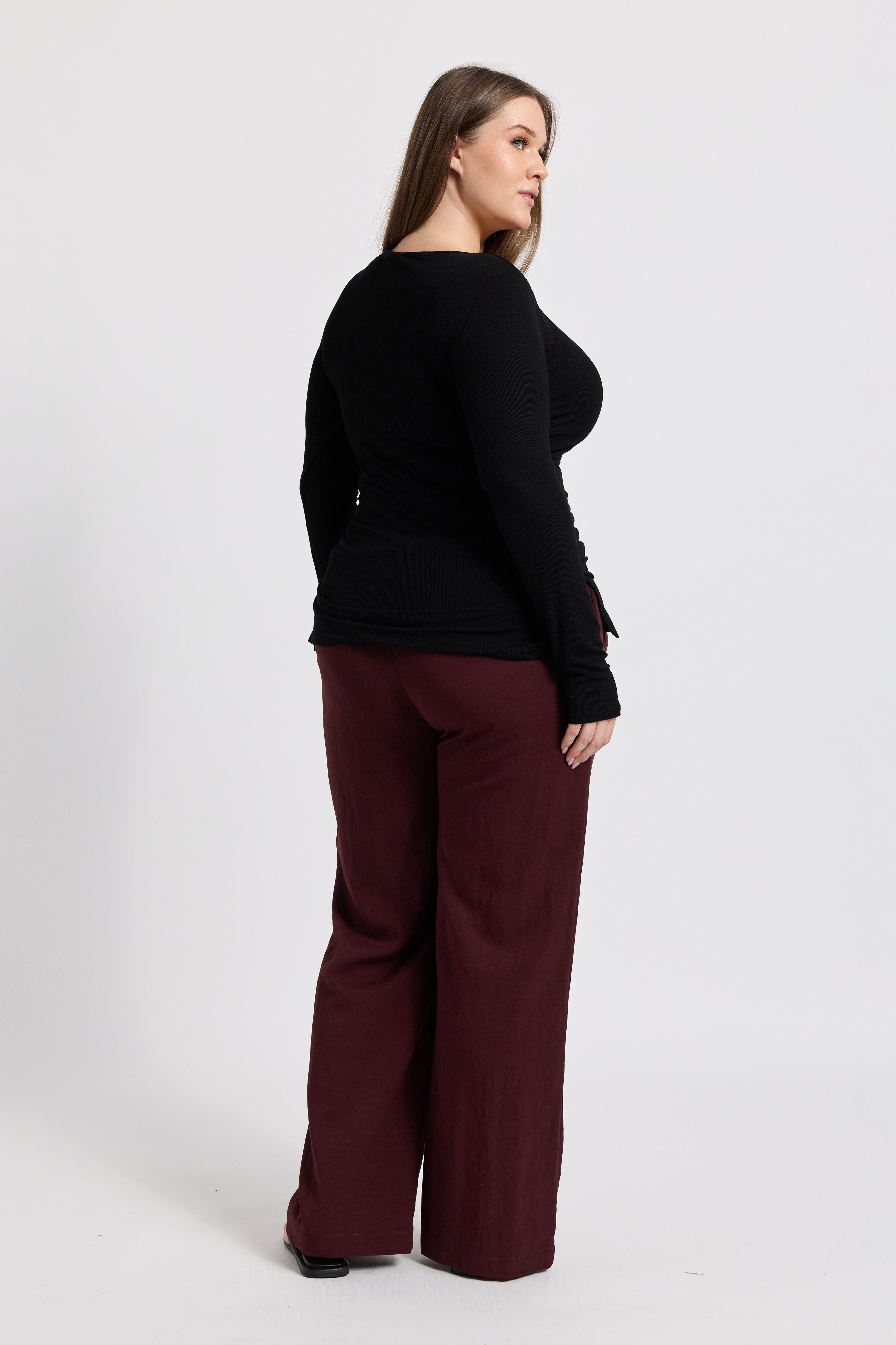 Thoughtfully designed with overlapping front panels at the bust, this top allows for discreet and easy breastfeeding access—blending practicality with modern style. The split hemline sits at the hips, making it easy to tuck into any rise of bottoms, while the long, fitted sleeves and round neckline complete the clean, versatile silhouette.
