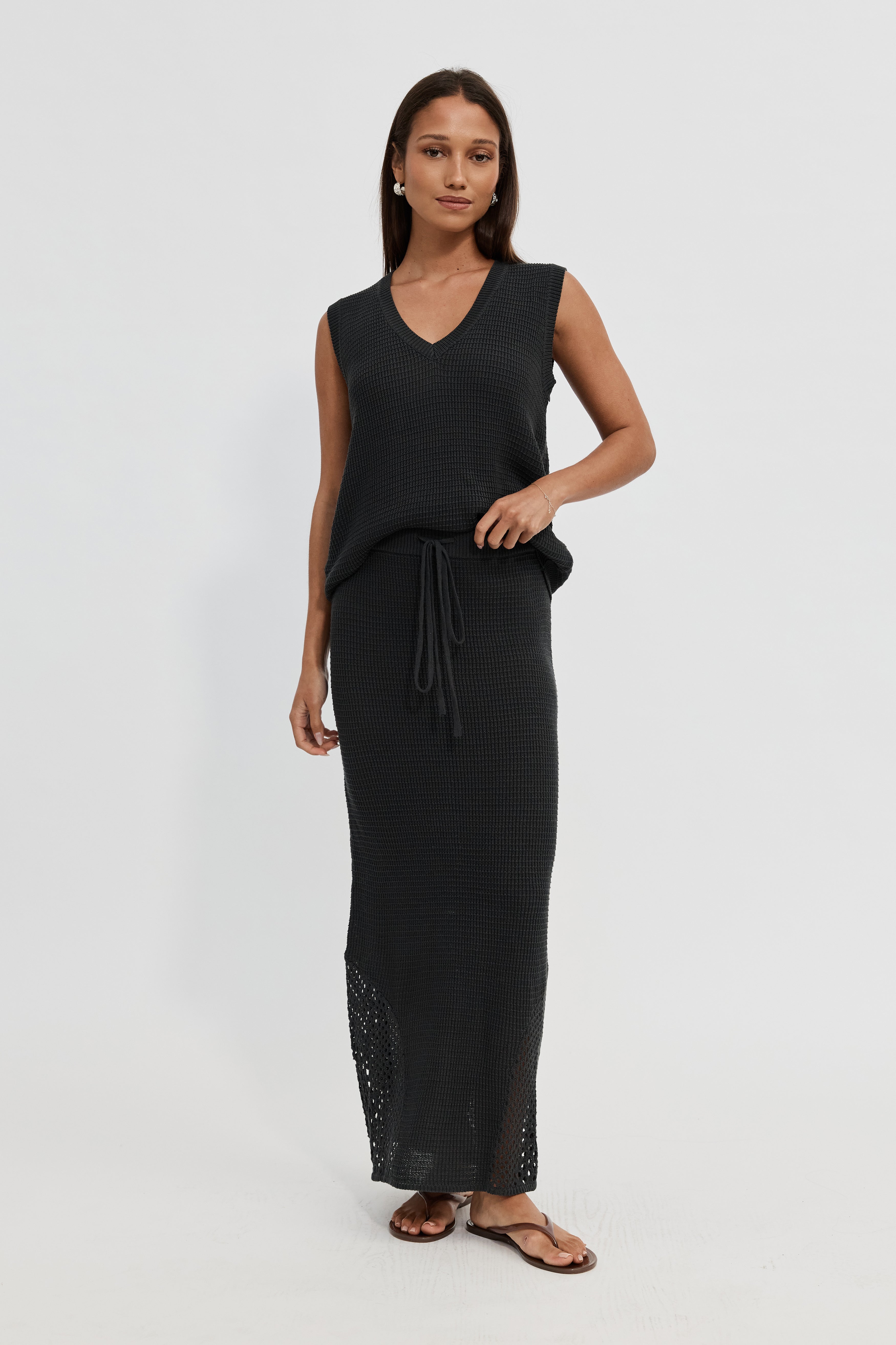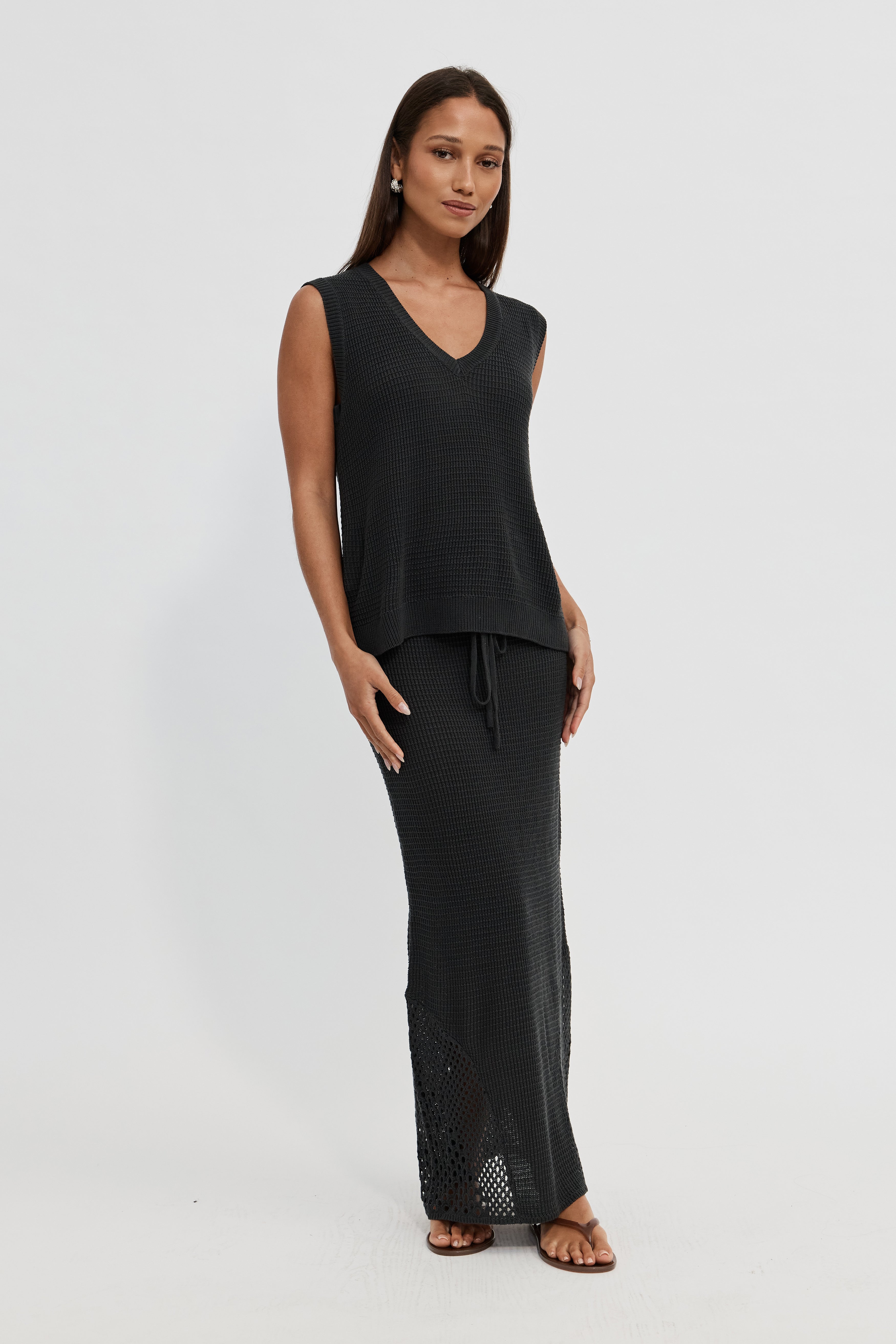 This sleeveless vest-style top features a ribbed V-neckline and hem, with a regular length that finishes at the hips for a flattering silhouette. Lightweight and breathable, the Elodie Top pairs beautifully when styled with the matching Elodie Knit Midi Skirt.