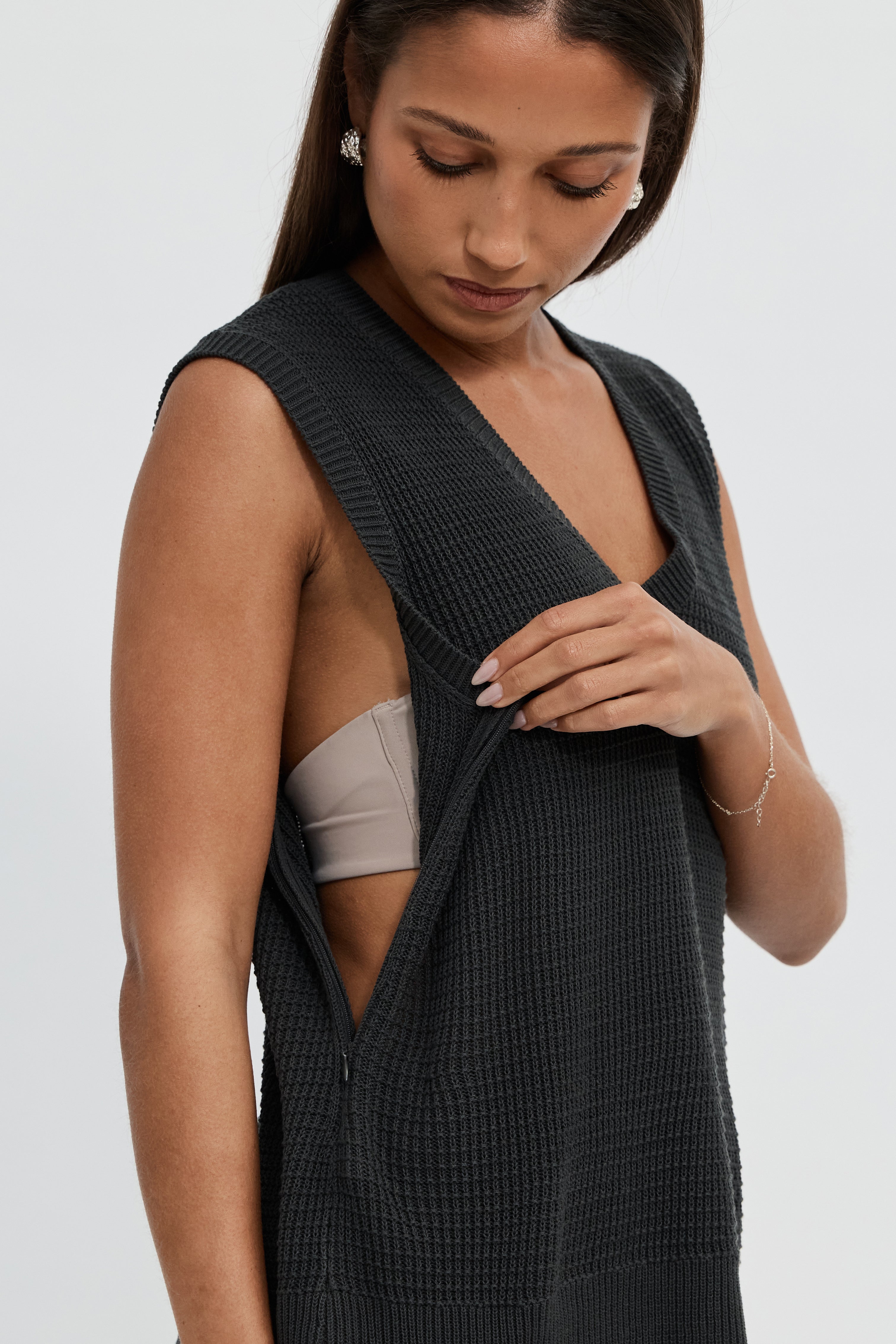 The Elodie Knit Vest Top in Slate is a versatile, breathable essential crafted for comfort and practicality. Designed to move with you, the roomy crochet-style knit drapes effortlessly over a growing bump, while invisible side-seam zippers provide discreet breastfeeding access.