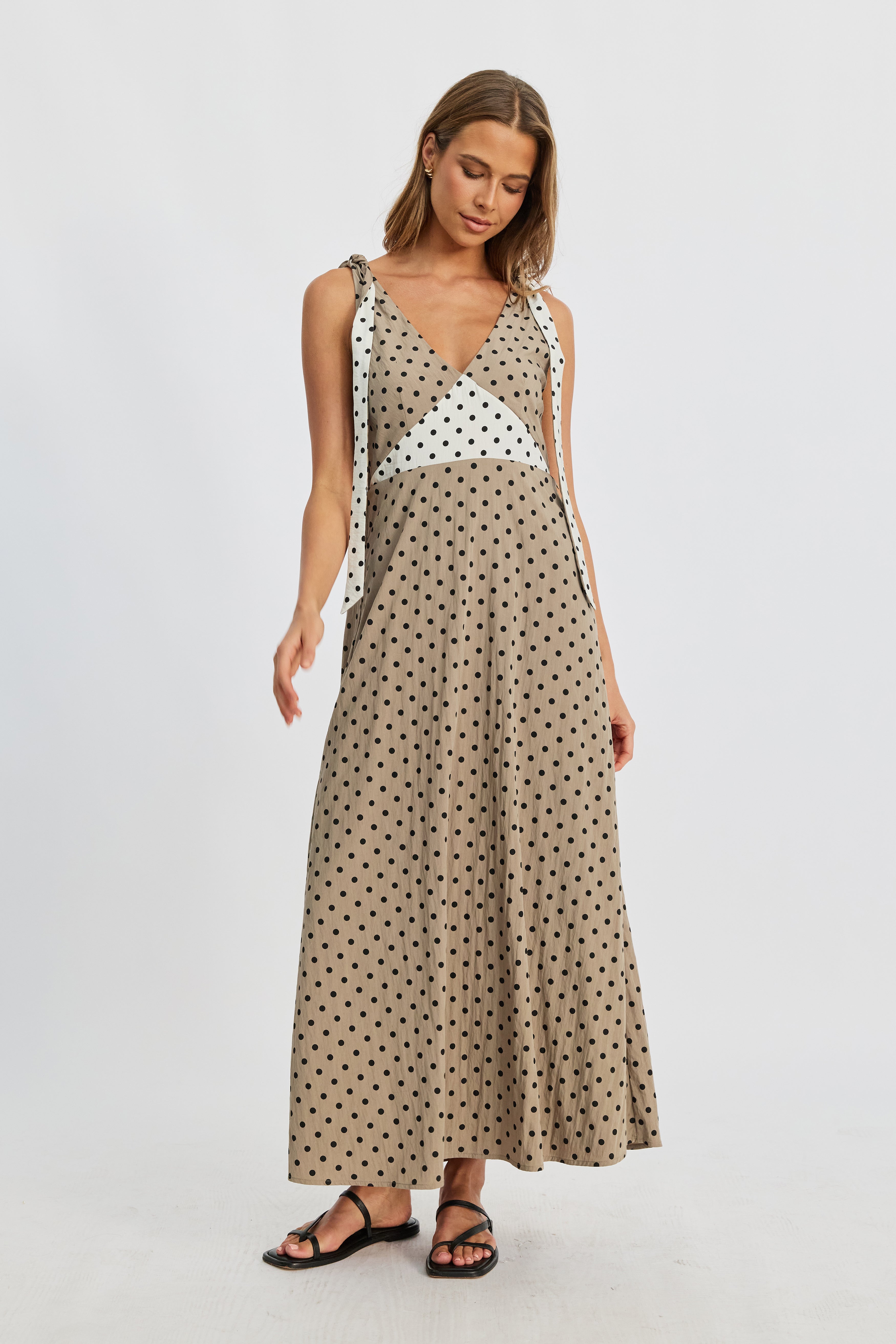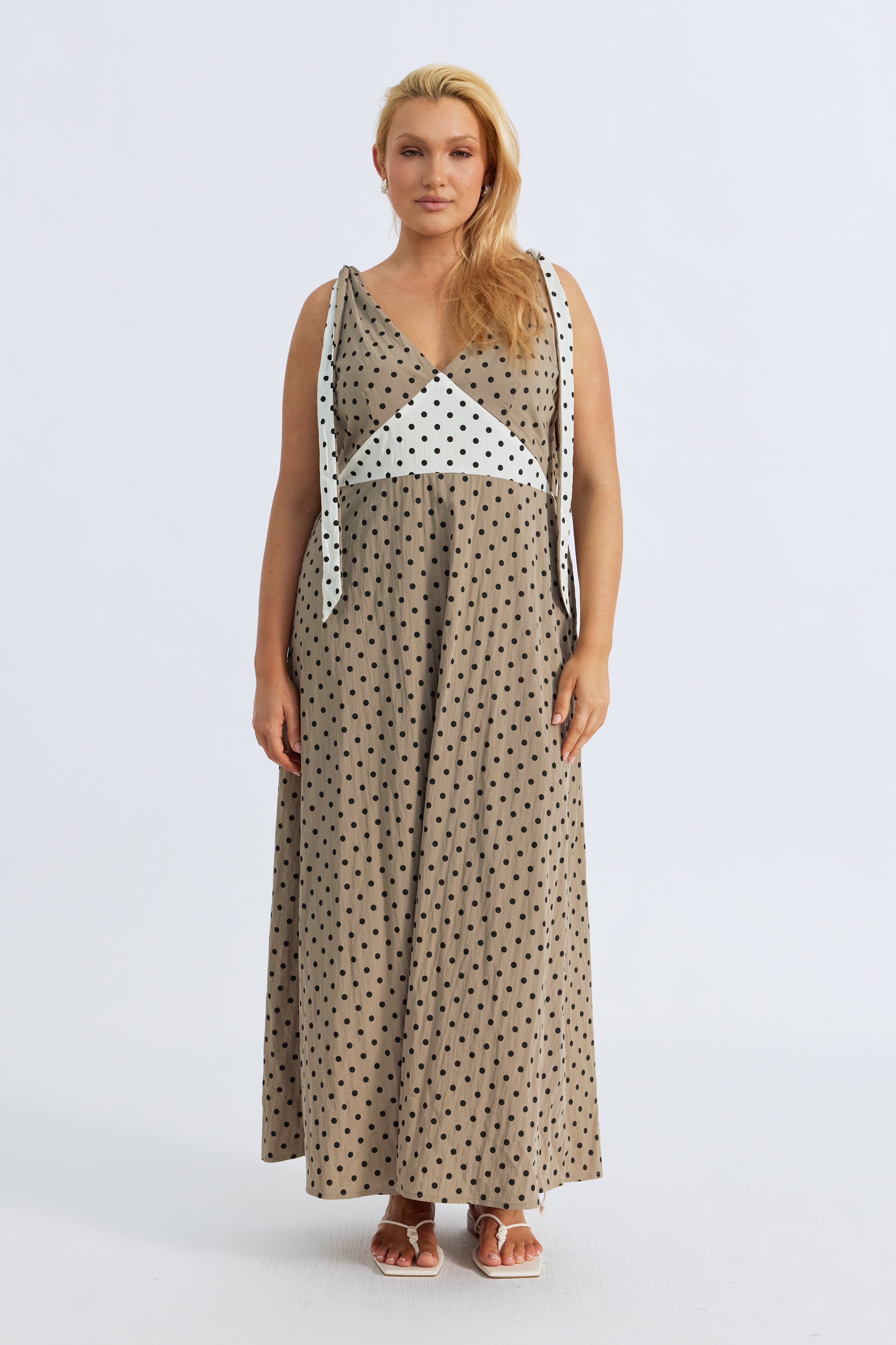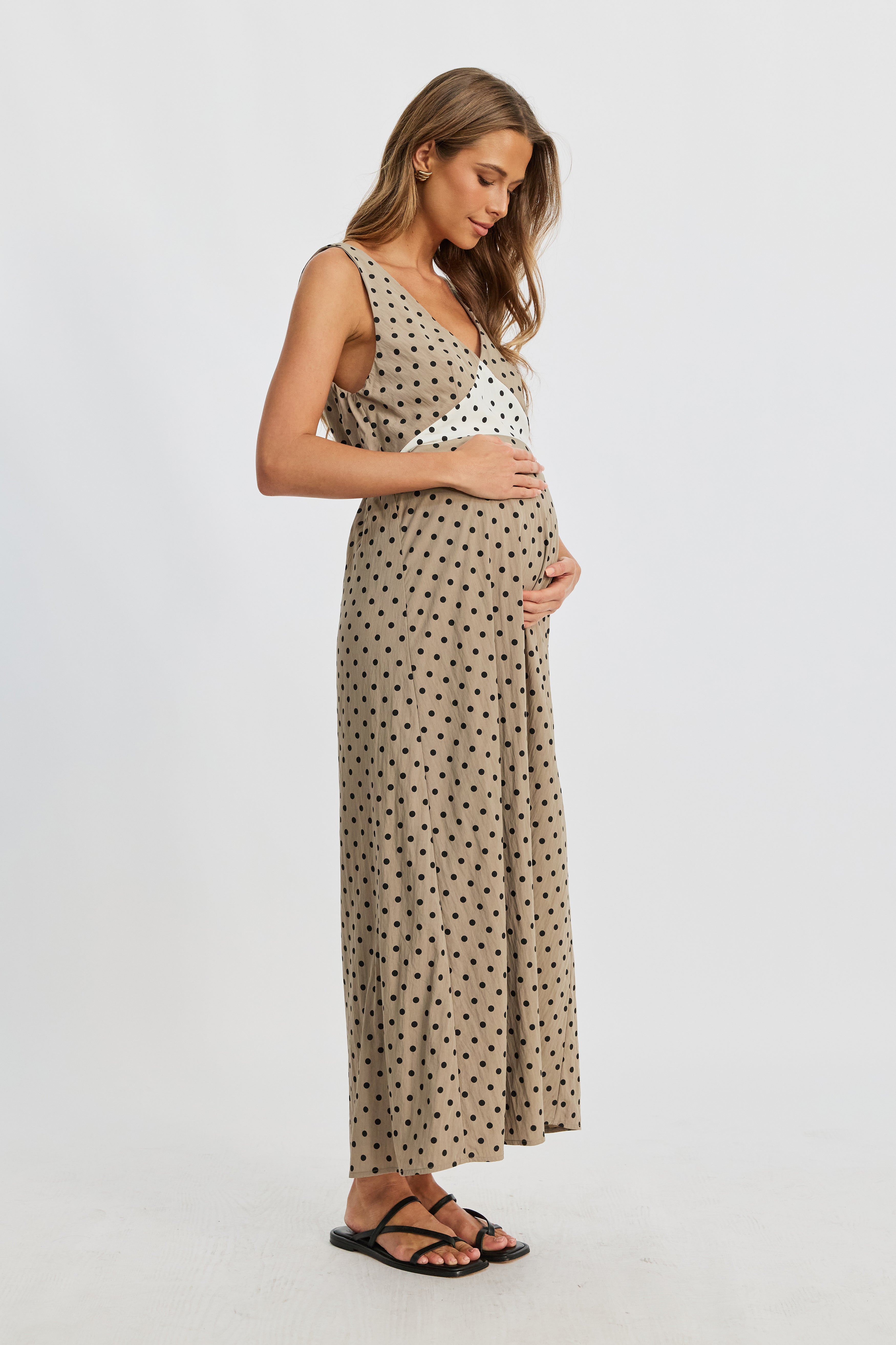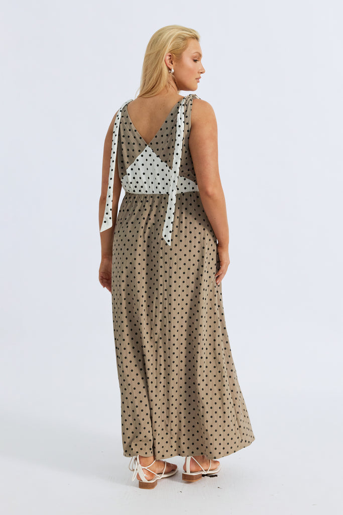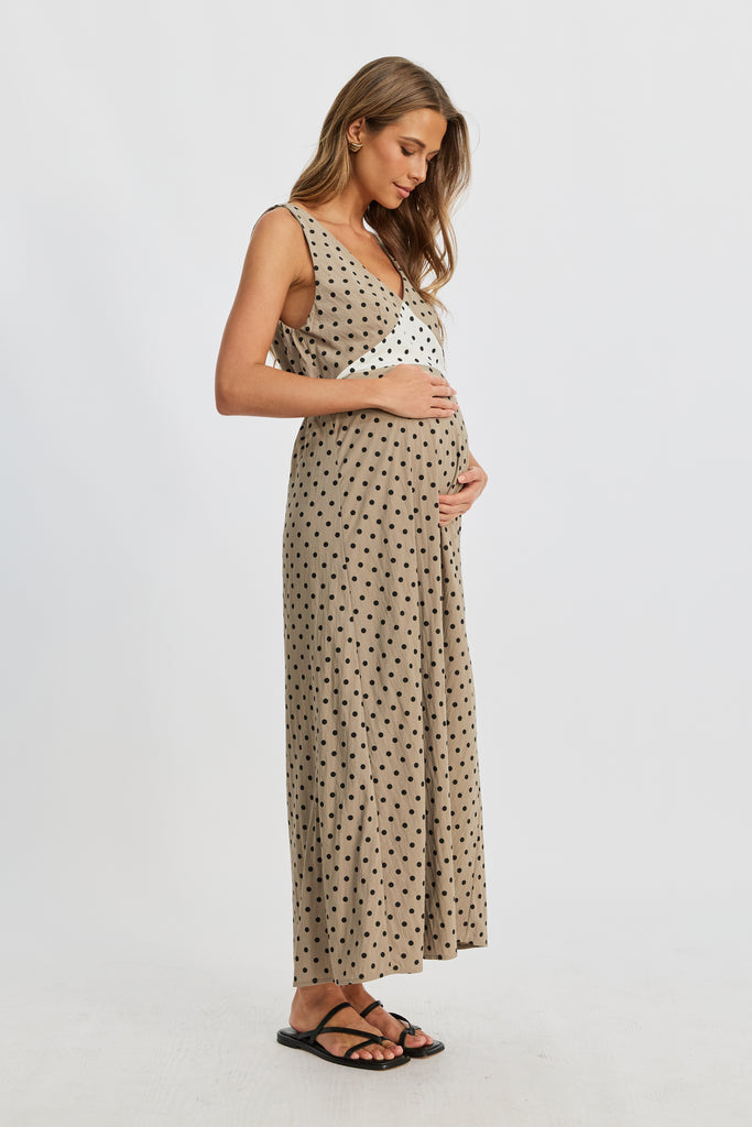 Designed for motherhood, invisible zippers discreetly hidden in the front underbust seams allow for easy breastfeeding access, while the elasticated back waist provides stretch and comfort as your bump grows. A contrast polka dot waist panel adds playful charm, complemented by double-sided shoulder ties—taupe on one side, cream on the reverse—that can be attached to the straps with a hidden button for customizable styling.
