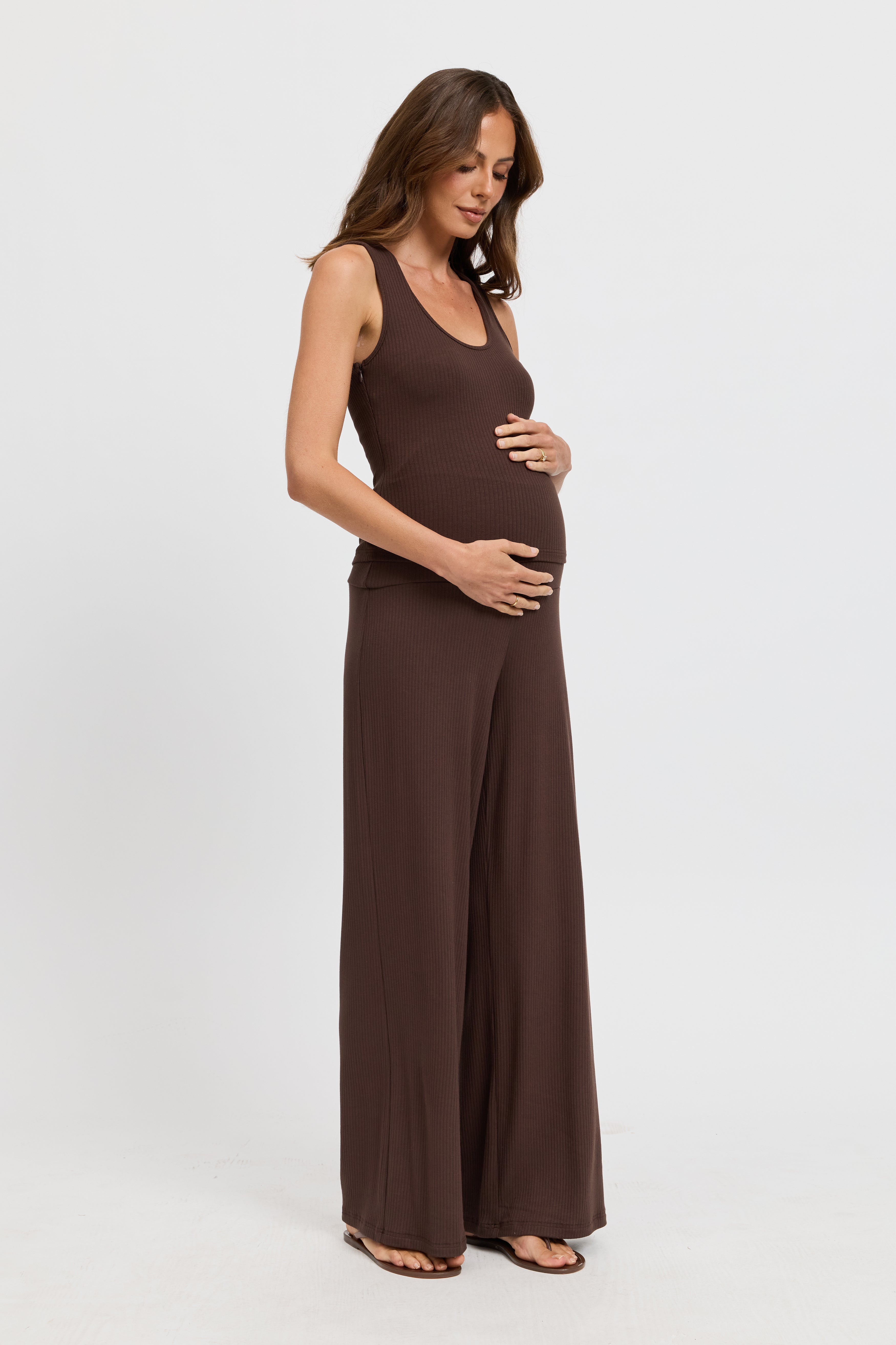 Meet the Esta Ribbed Foldover Waist Pant in Chocolate, a versatile wardrobe essential that effortlessly blends comfort and style. Thoughtfully designed for modern mothers, these pants move with you from pregnancy to postpartum and beyond.