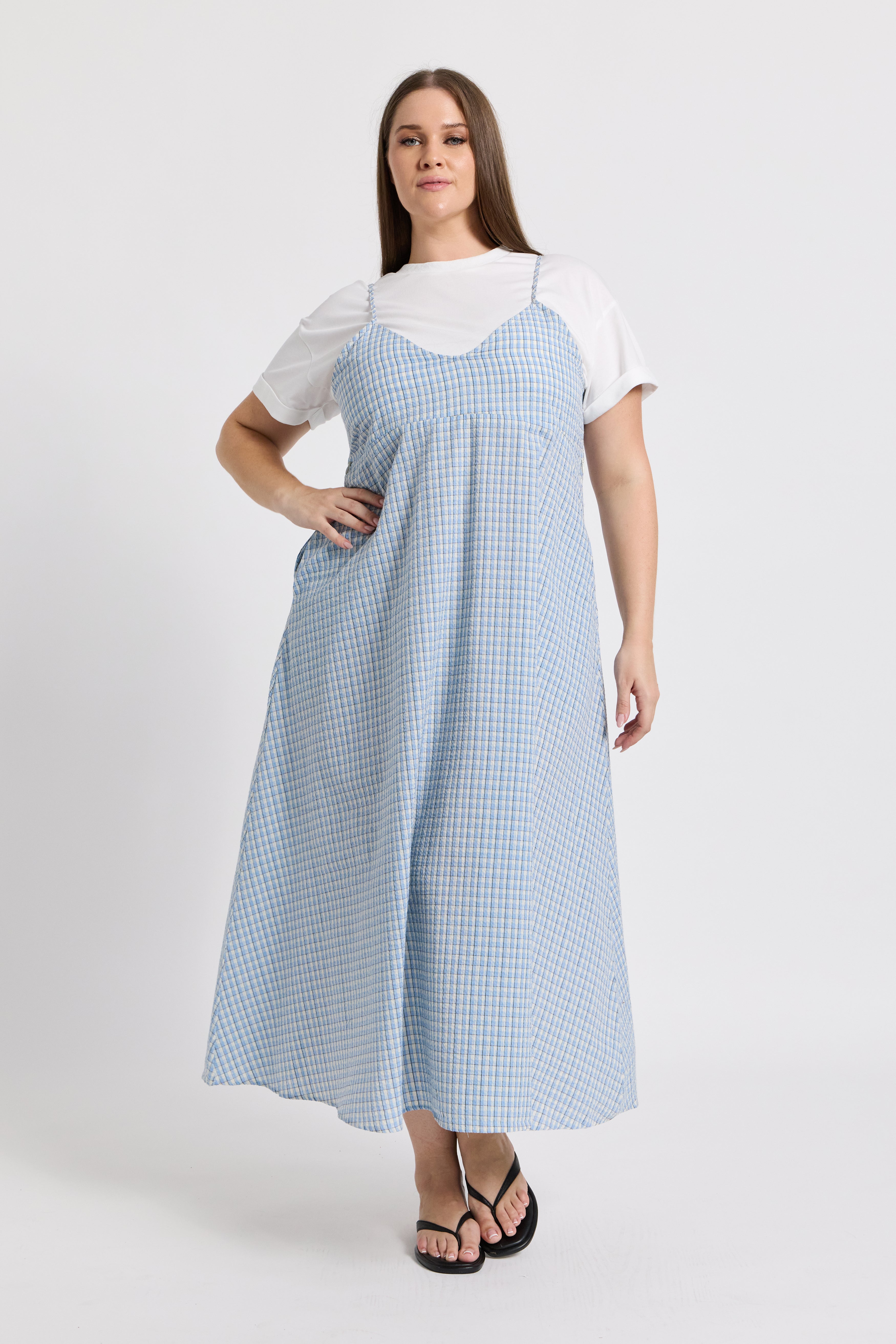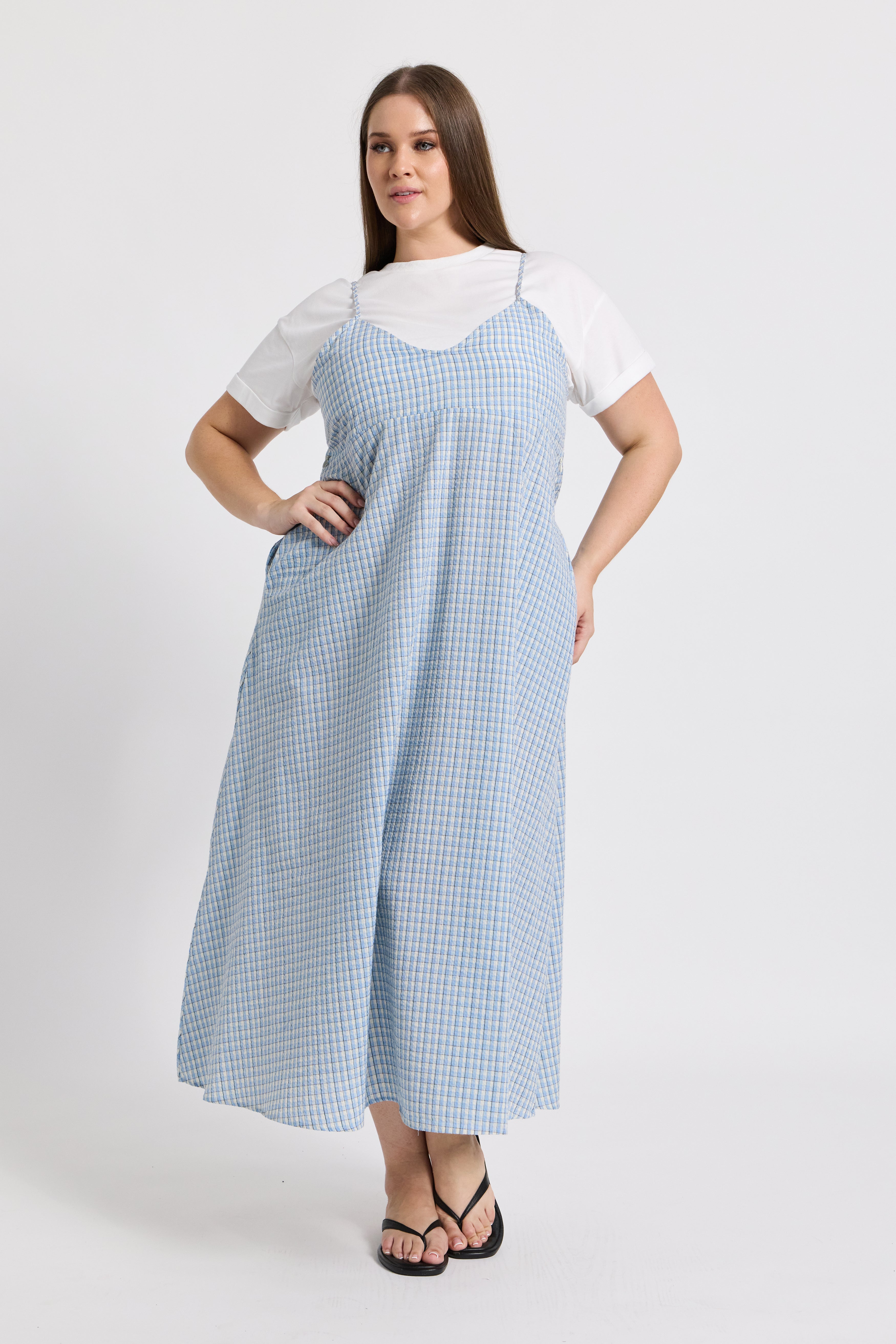 Olivia Layered Babydoll Tee Dress - White / Blue Plaid