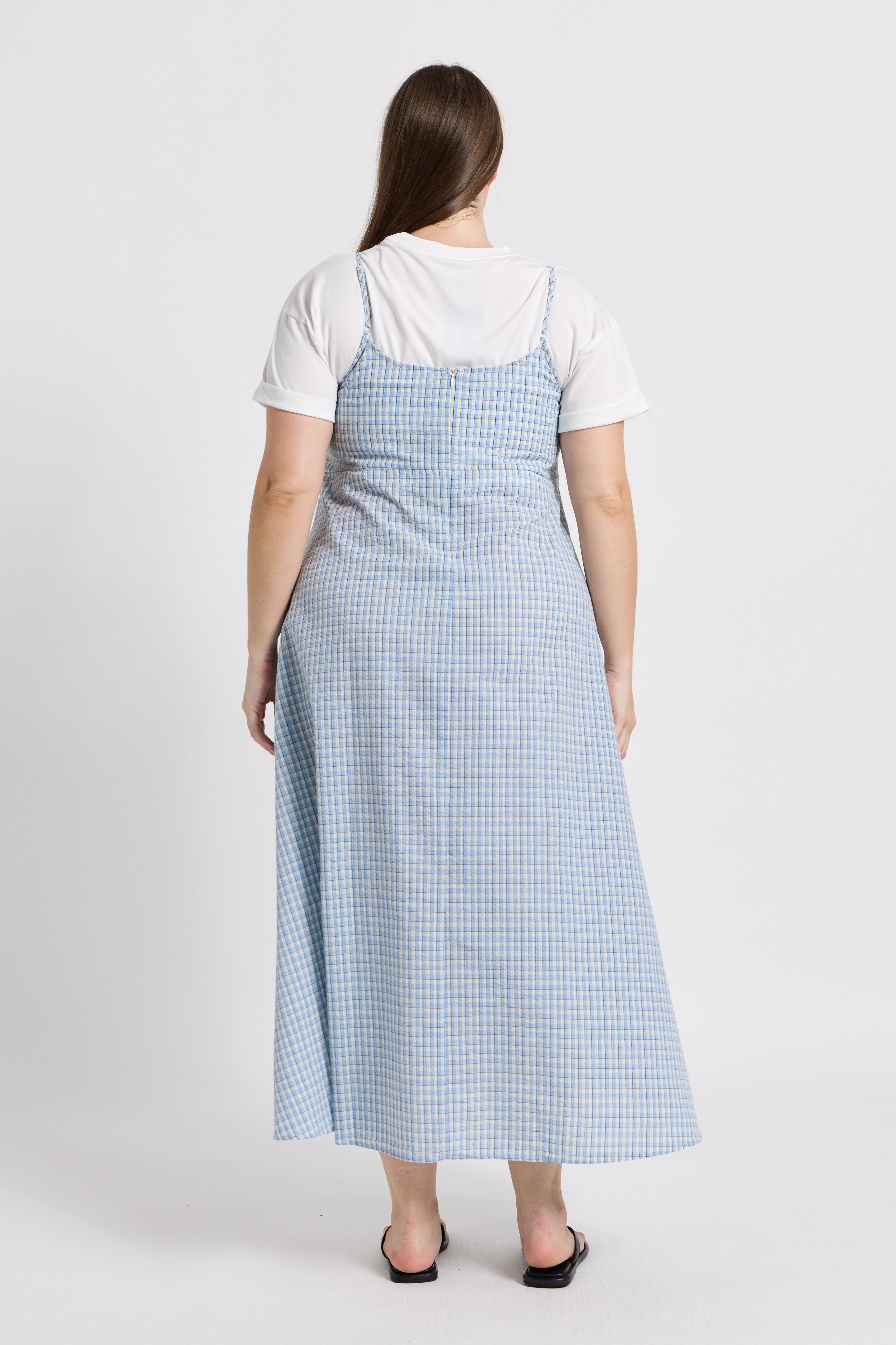 The Olivia Layered Two-Piece Babydoll Dress in White / Blue Plaid combines sweet style with functional design for a maternity-friendly, breastfeeding-ready outfit. This layered midi dress features a beautiful white and blue gingham pattern in textured, woven seersucker, offering lightweight, breathable comfort. Designed with a relaxed skirt shape, it provides a bump-friendly fit, giving you plenty of room to grow. A discreet two-way invisible zipper under the bustline allows easy breastfeeding access, while an additional invisible zipper at the back makes for effortless dressing.