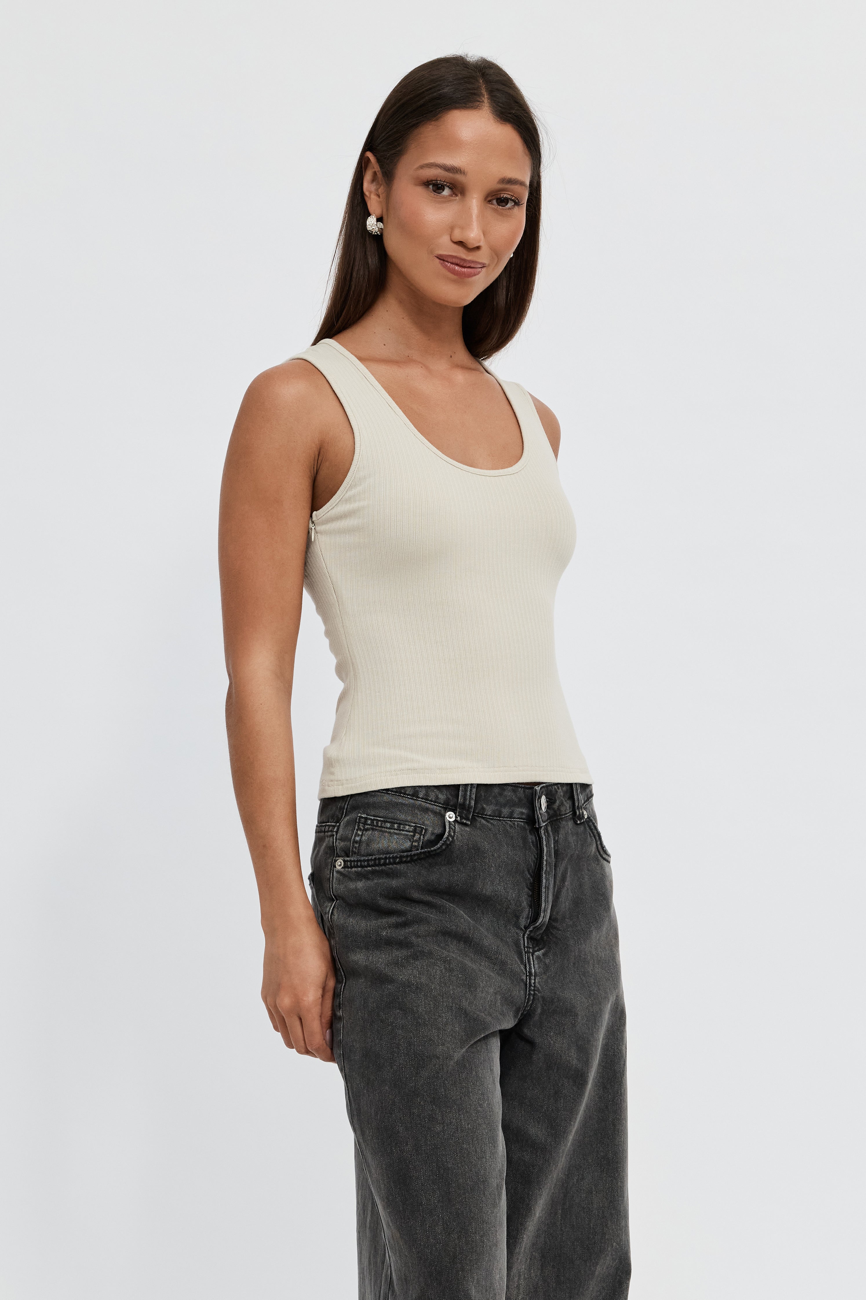 Crafted in a lightweight, ultra-stretchy ribbed jersey, this semi-cropped tank offers a flattering fit that finishes just above the hips. Its reversible design gives you two neckline options, a lower scoop or a shallow round neckline, so that you can style it your way.