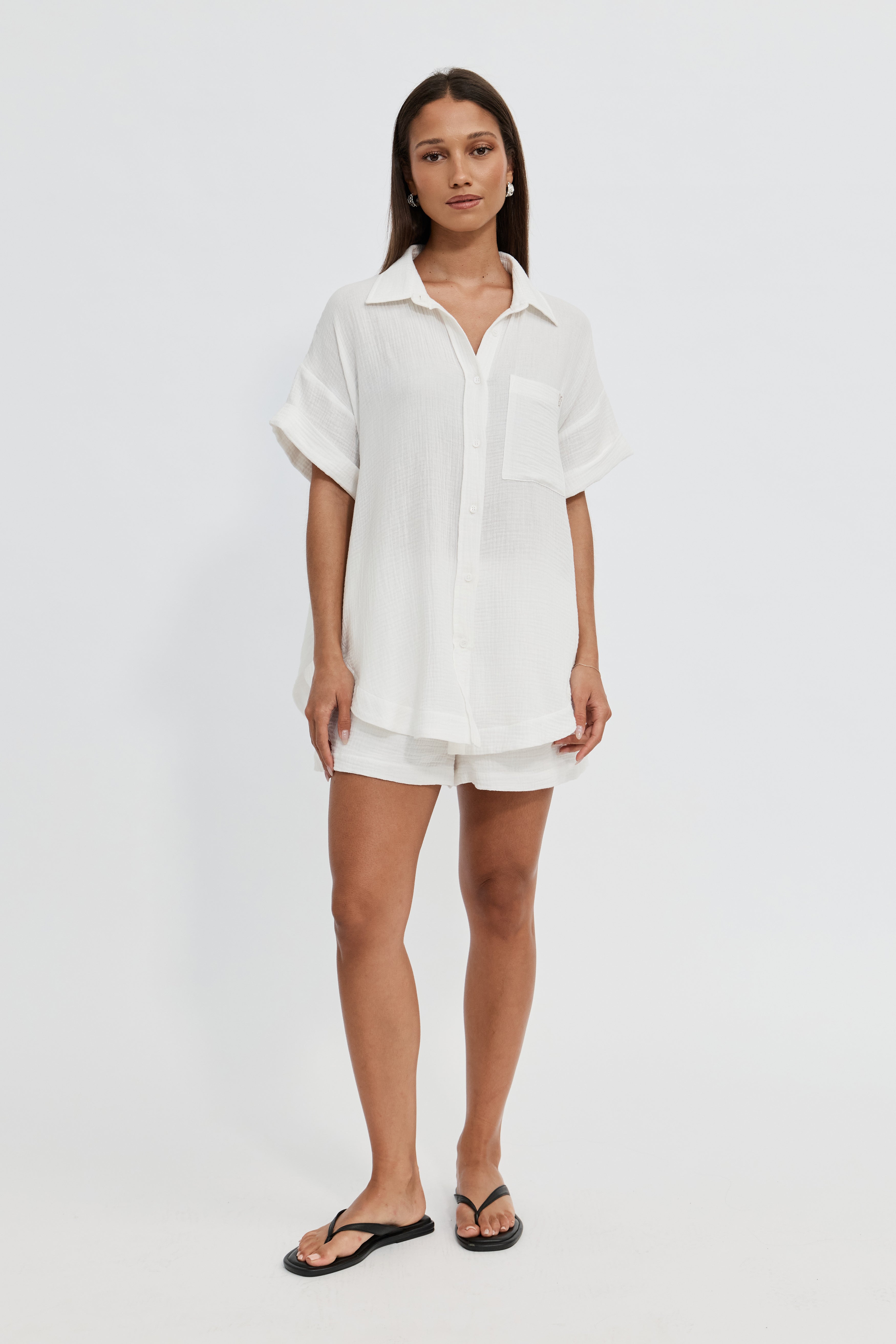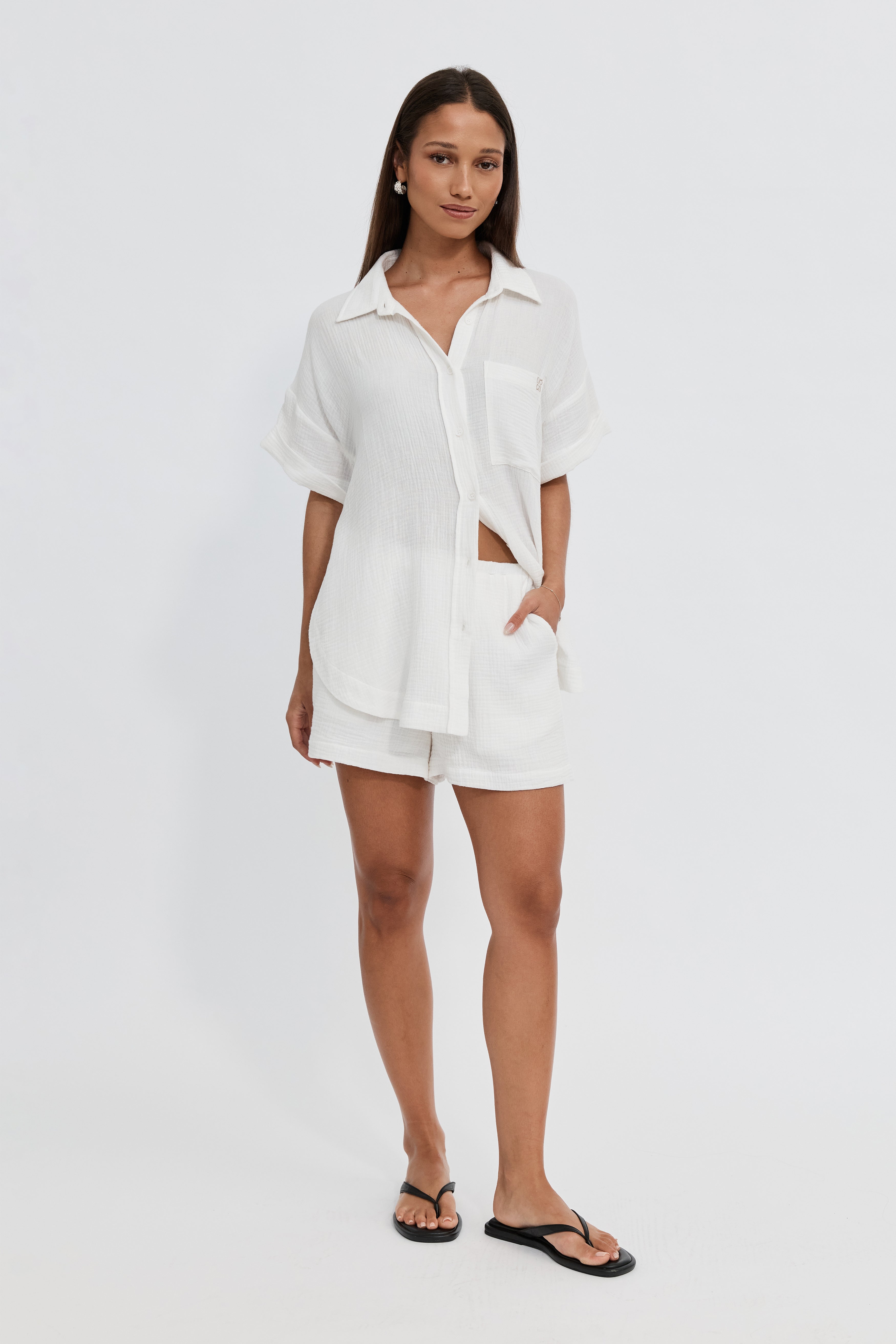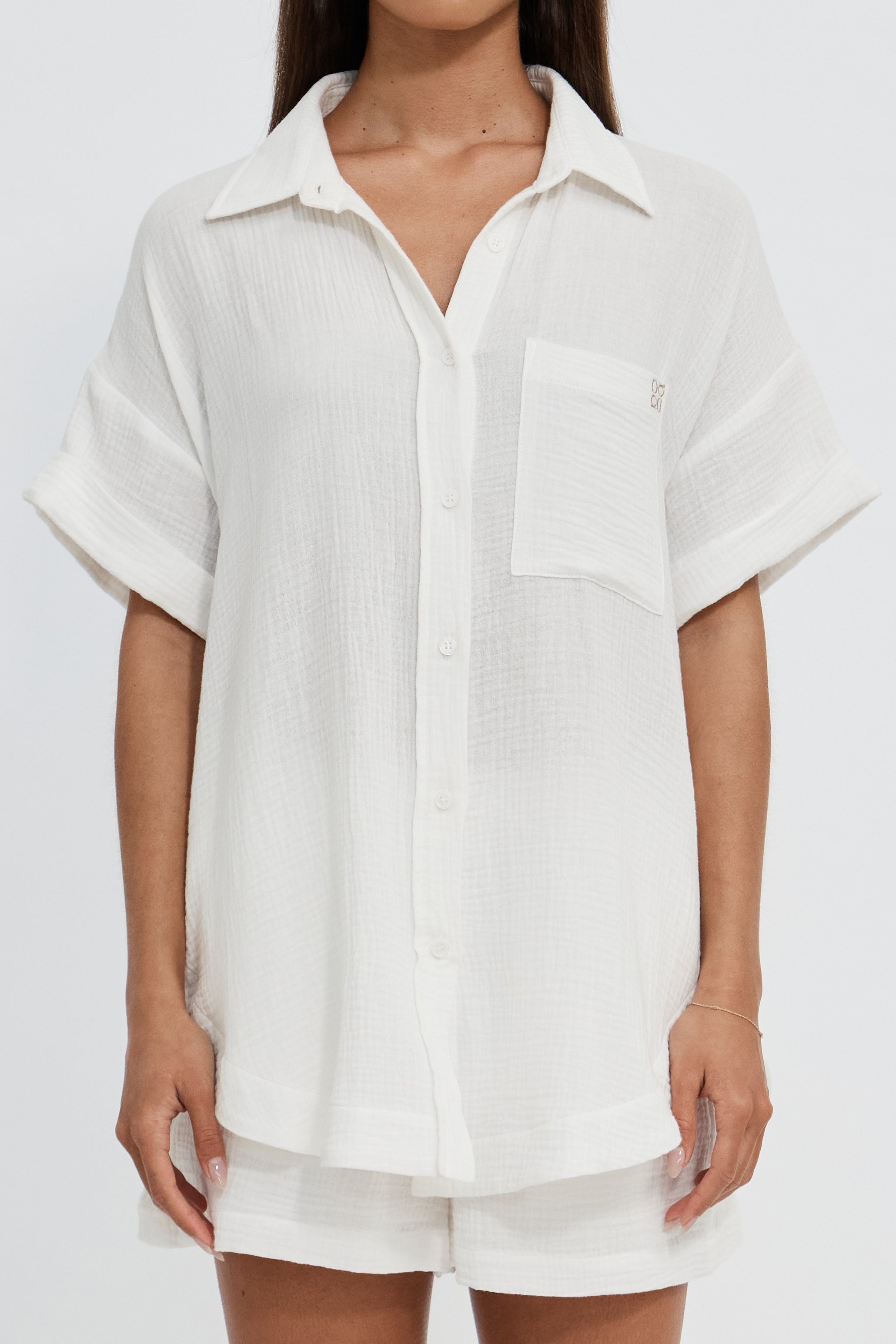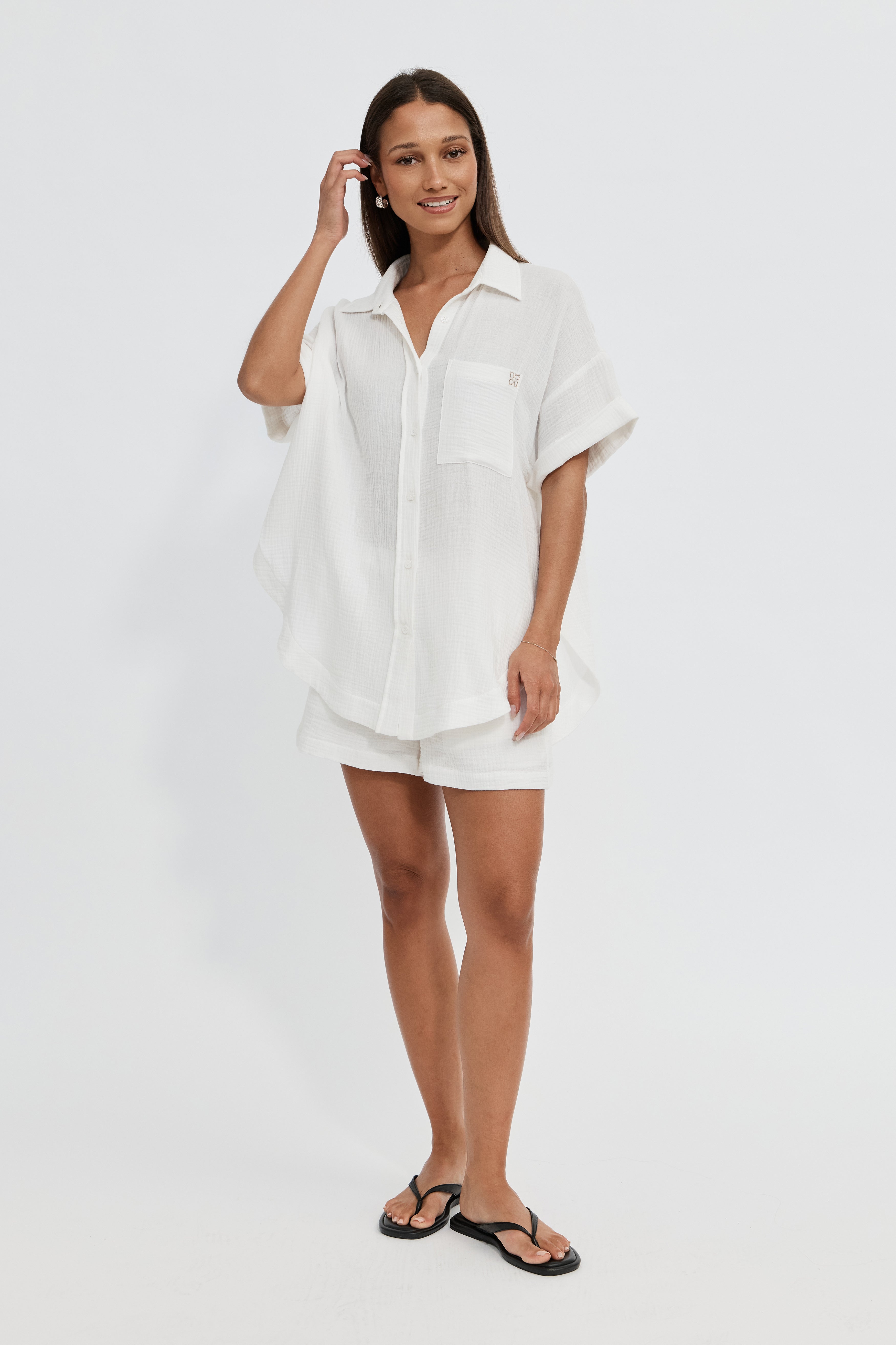 Perfect paired with the matching shorts, styled with a skirt, or thrown over swimwear, it’s an elevated yet effortless everyday shirt you’ll find yourself reaching for again and again.