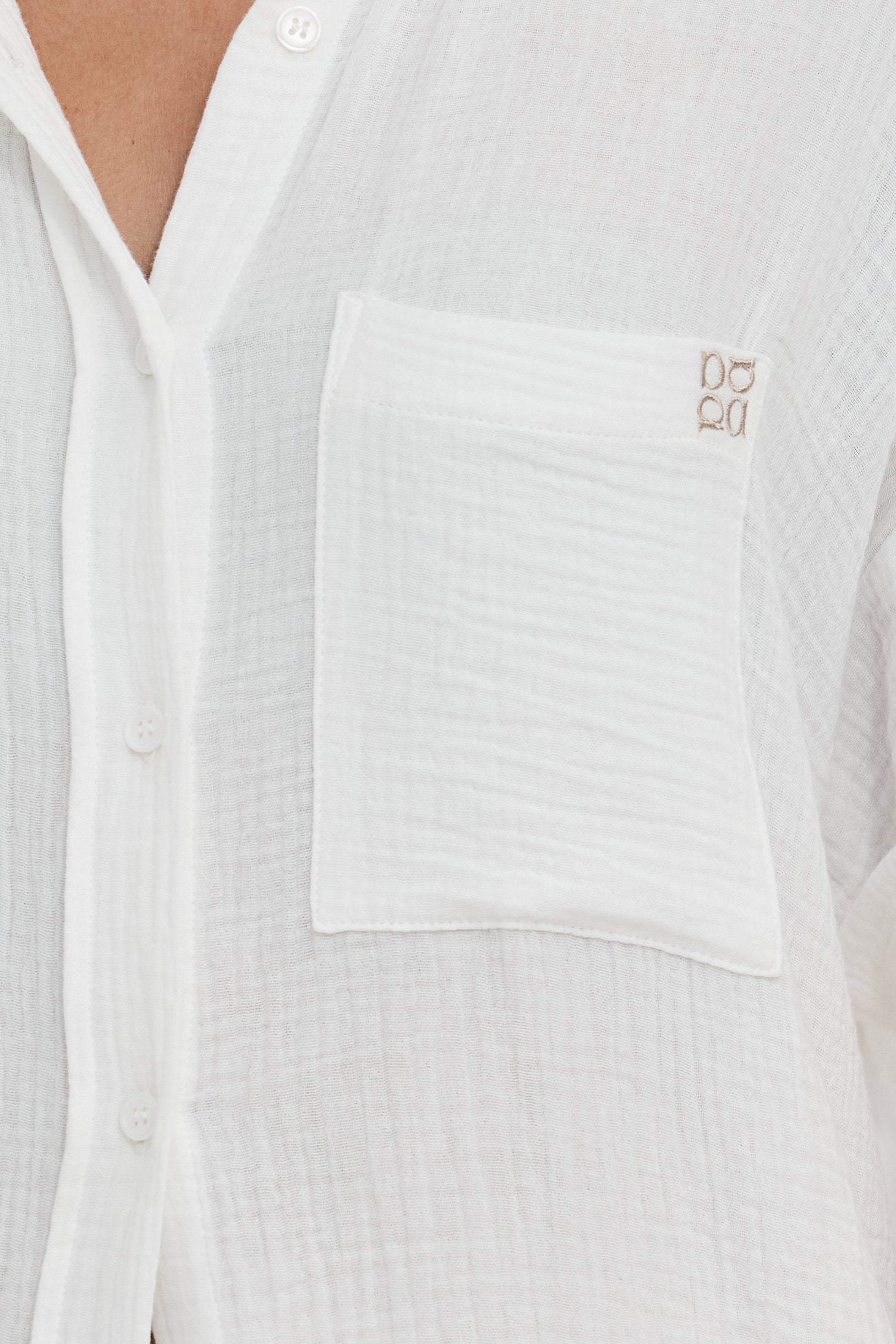 Featuring a relaxed fit and short rolled sleeves, this shirt offers effortless style and all-day comfort. Crafted from lightweight, semi-sheer fabric, it includes curved wrap sides that provide easy breastfeeding access, a front patch pocket finished with Apéro monogram embroidery and traditional shirting collar for a classic touch.