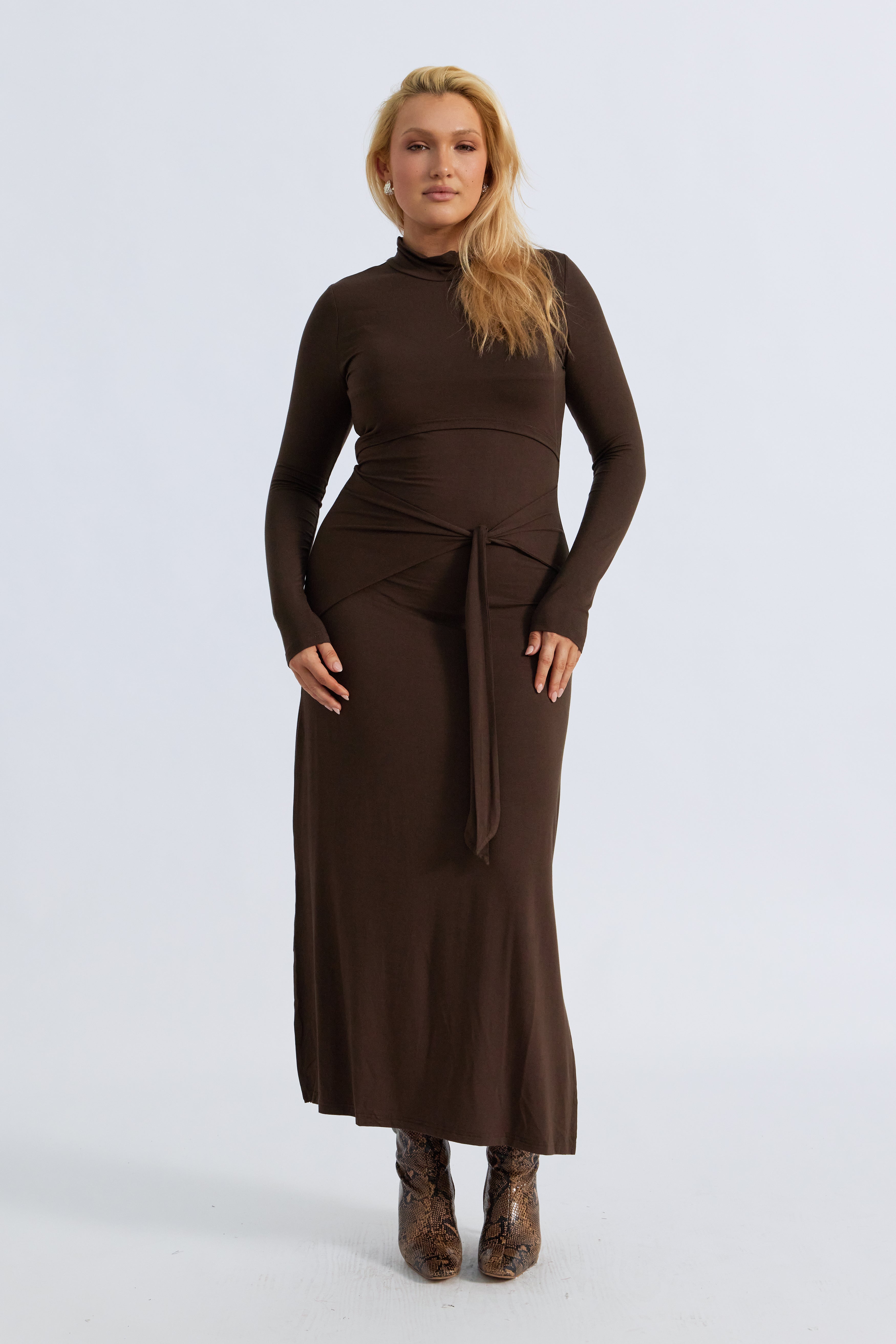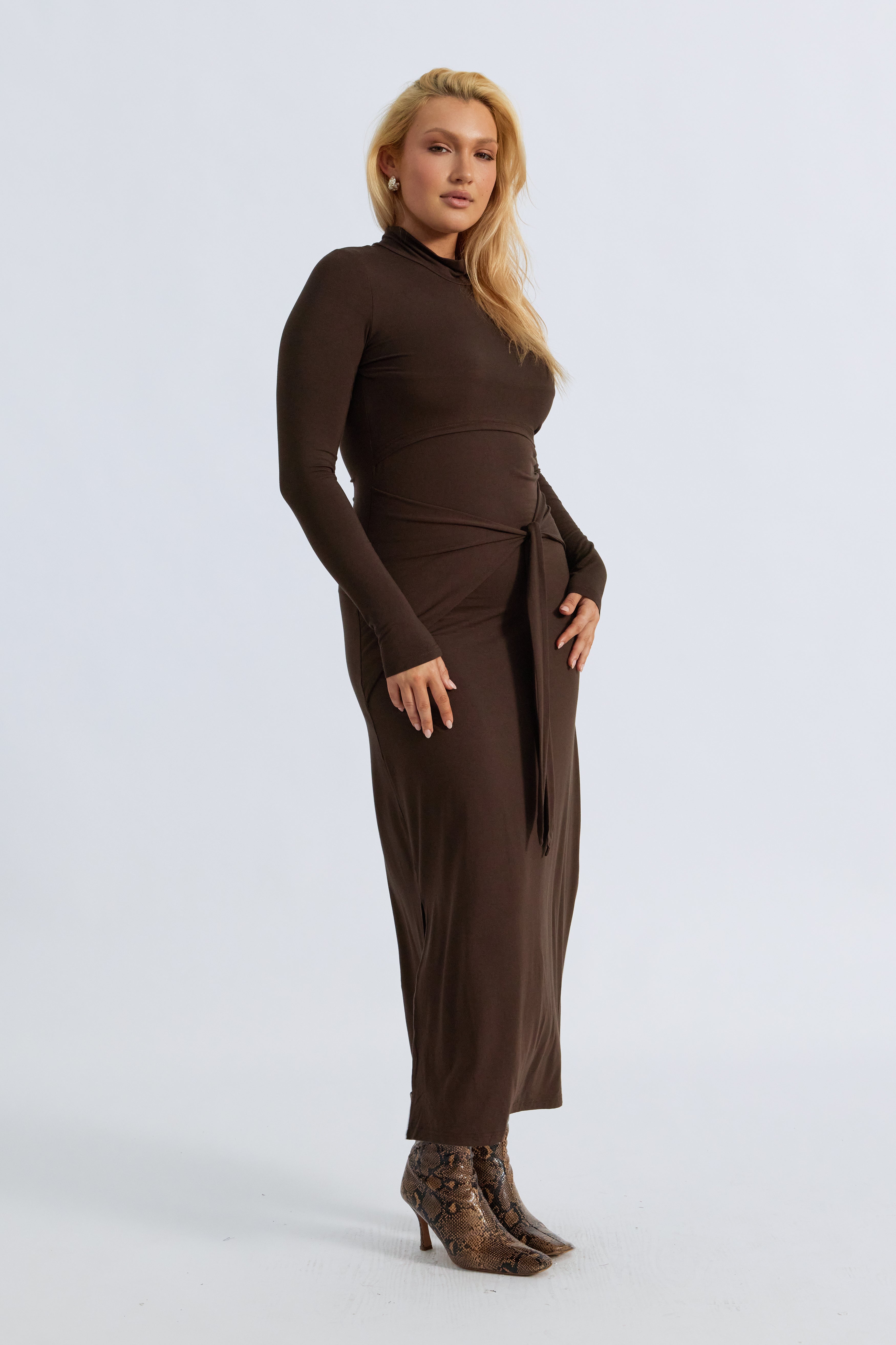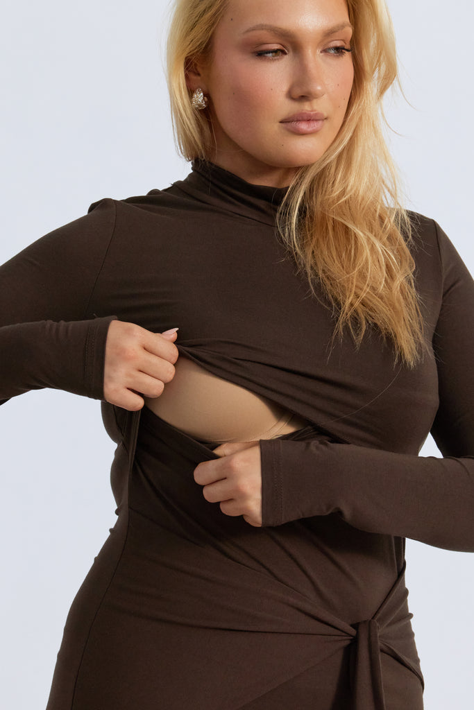 Go from day to night with the Serina Long Sleeve Tie-Front Midi Dress in Chocolate Brown—a sleek, thoughtfully designed piece that moves with you through every stage of motherhood. Crafted from a soft, stretchy jersey, this dress is both bump-friendly and breastfeeding-accessible, featuring discreet overlapping bust panels for effortless nursing access.