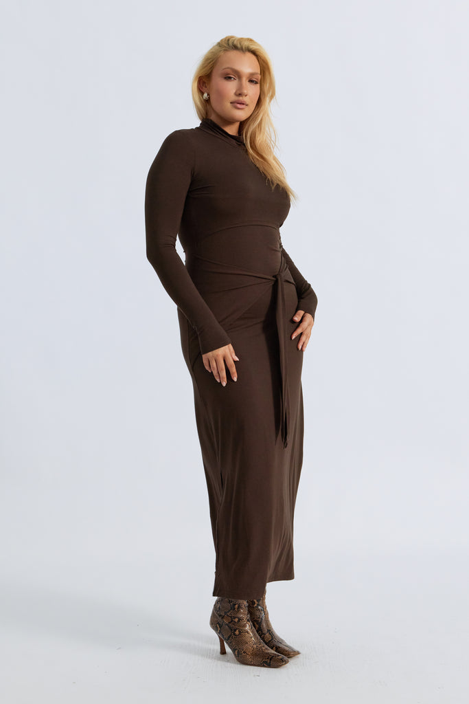 Serina Long Sleeve Tie-Front Midi Dress - Chocolate