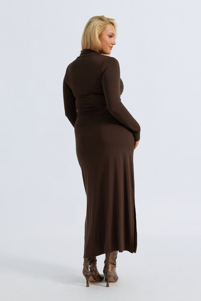 The fitted bodice flows into a straight-cut, midi-length skirt, while asymmetric tie panels at the waist allow you to customise the shape and add a subtle design twist. Complete with a soft turtle neckline, long fitted sleeves, and knee-high side splits for ease of movement, Serina blends modern sophistication with functionality.