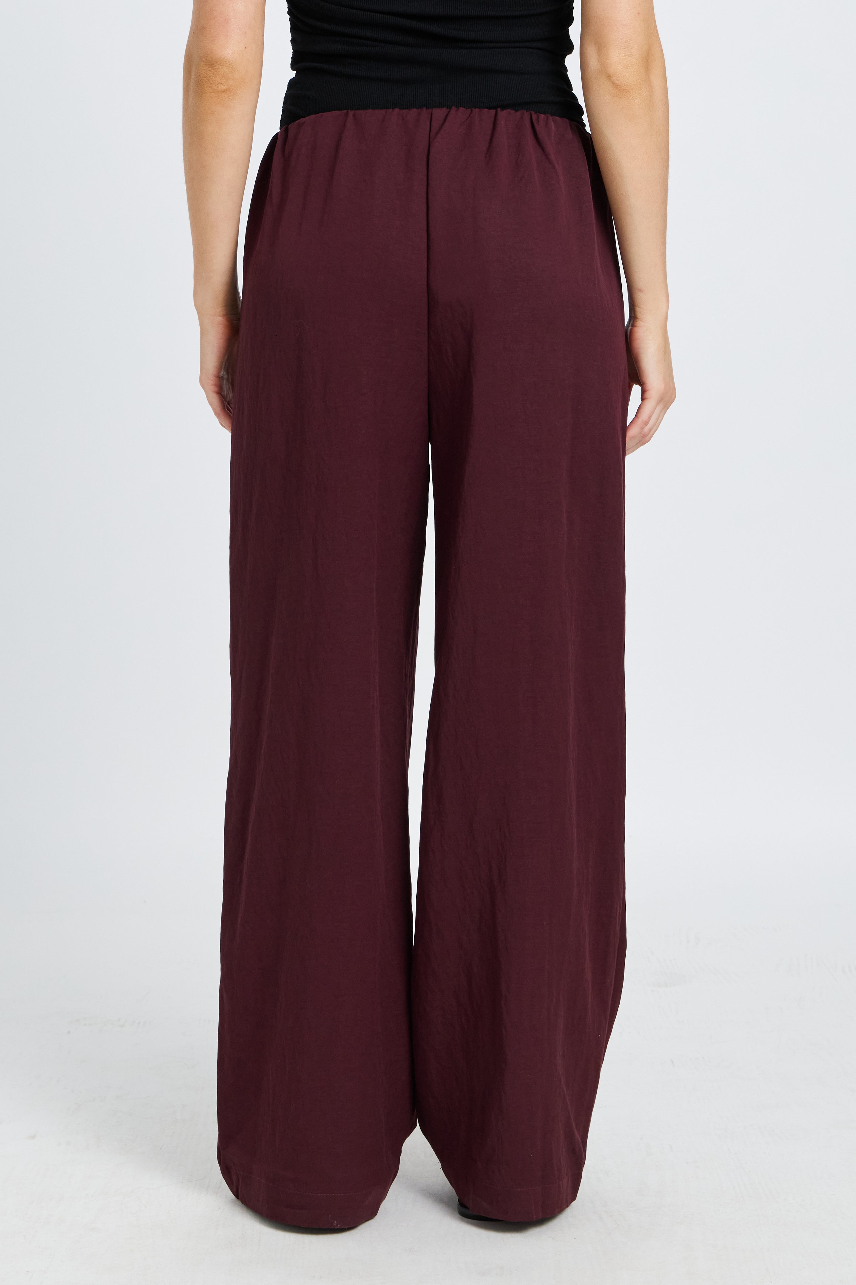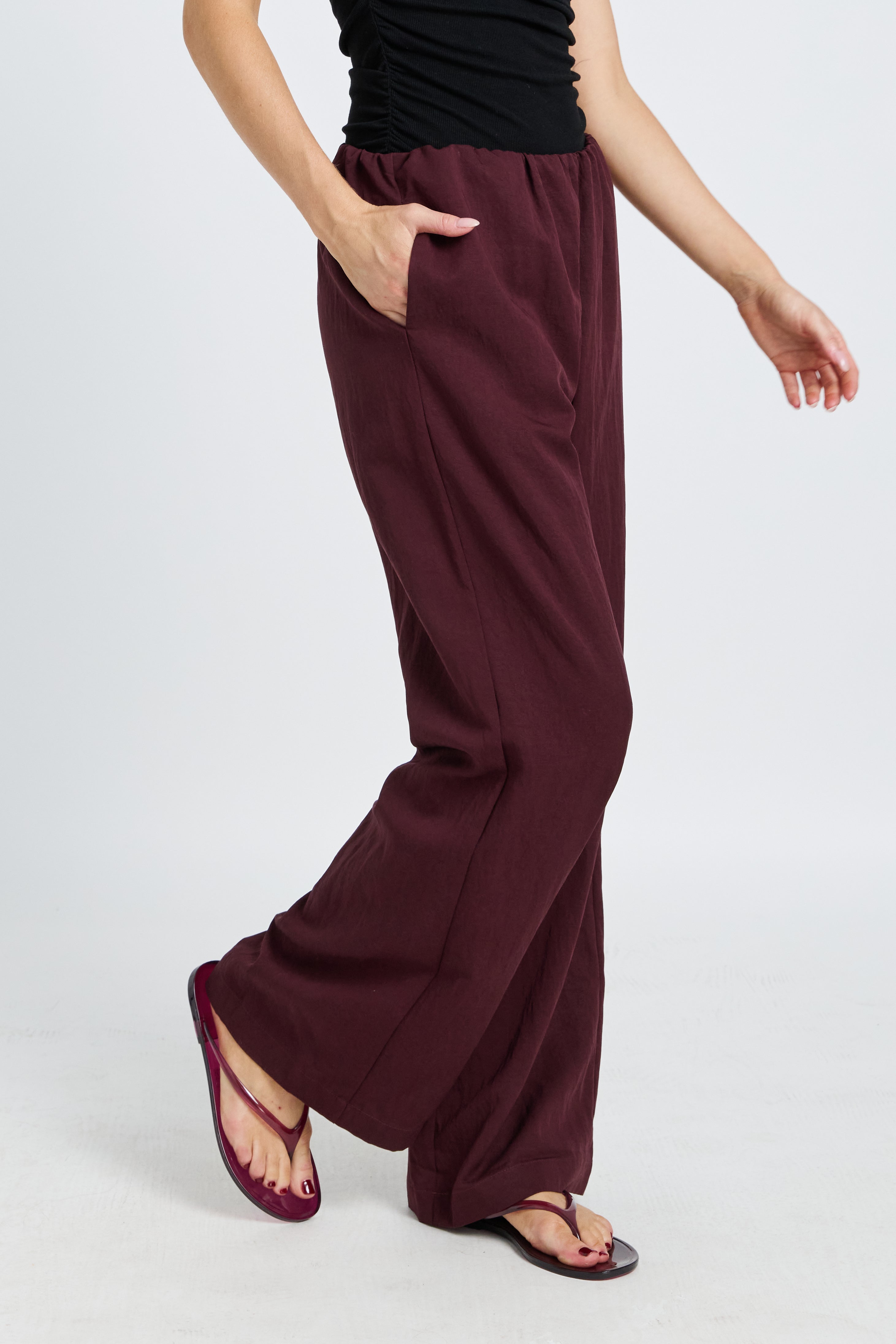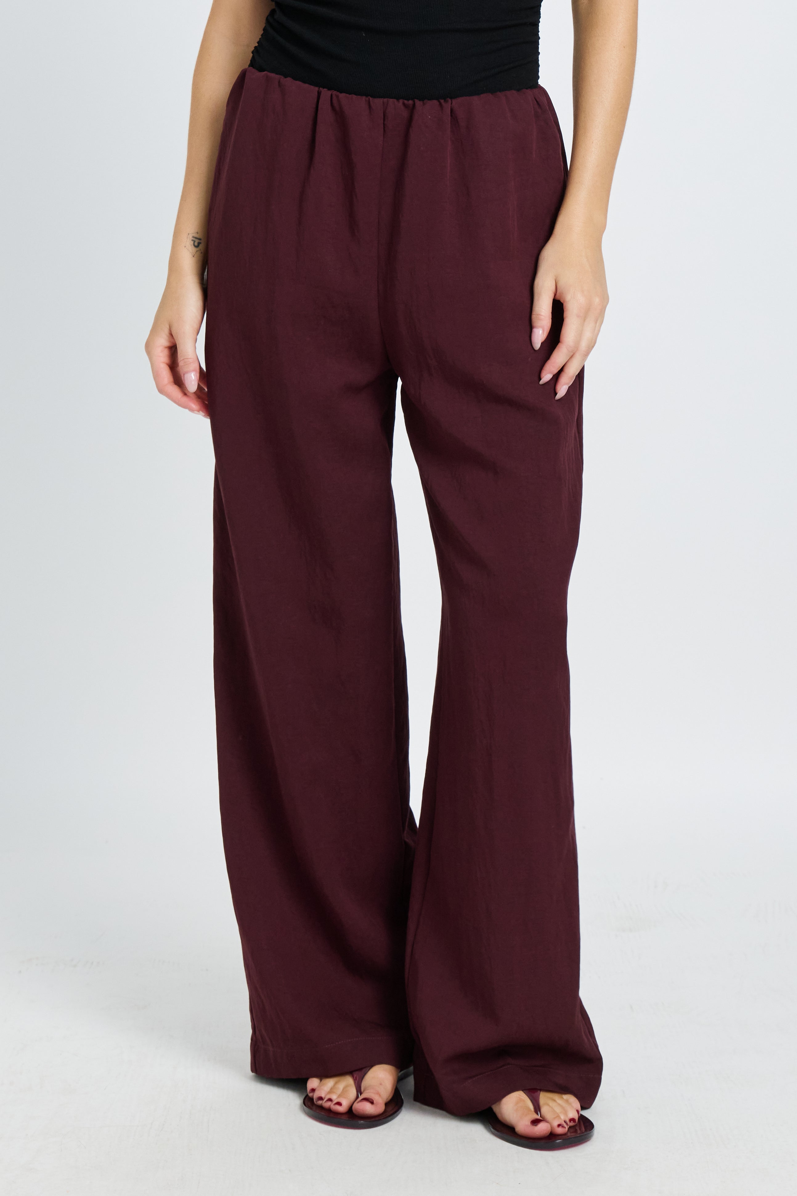 Crafted from a mid-weight woven tencel fabric in a rich mahogany hue, these pants offer a structured yet breathable feel. The wide-leg silhouette flows effortlessly through the leg for a relaxed, elevated look, while hidden side seam pockets add practical functionality without compromising the clean finish.