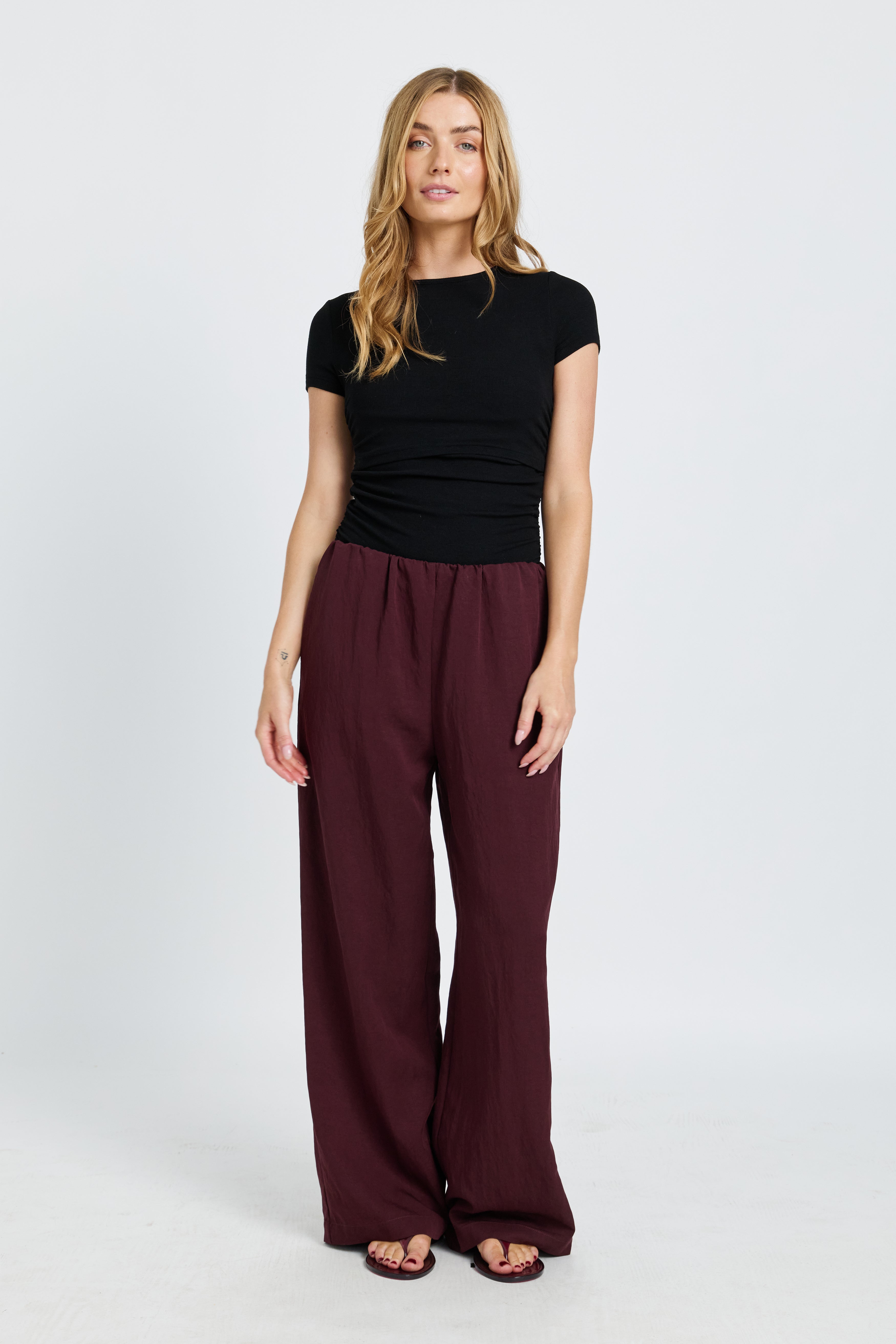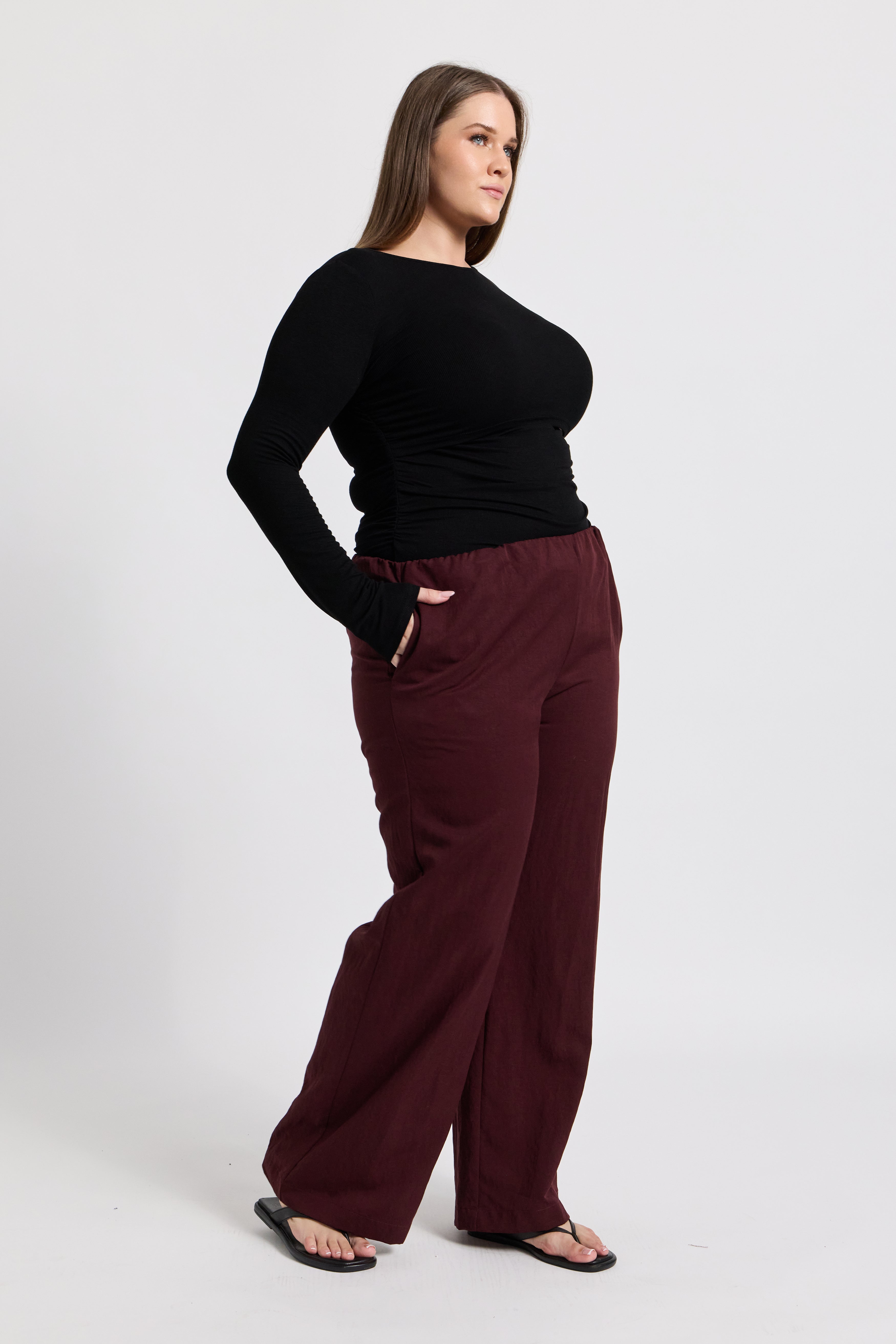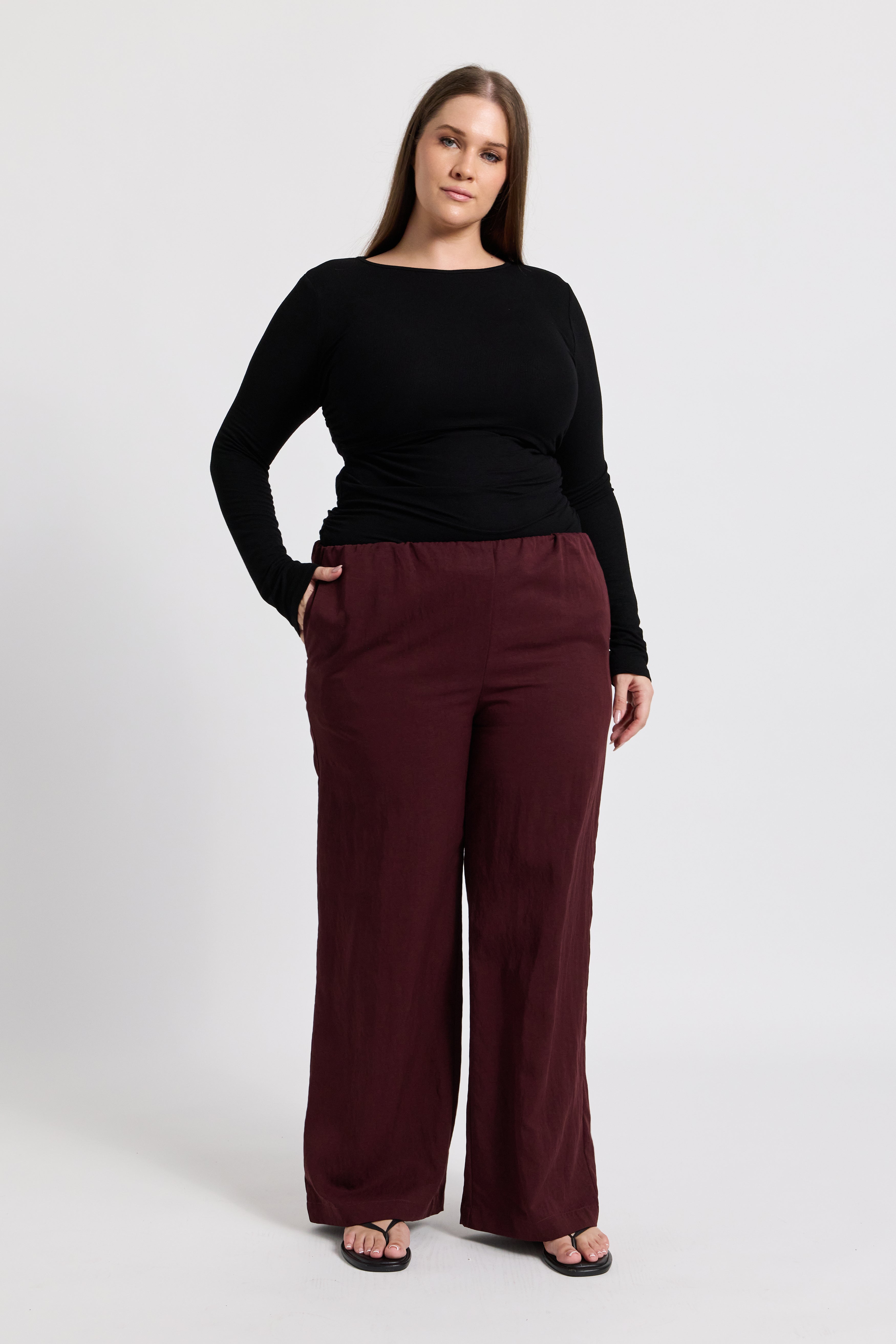 Crafted from a mid-weight woven tencel fabric in a rich mahogany hue, these pants offer a structured yet breathable feel. The wide-leg silhouette flows effortlessly through the leg for a relaxed, elevated look, while hidden side seam pockets add practical functionality without compromising the clean finish.