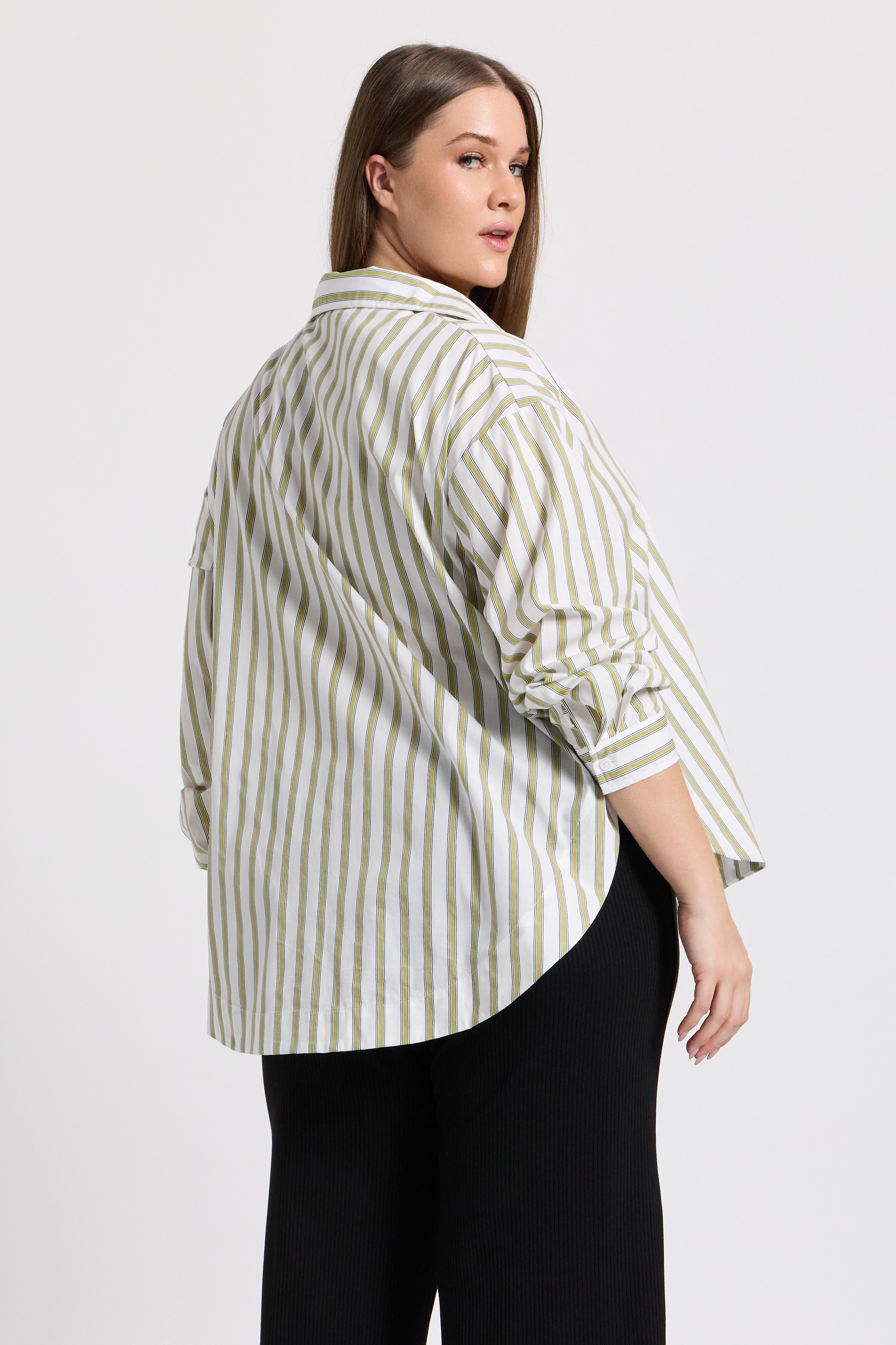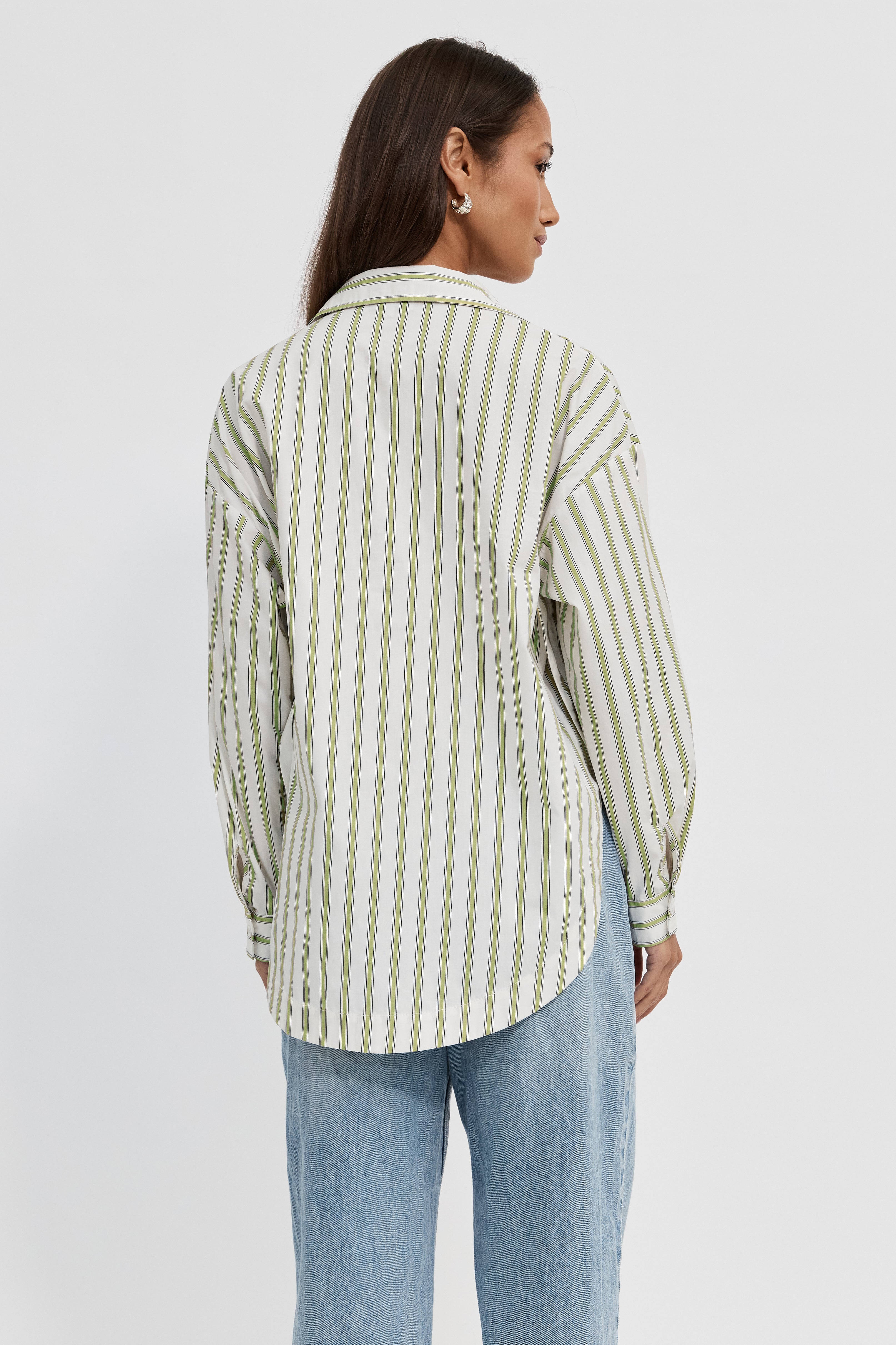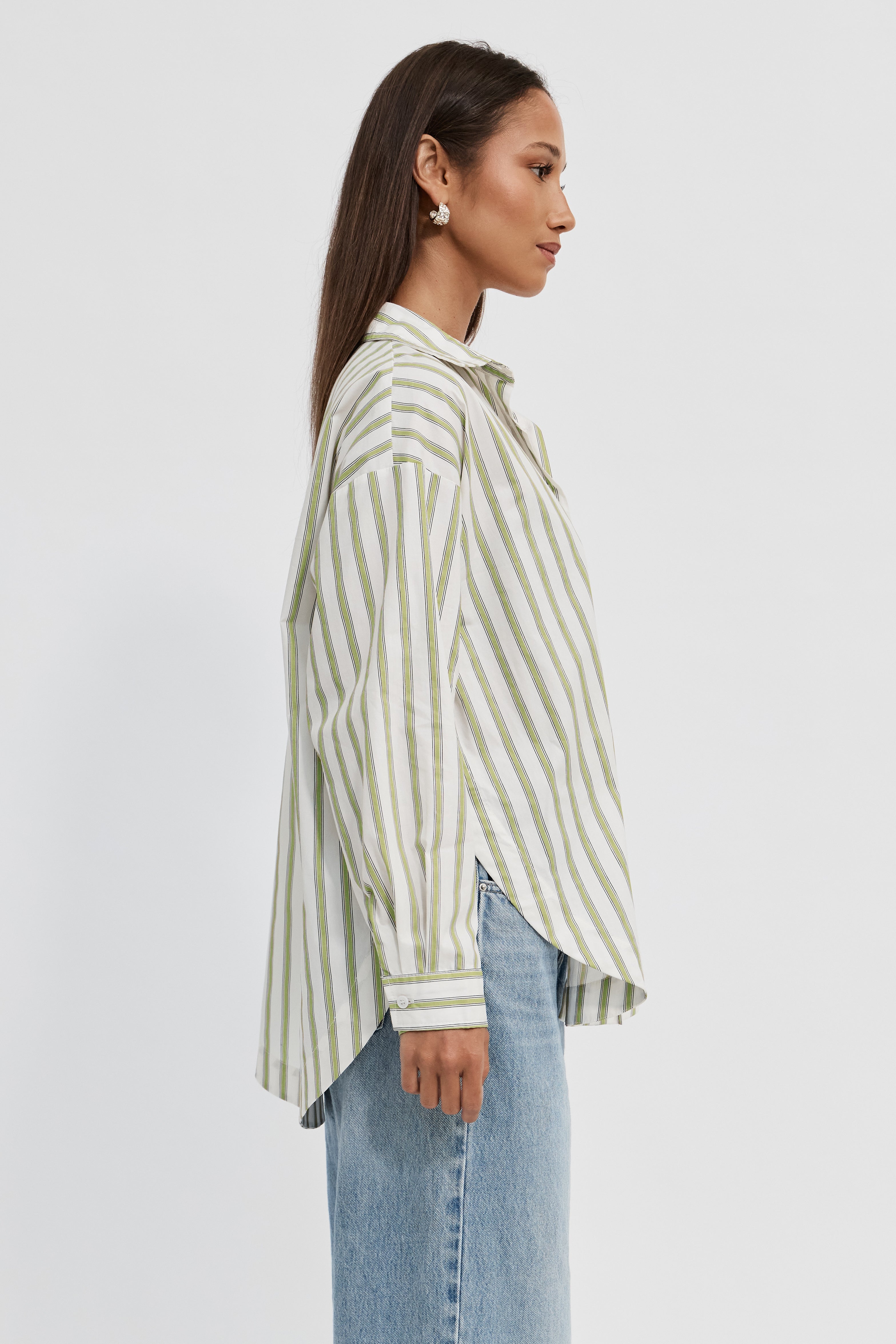 Made from durable cotton-blend poplin with a green and white stripe, it boasts a flattering curved hem, pointed collar, button-down front, and adjustable cuffs for timeless appeal. A functional patch pocket adds practicality, while its versatile design pairs effortlessly with jeans, or tailored pants for a polished look.