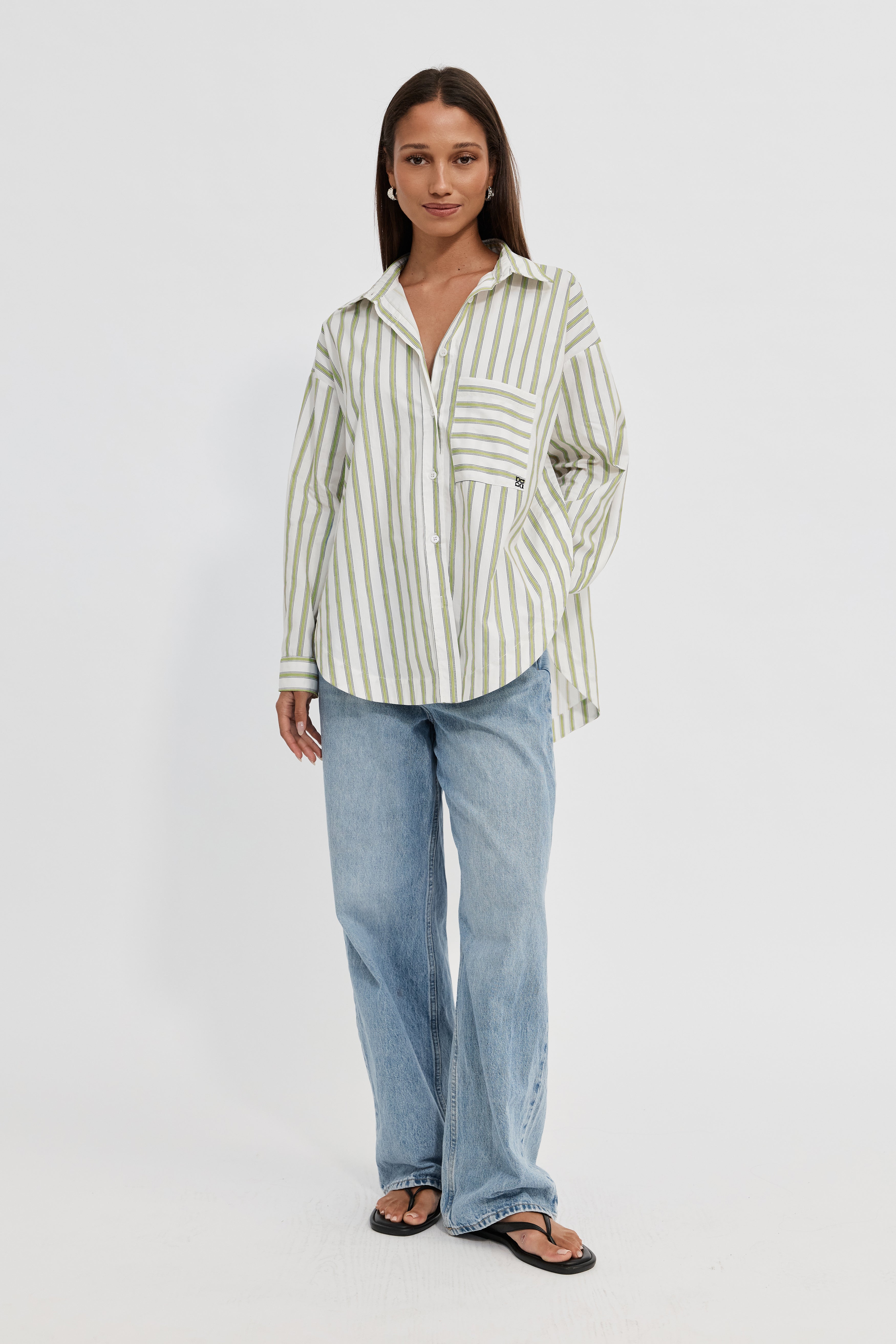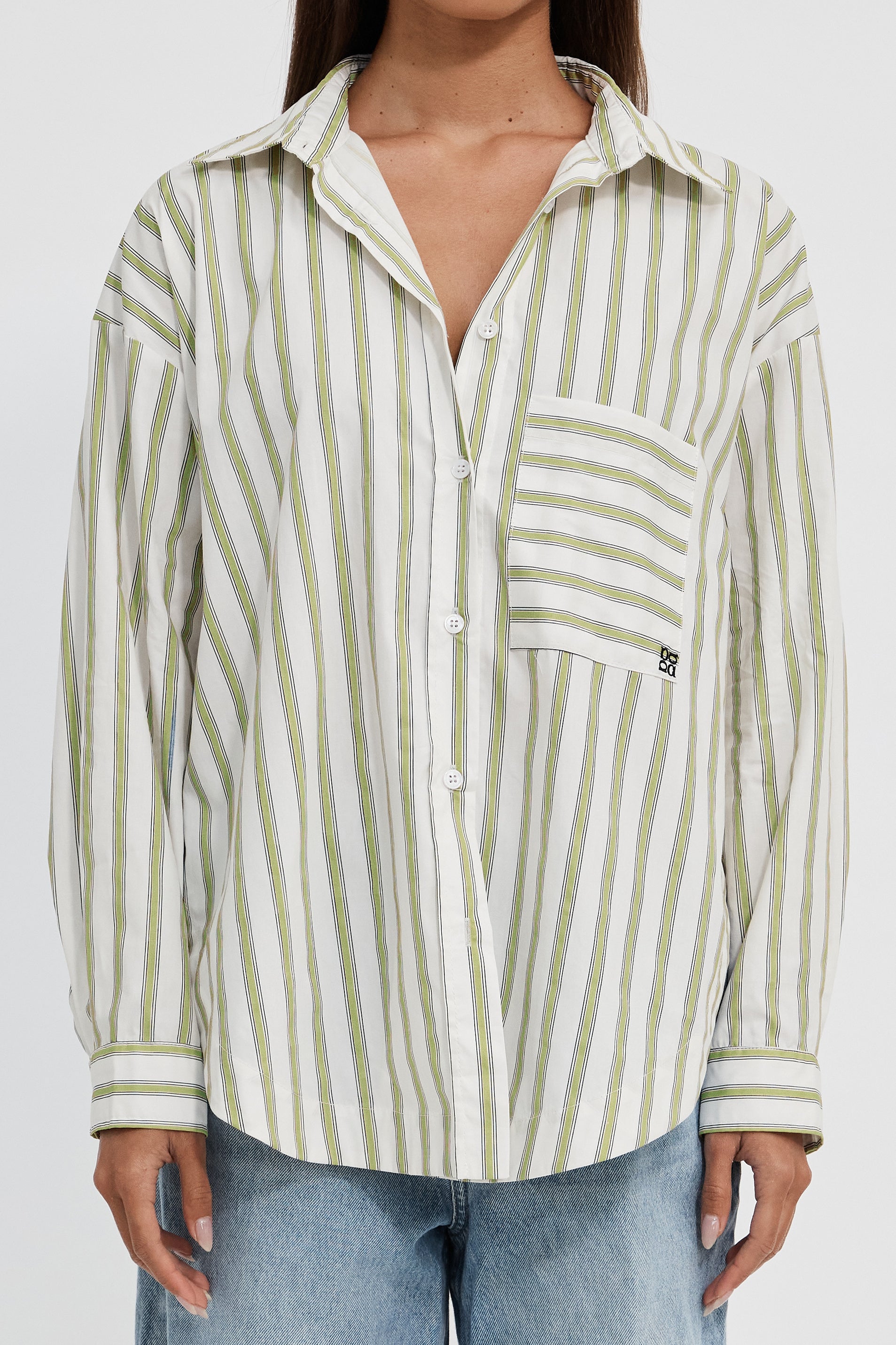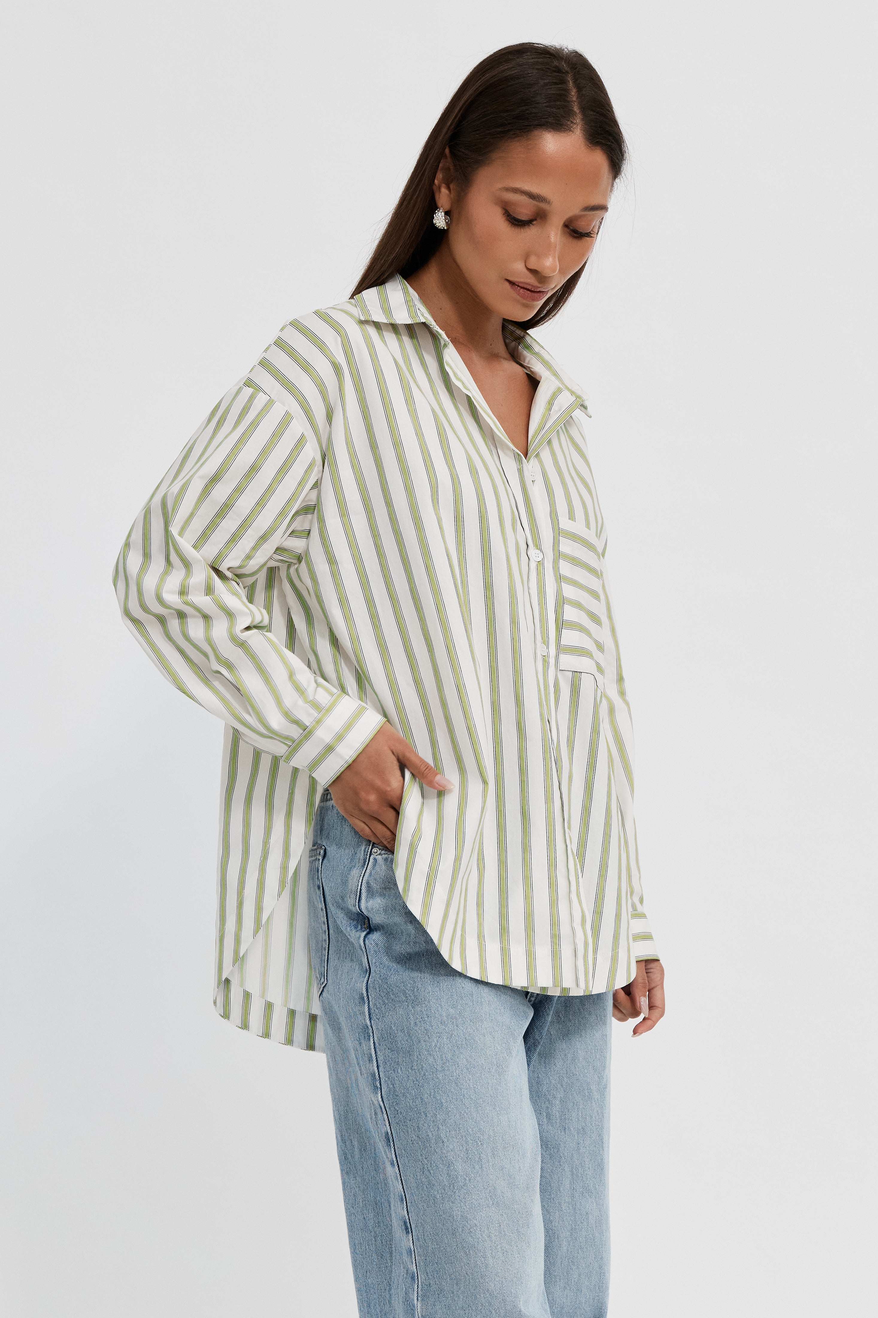 Made from durable cotton-blend poplin with a green and white stripe, it boasts a flattering curved hem, pointed collar, button-down front, and adjustable cuffs for timeless appeal. A functional patch pocket adds practicality, while its versatile design pairs effortlessly with jeans, or tailored pants for a polished look.