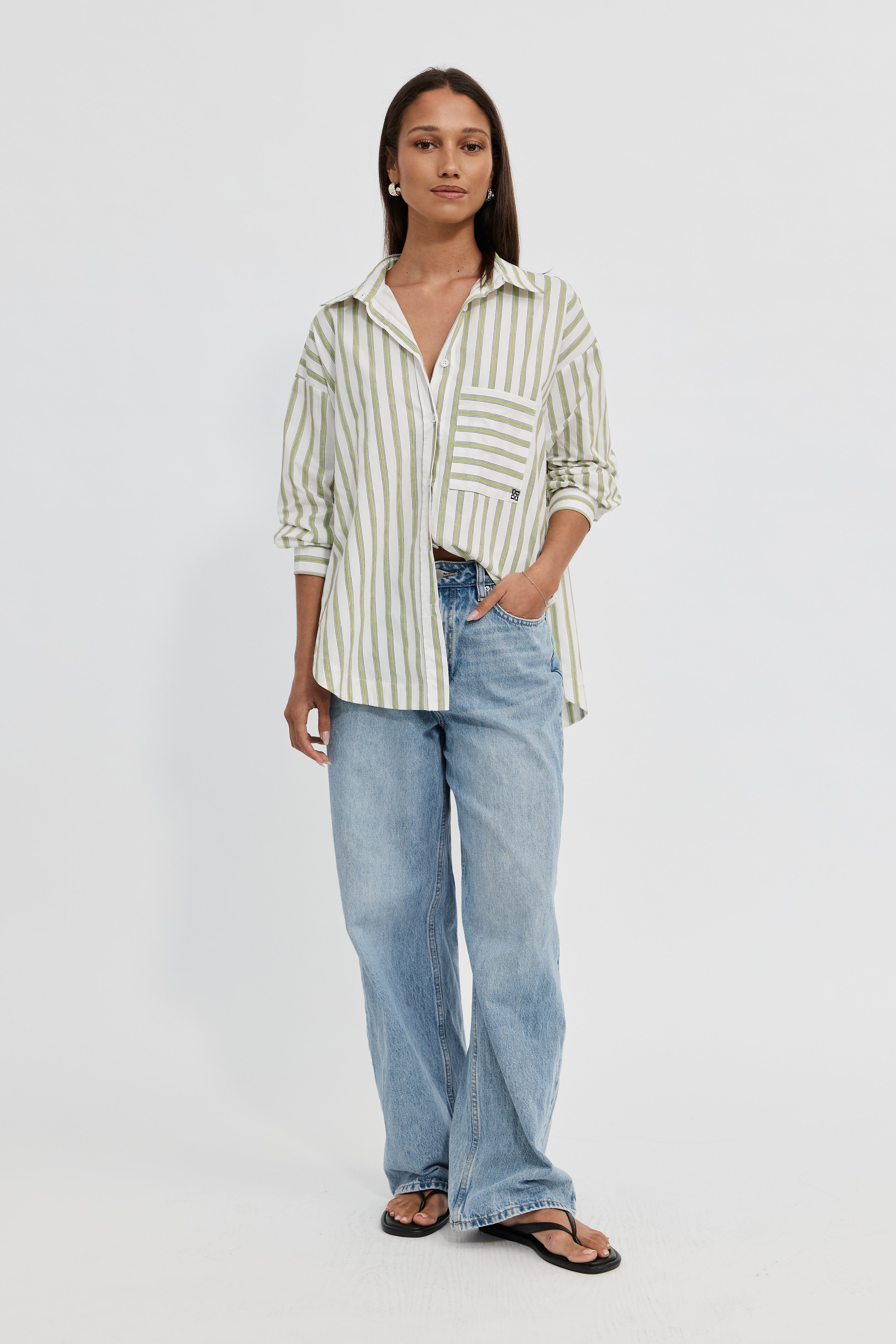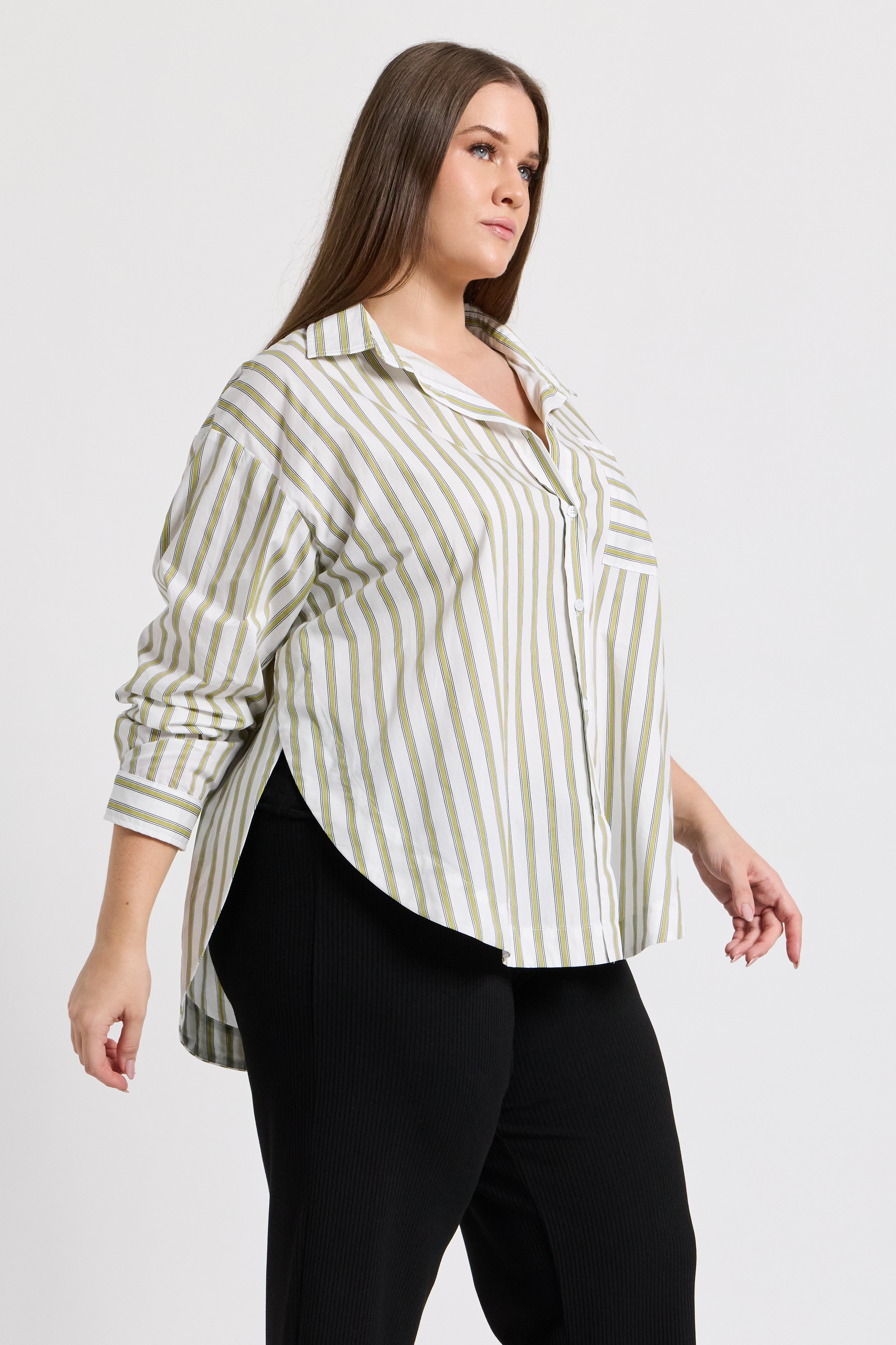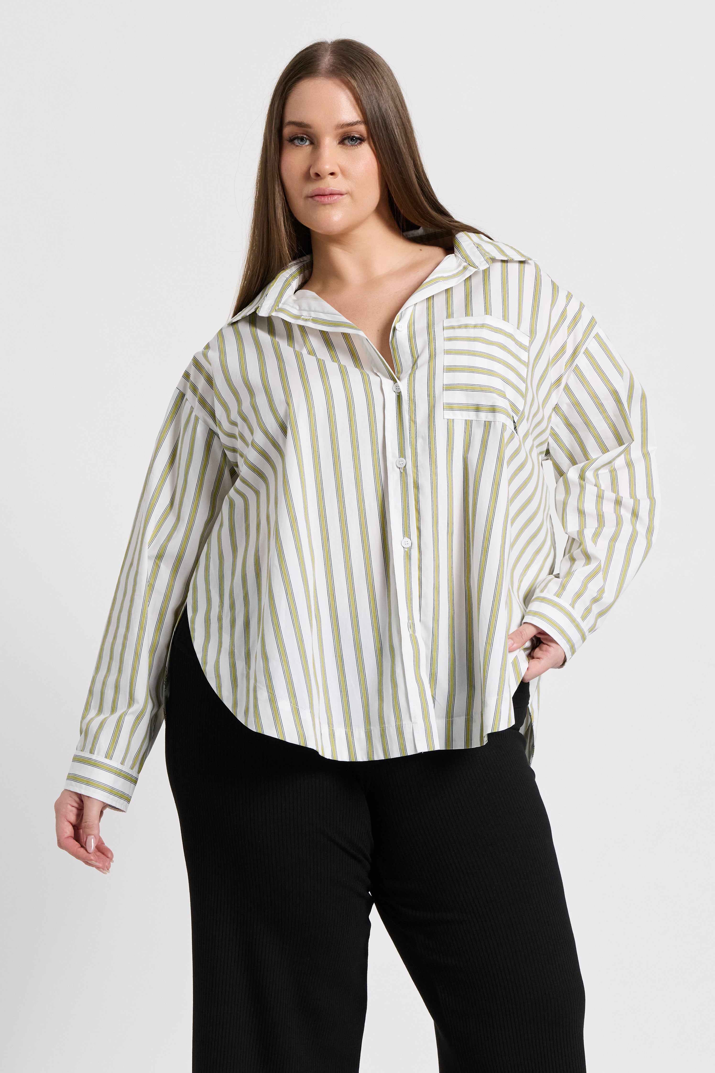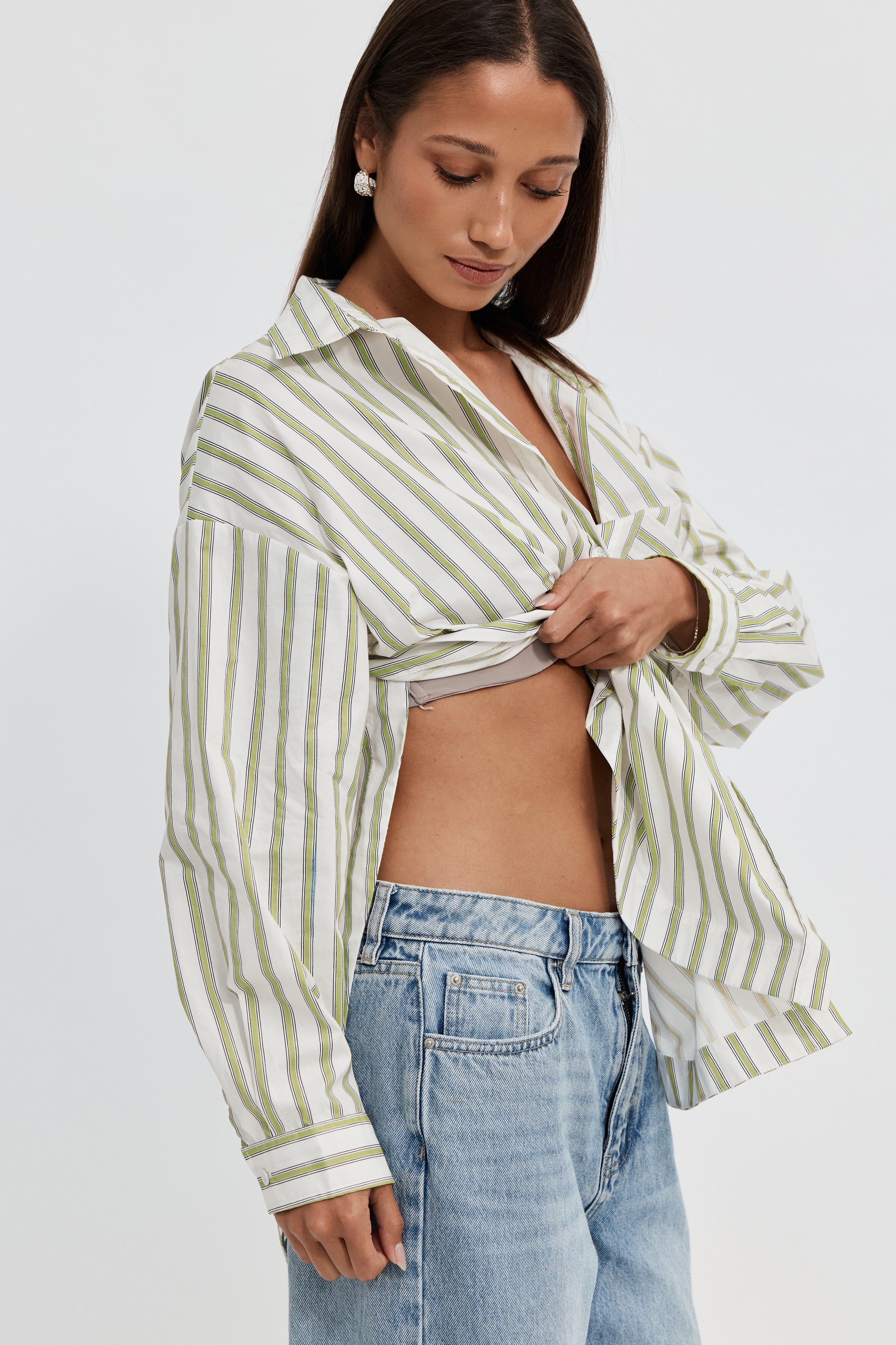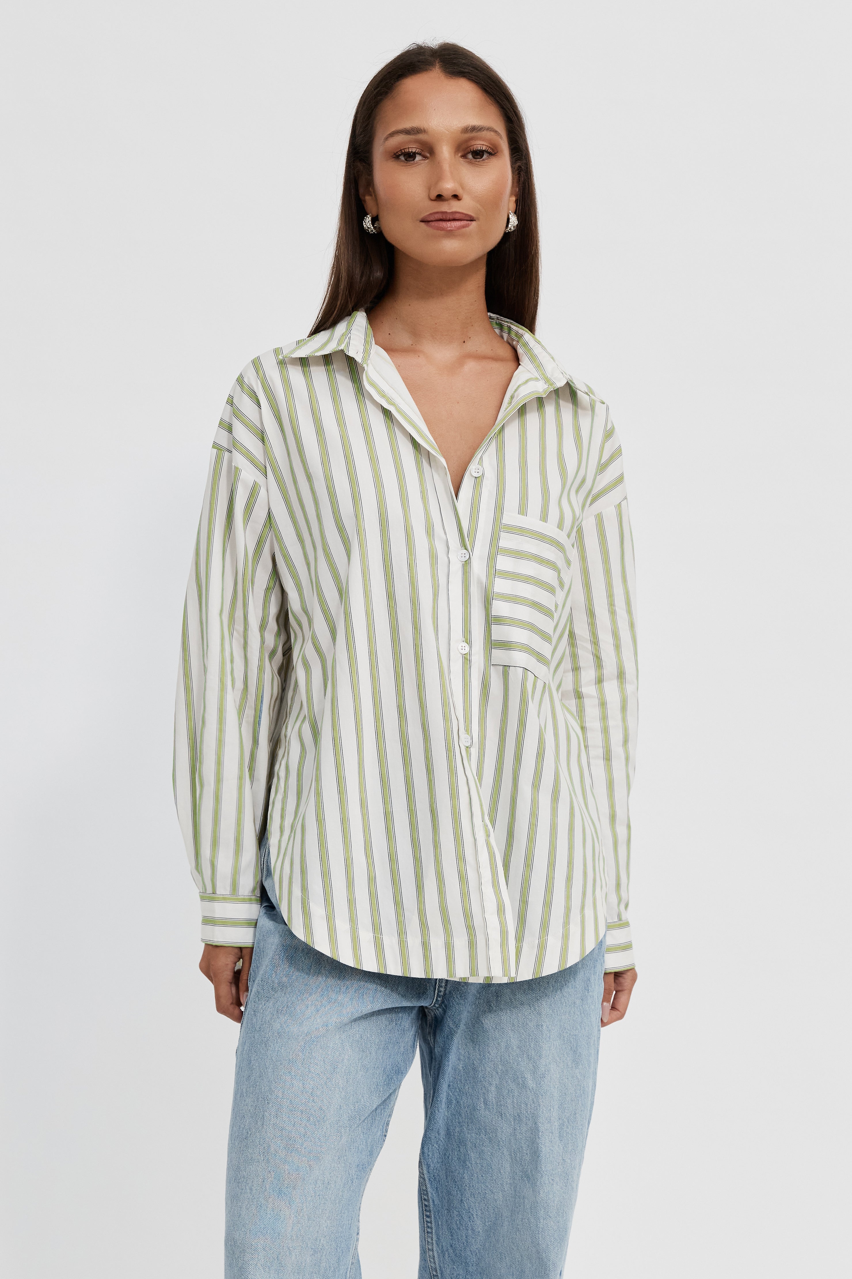 Morgan Stripe Wrap Button-Down Shirt - White / Green