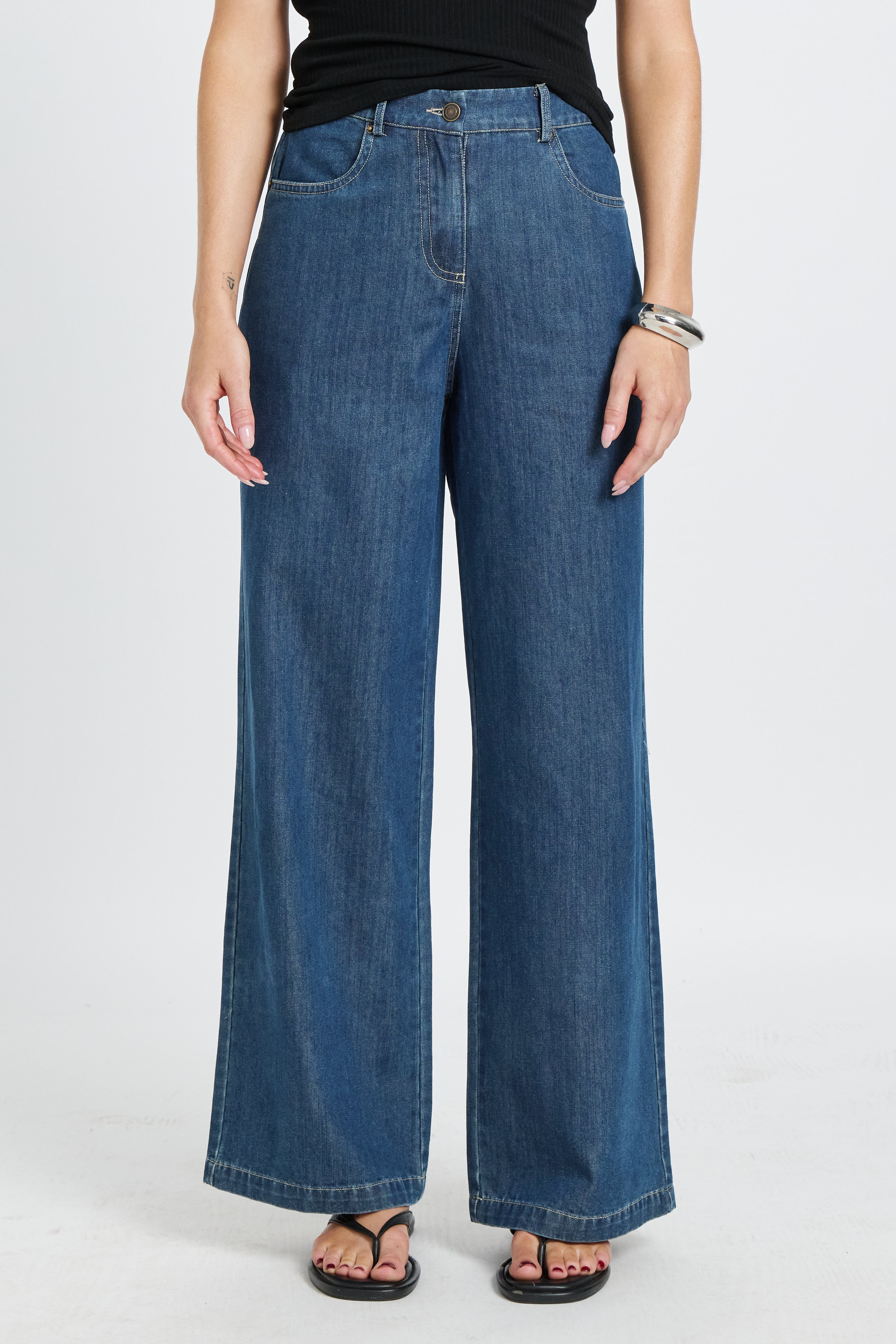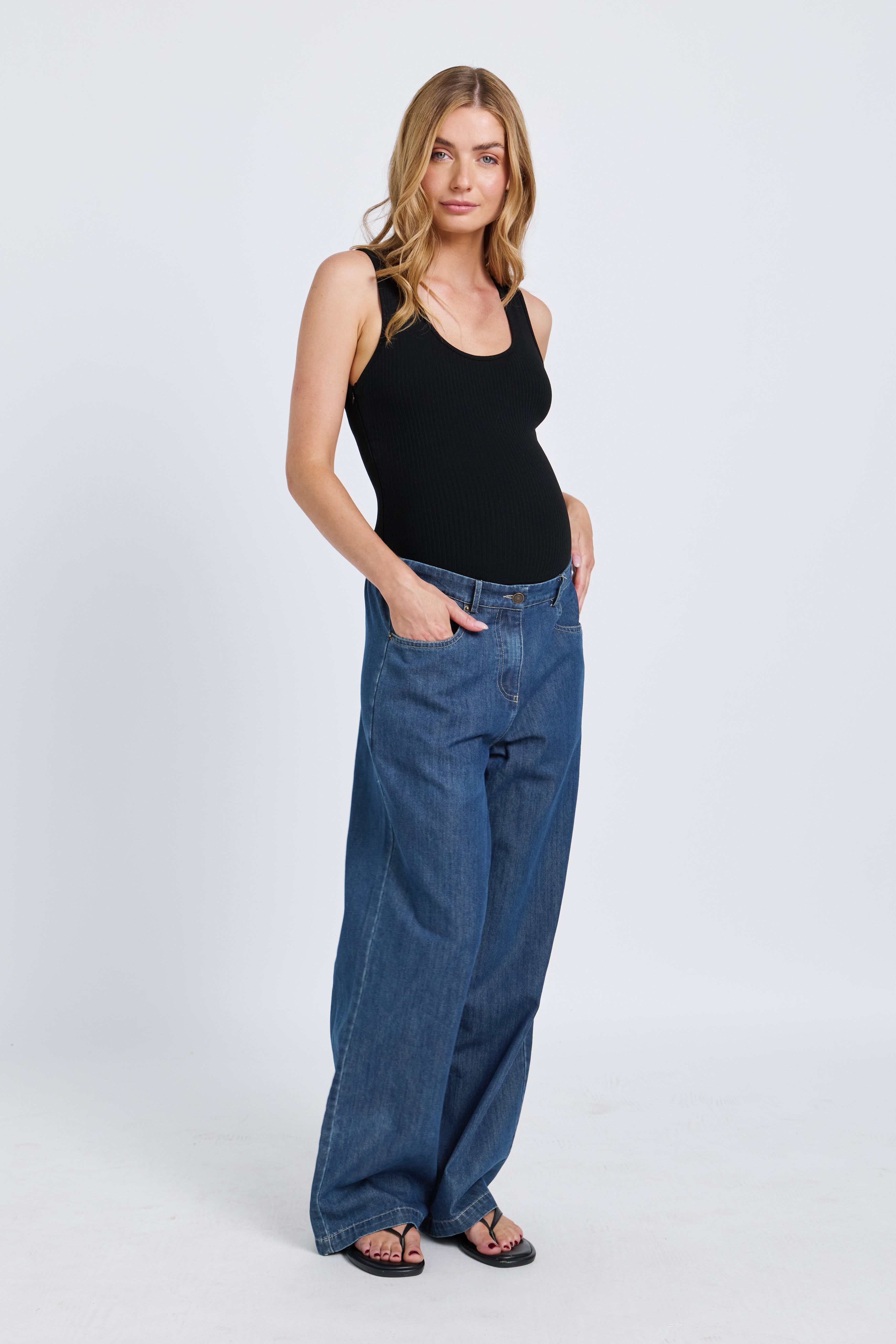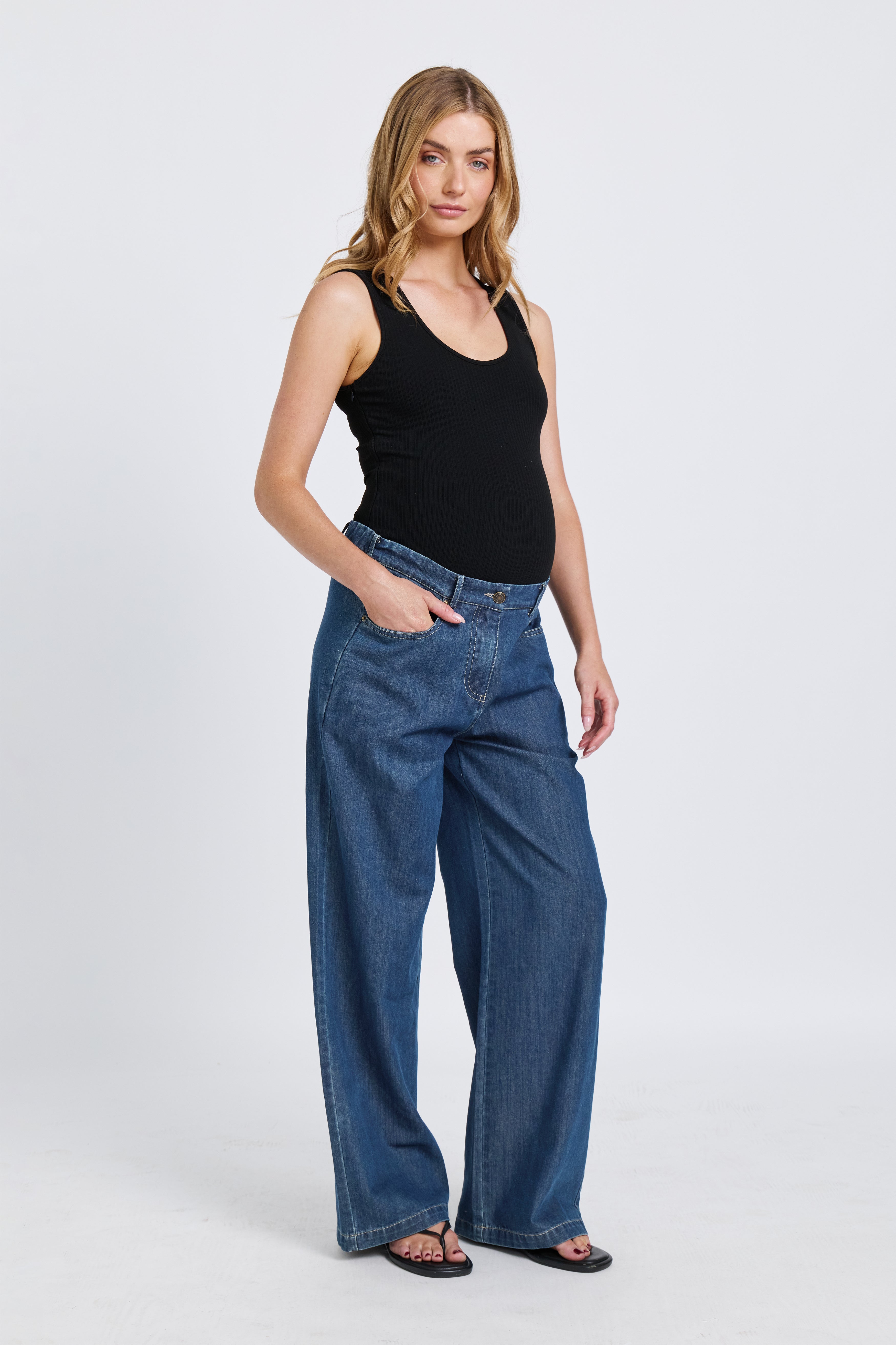 Crafted from a custom-developed ultra-lightweight denim, the fabric mirrors the look of classic denim while offering a soft drape that allows for comfortable gathering at the waist. Designed with a mid-rise fit that sits just below the bump, and finished with a wide, straight full-length leg, this style delivers a modern, effortless silhouette.