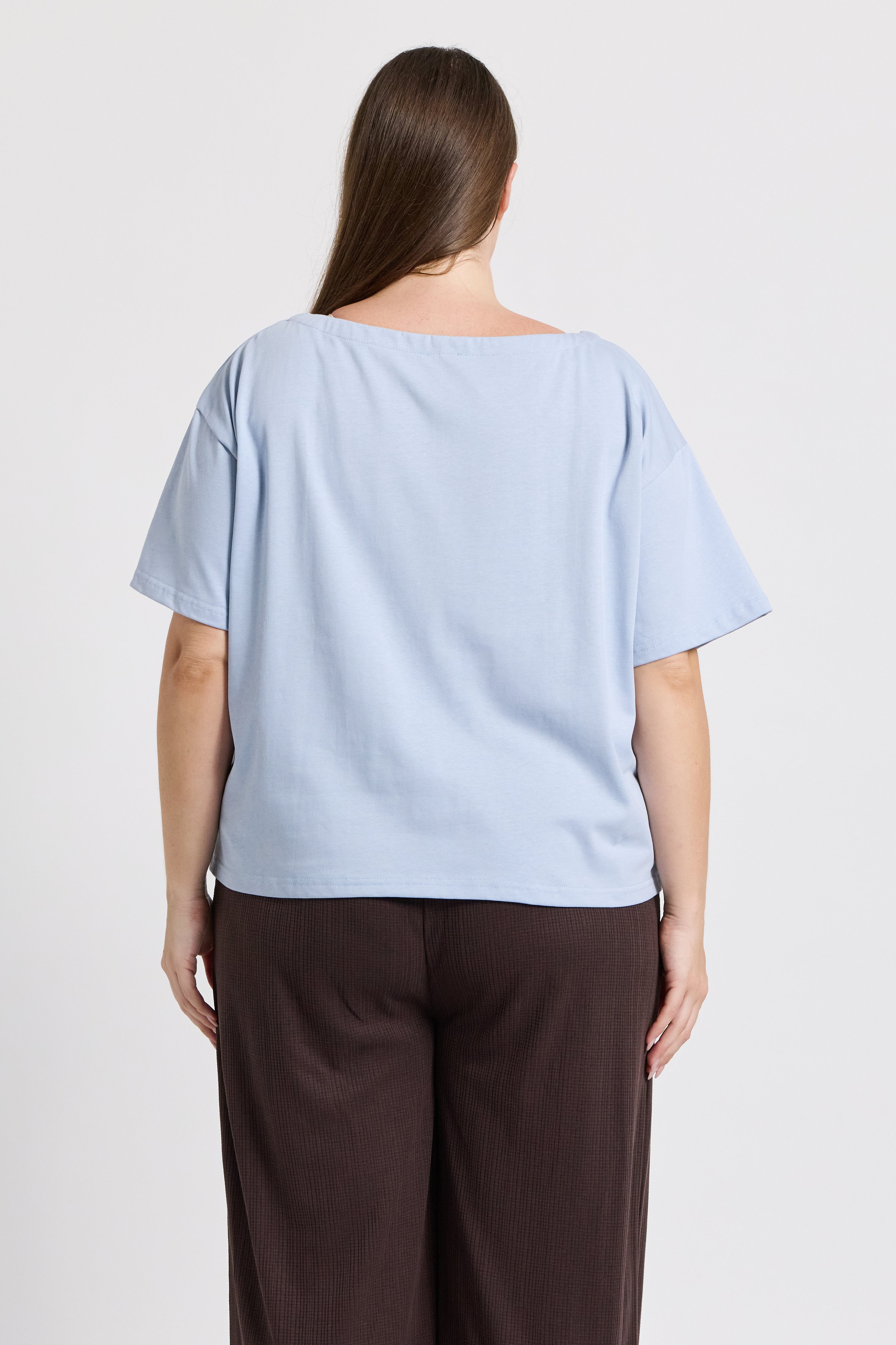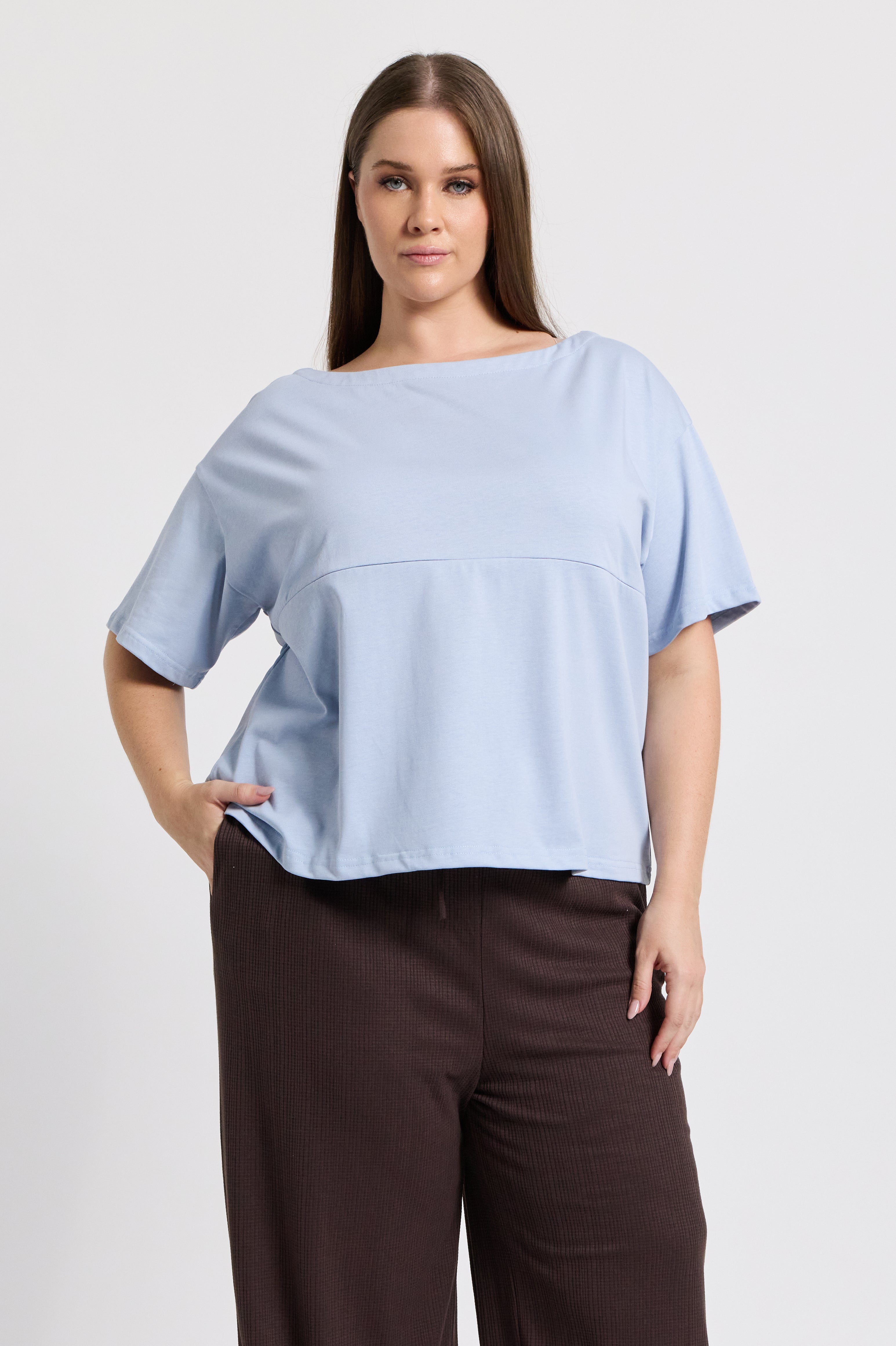 The wide boat-style neckline can cover bra straps or be styled off-the-shoulder when coverage isn’t needed, while drop shoulder armholes and cap sleeves create a relaxed, modern silhouette. Finished in a soft baby blue, the tee falls to a regular length at the hips, making it a polished yet practical addition to any maternity wardrobe.