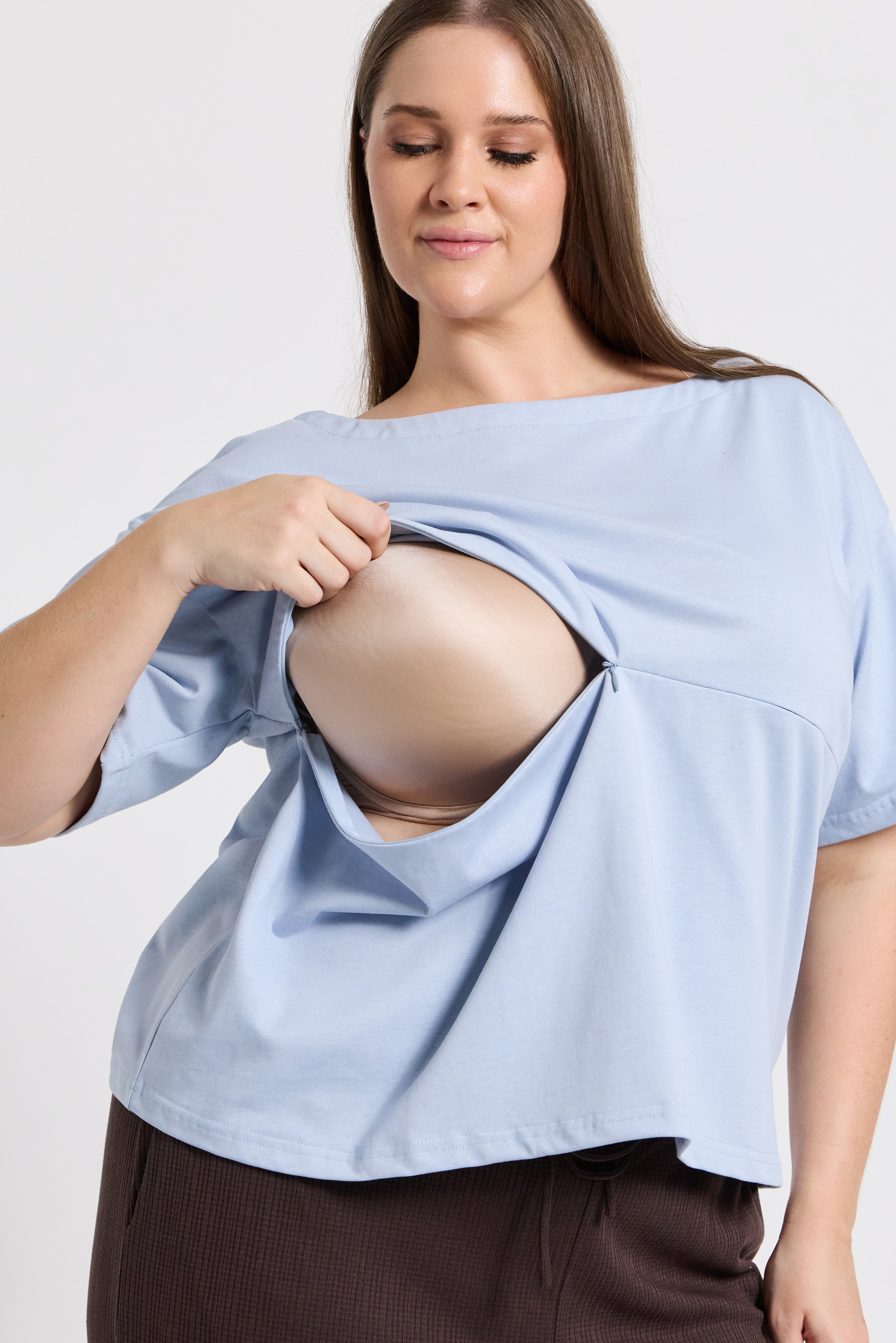 The Aria Boatneck Tee in Baby Blue combines effortless style with thoughtful functionality for motherhood. Designed with a discreet two-way zipper hidden in the front underbust seam, it provides easy and subtle breastfeeding access. Its bump-friendly construction and soft cotton jersey fabrication allow for comfort and movement throughout pregnancy and beyond.