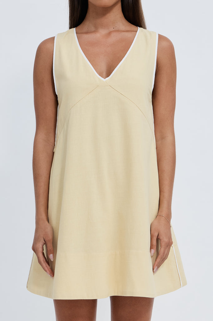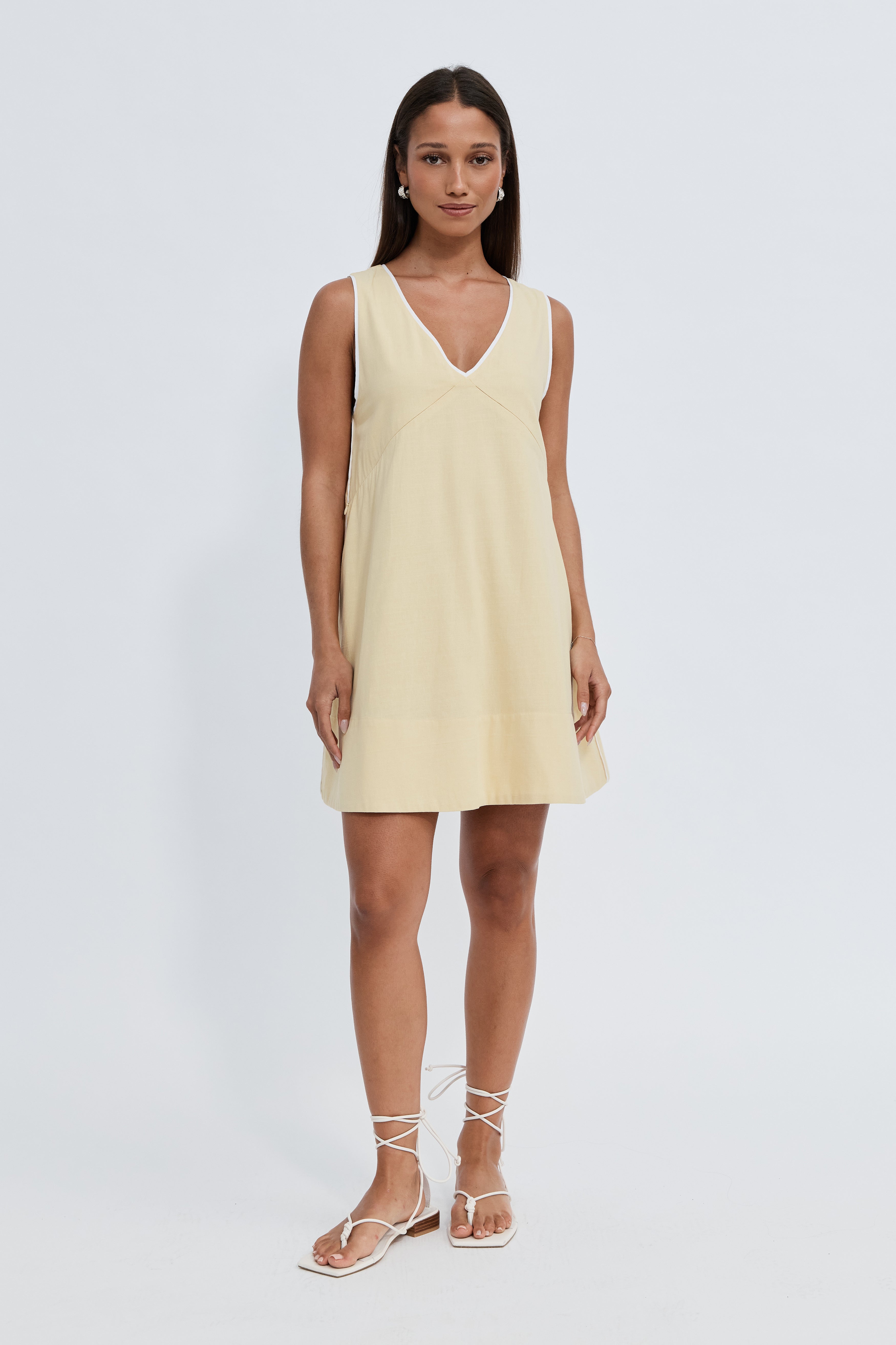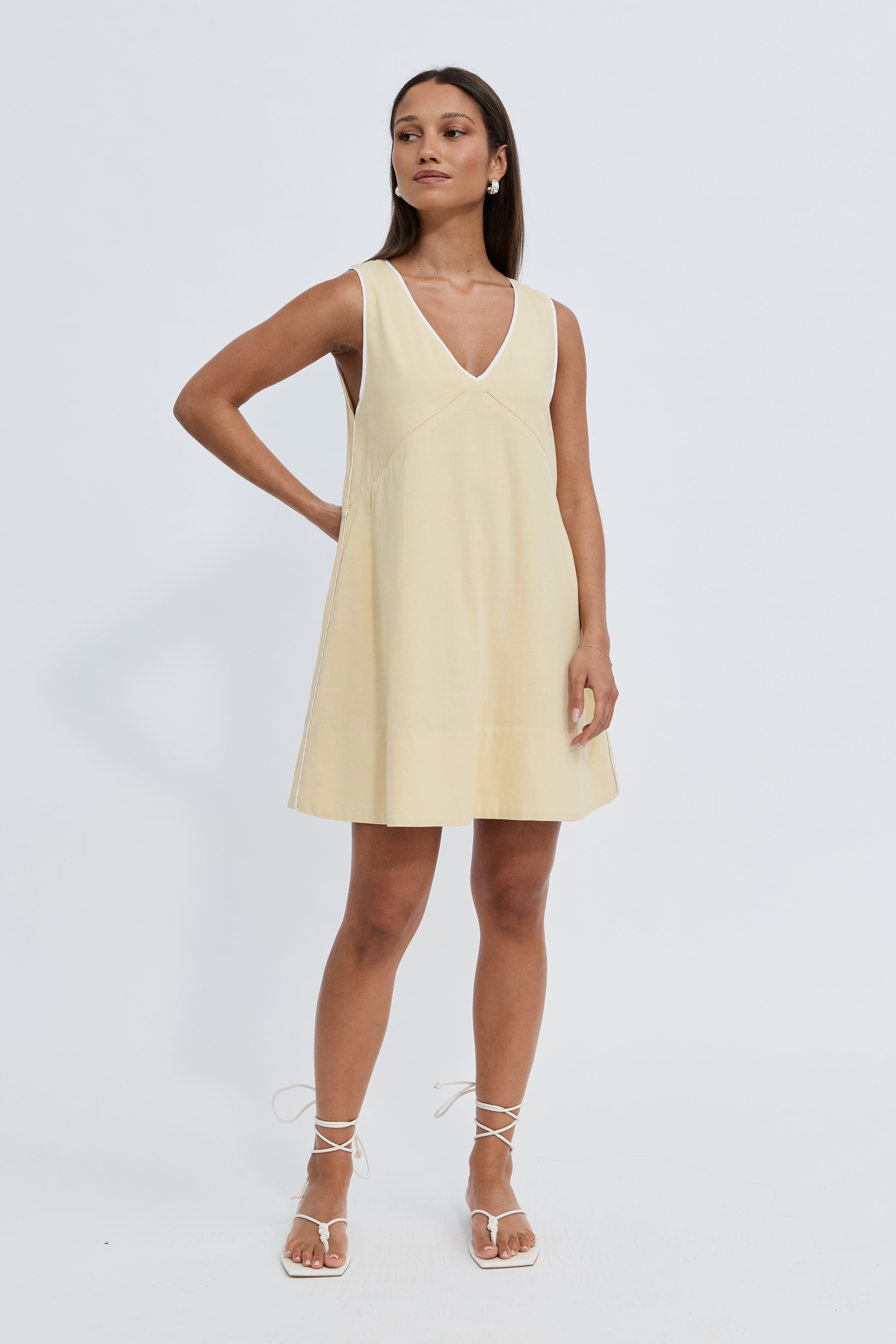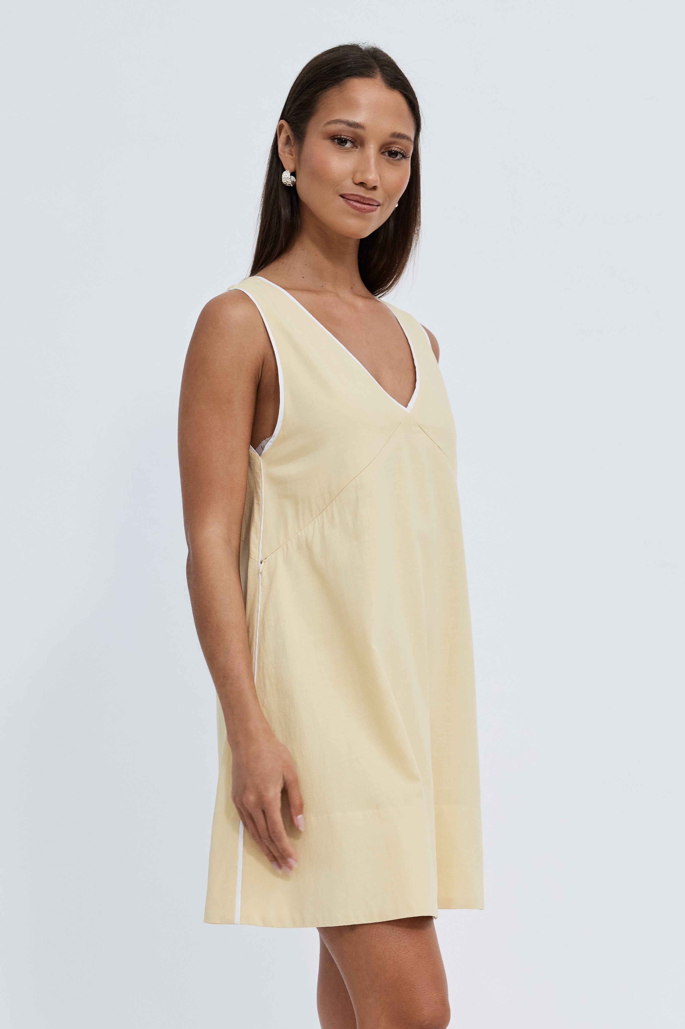 Crafted from a woven cotton-blend fabric in a soft lemon yellow hue, the dress has a mini length with a wide hem panel, underbust seam detailing, and white contrast trims at the neckline, armholes, and side seams for a refined finish. Fully lined and sleeveless with a flattering V-neckline, this piece blends practicality and polish — perfect for sunshine-filled days or elevated casual occasions.