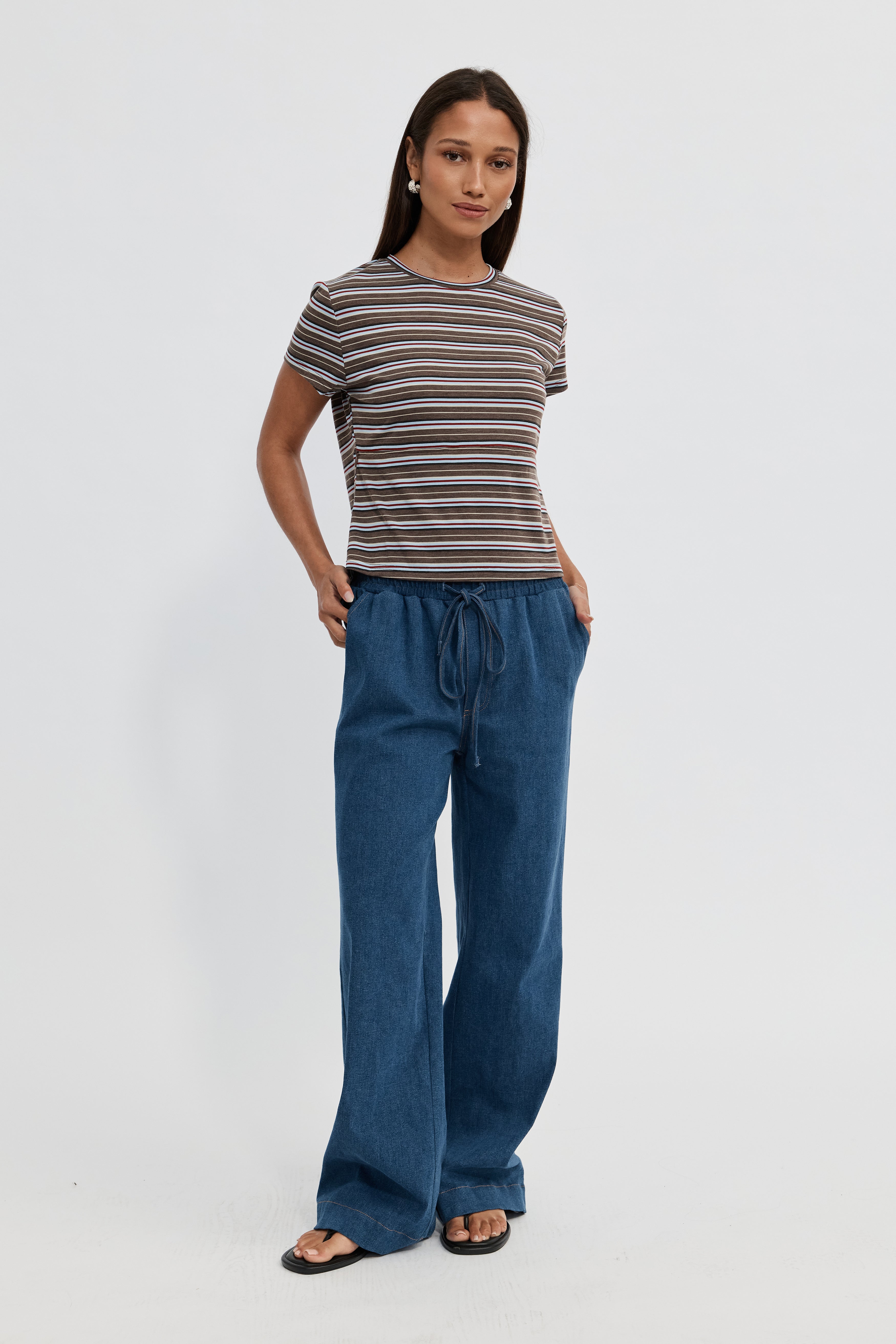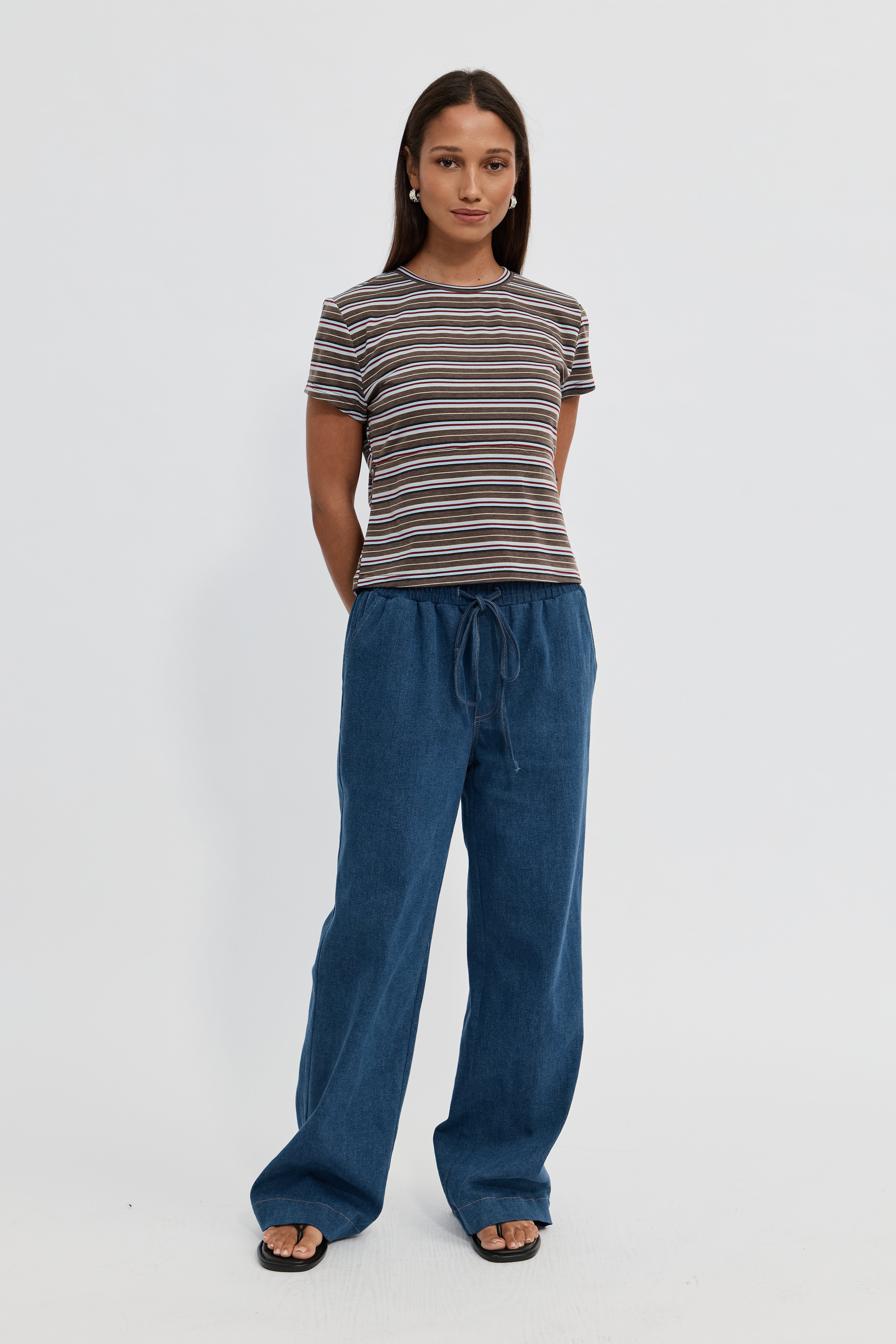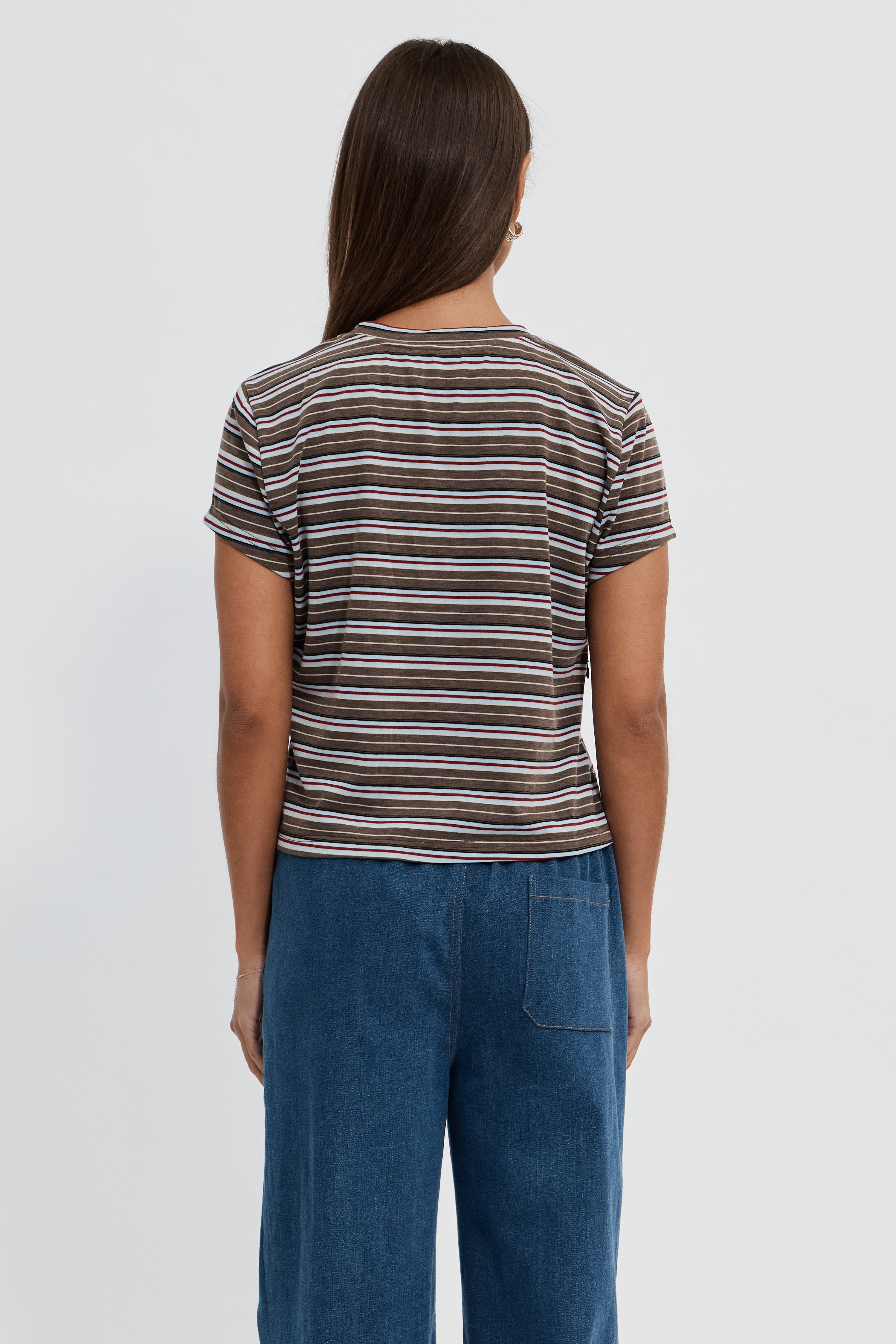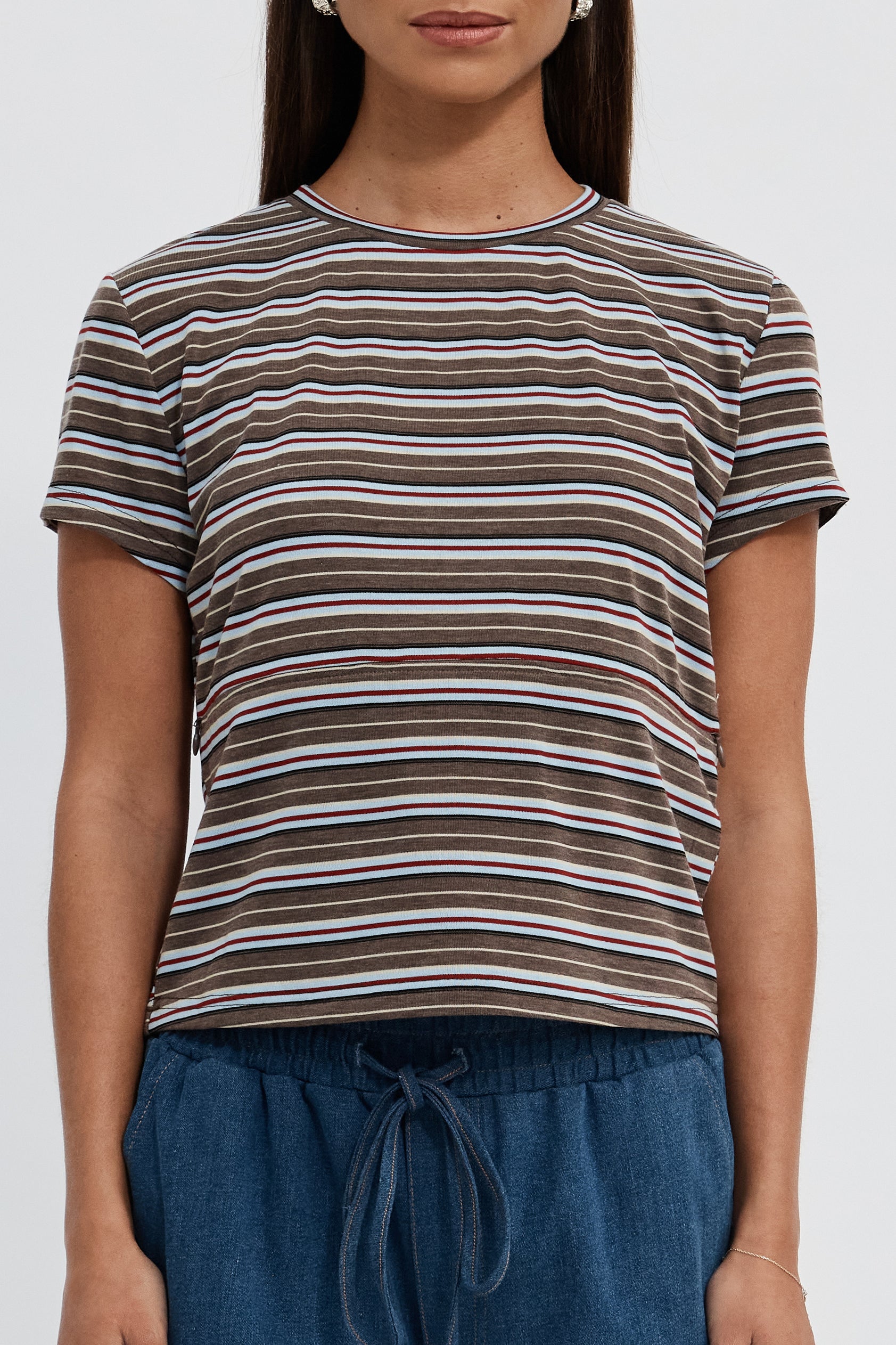 The Cherry Stripe Baby Tee in Brown Multi offers a modern take on the classic baby tee with thoughtful features for motherhood. Made from soft cotton jersey, it has a slimmer body fit that creates a traditional, flattering silhouette, while a semi-cropped length sits just above the hips.
