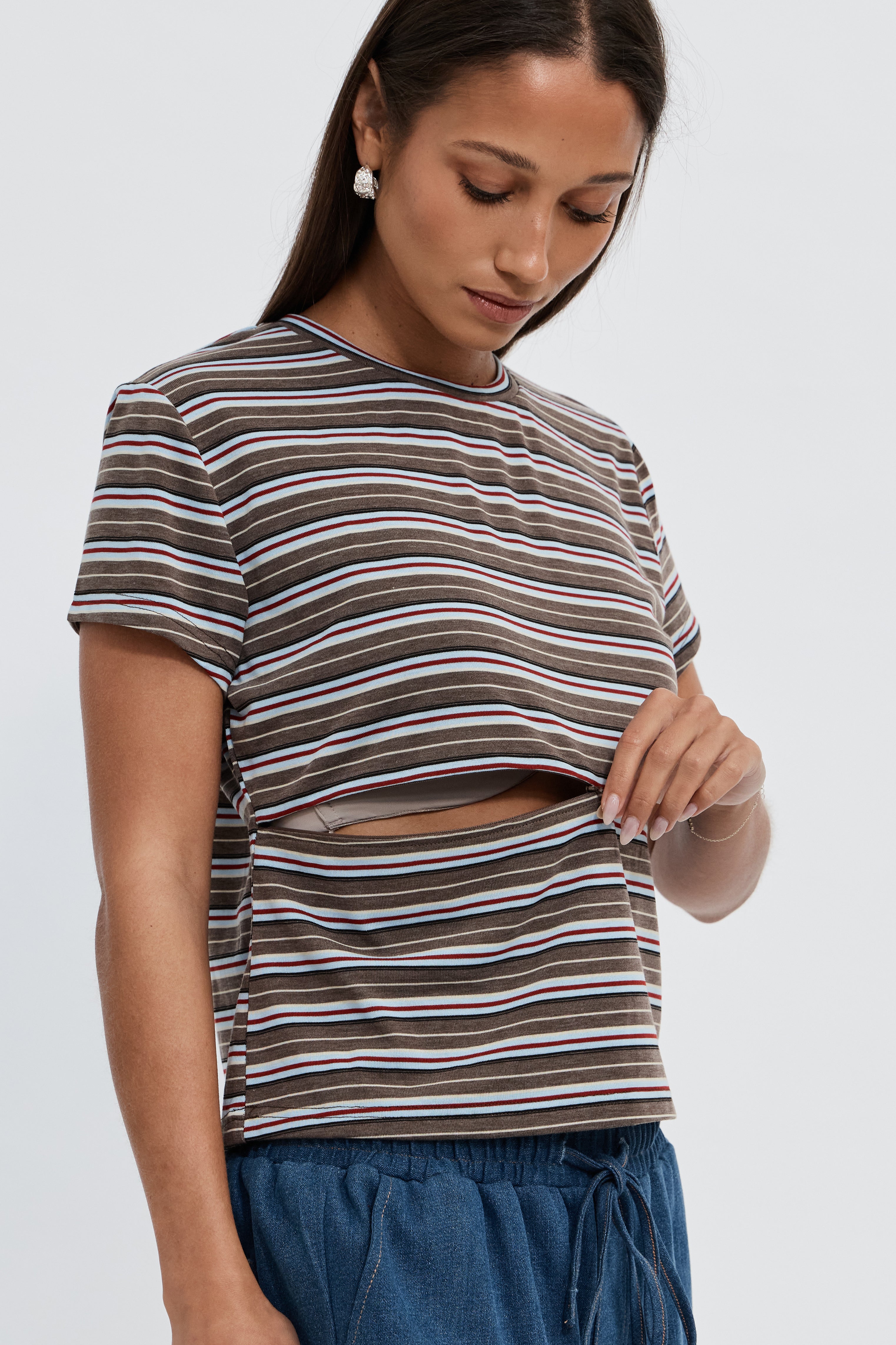 Designed for the nursing stage of motherhood, a discreet two-way zipper sits at the underbust for best access whilst being cleverly disguised by the striped pattern in the fabric. Made in a supersoft, drapey jersey with stretch, finished in a brown/red/blue multi stripe, crew neckline, and short cap sleeves for effortless everyday style.