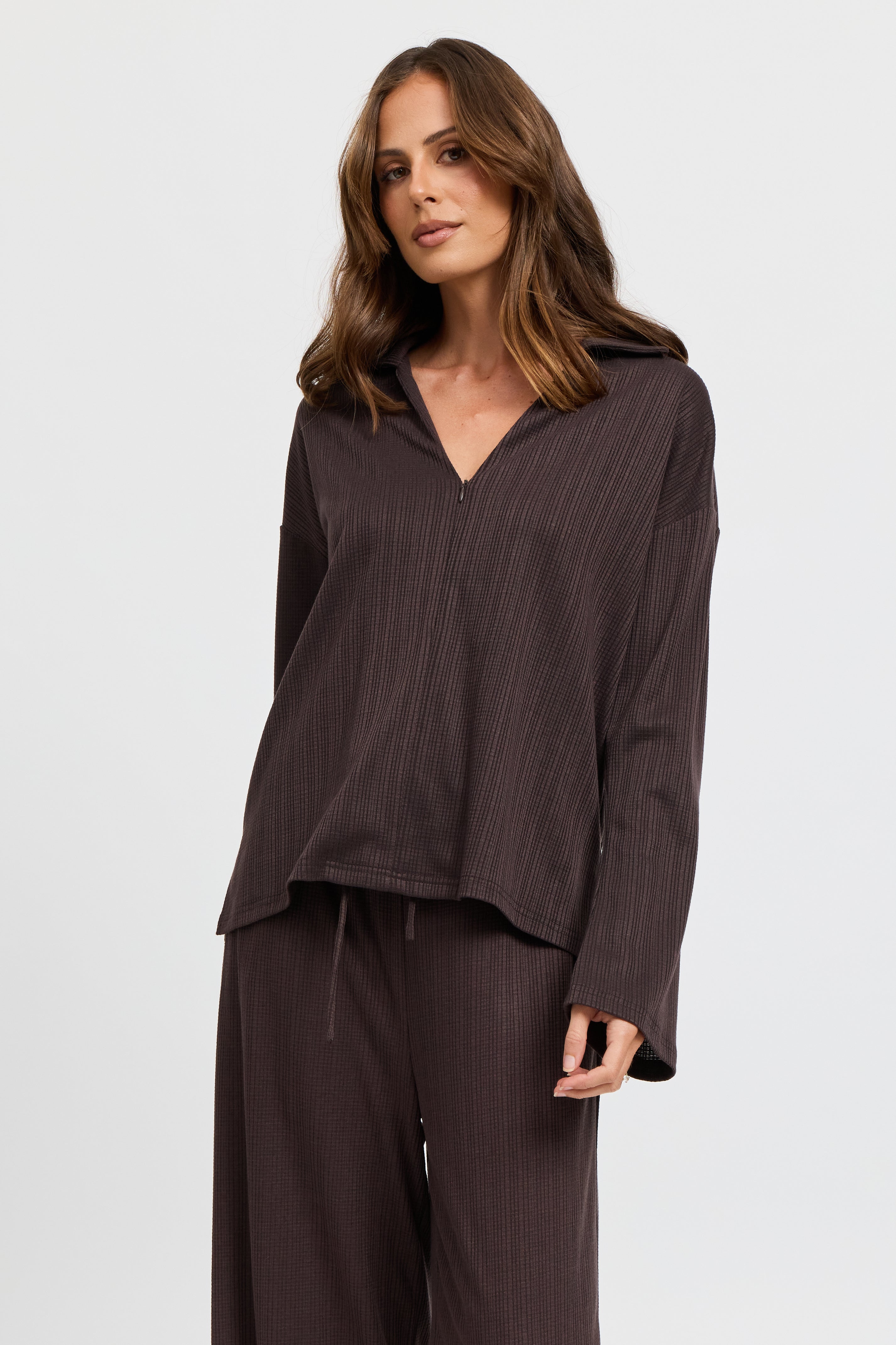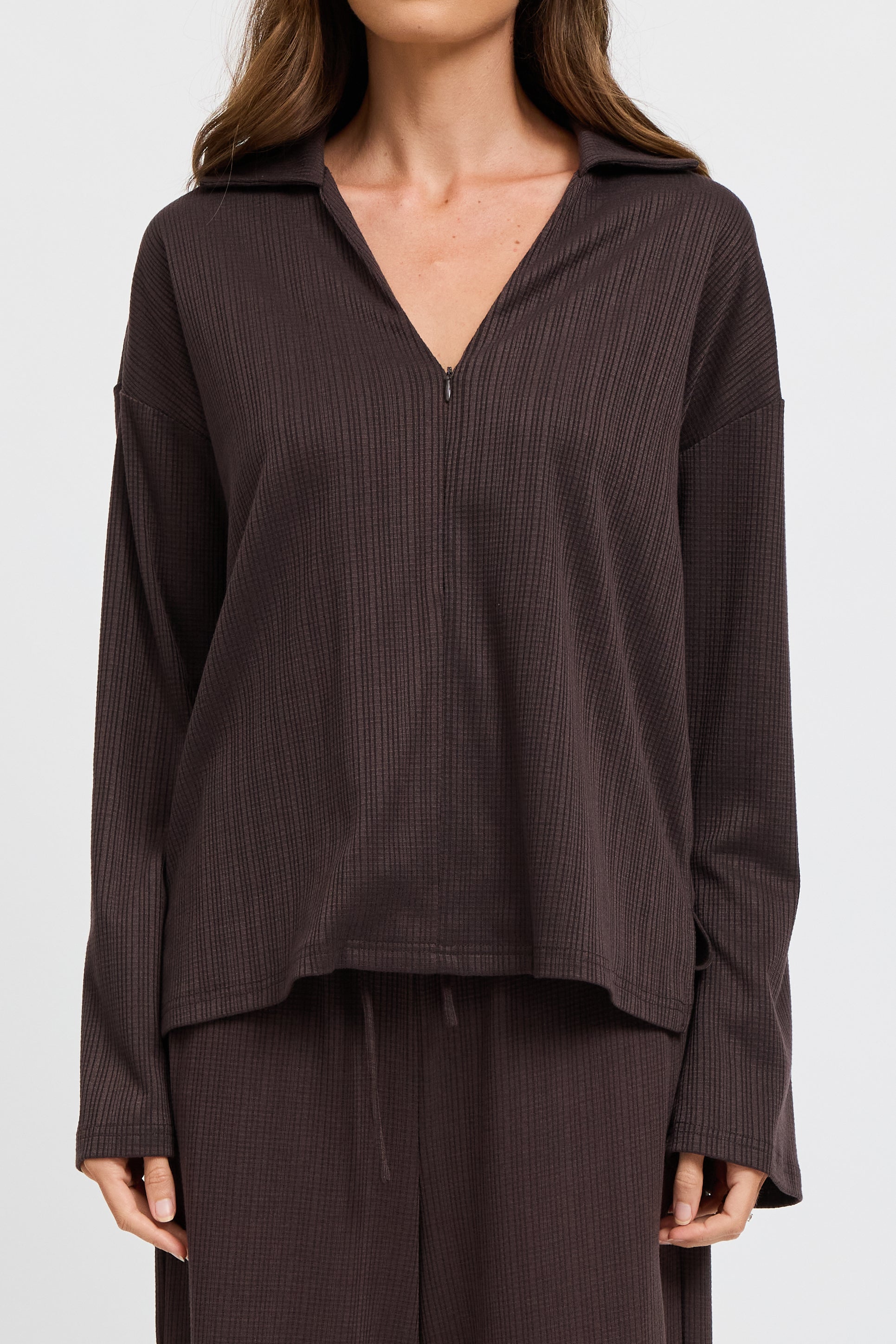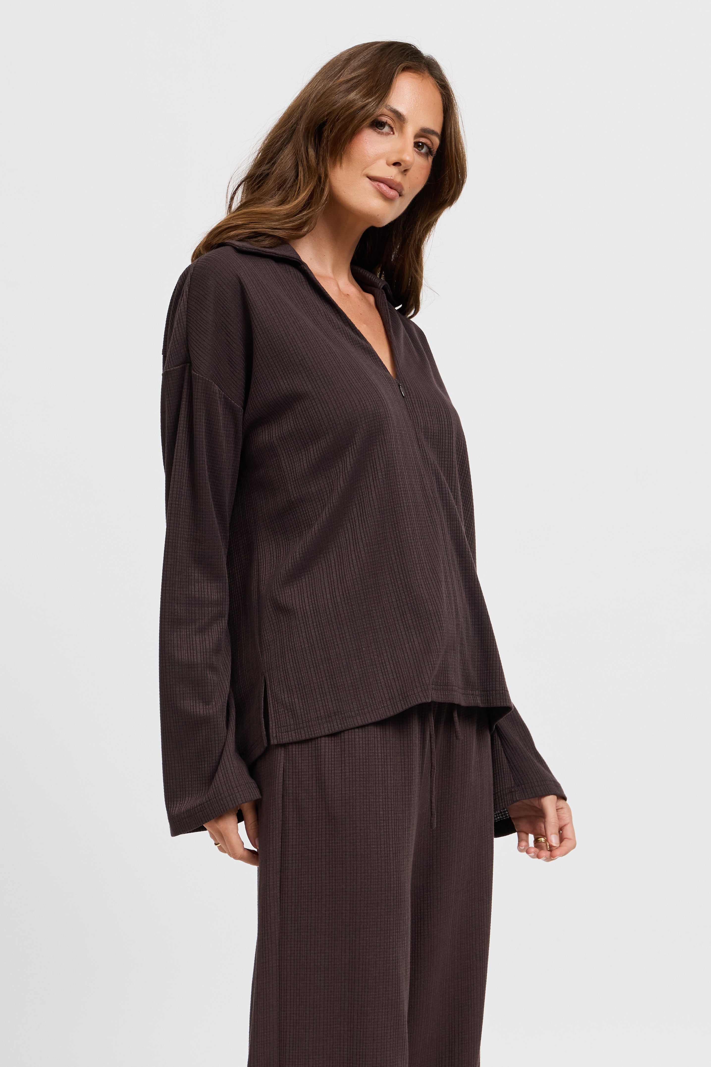 Ivy Waffle Zip-Front Top - Chocolate