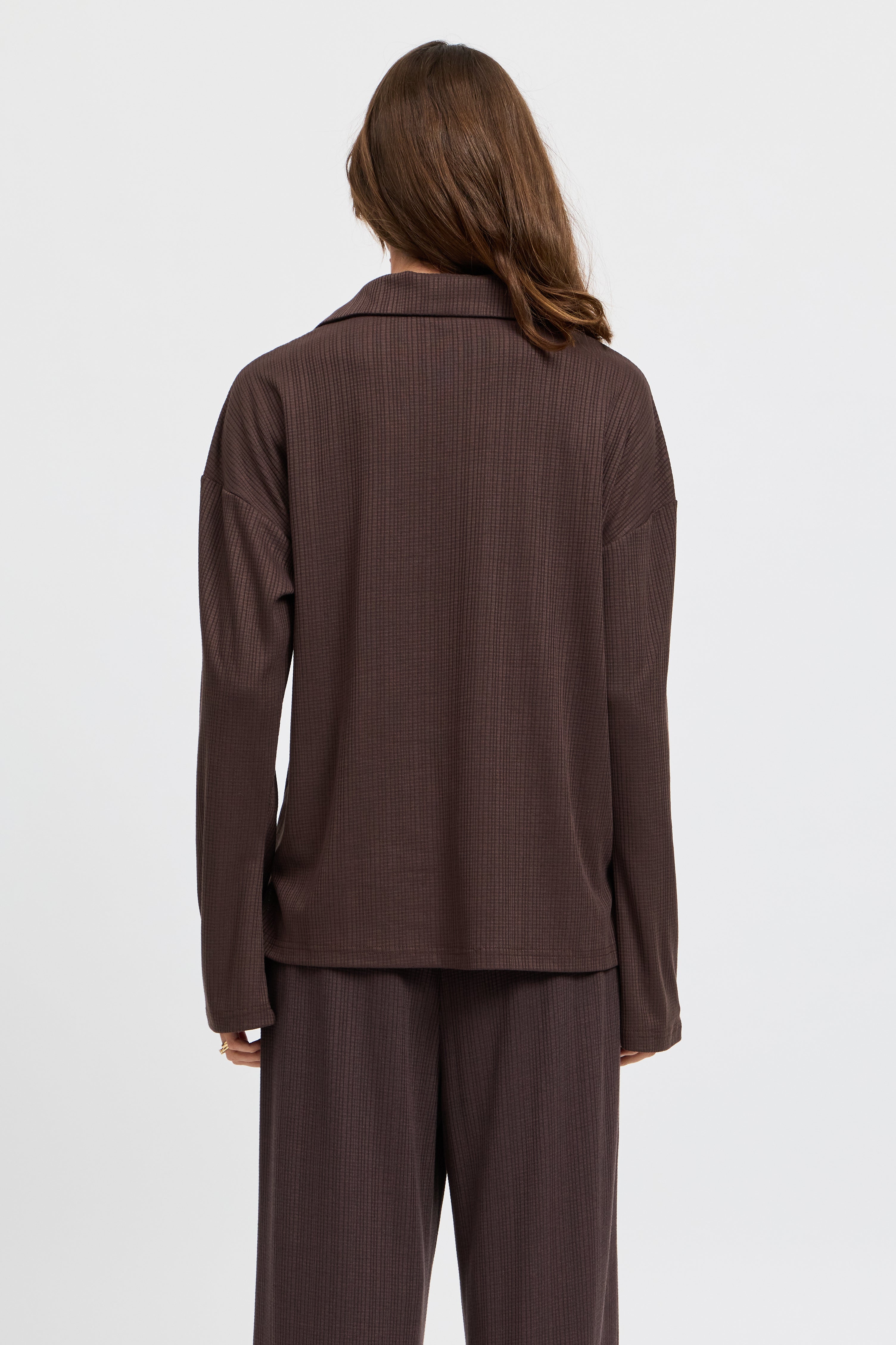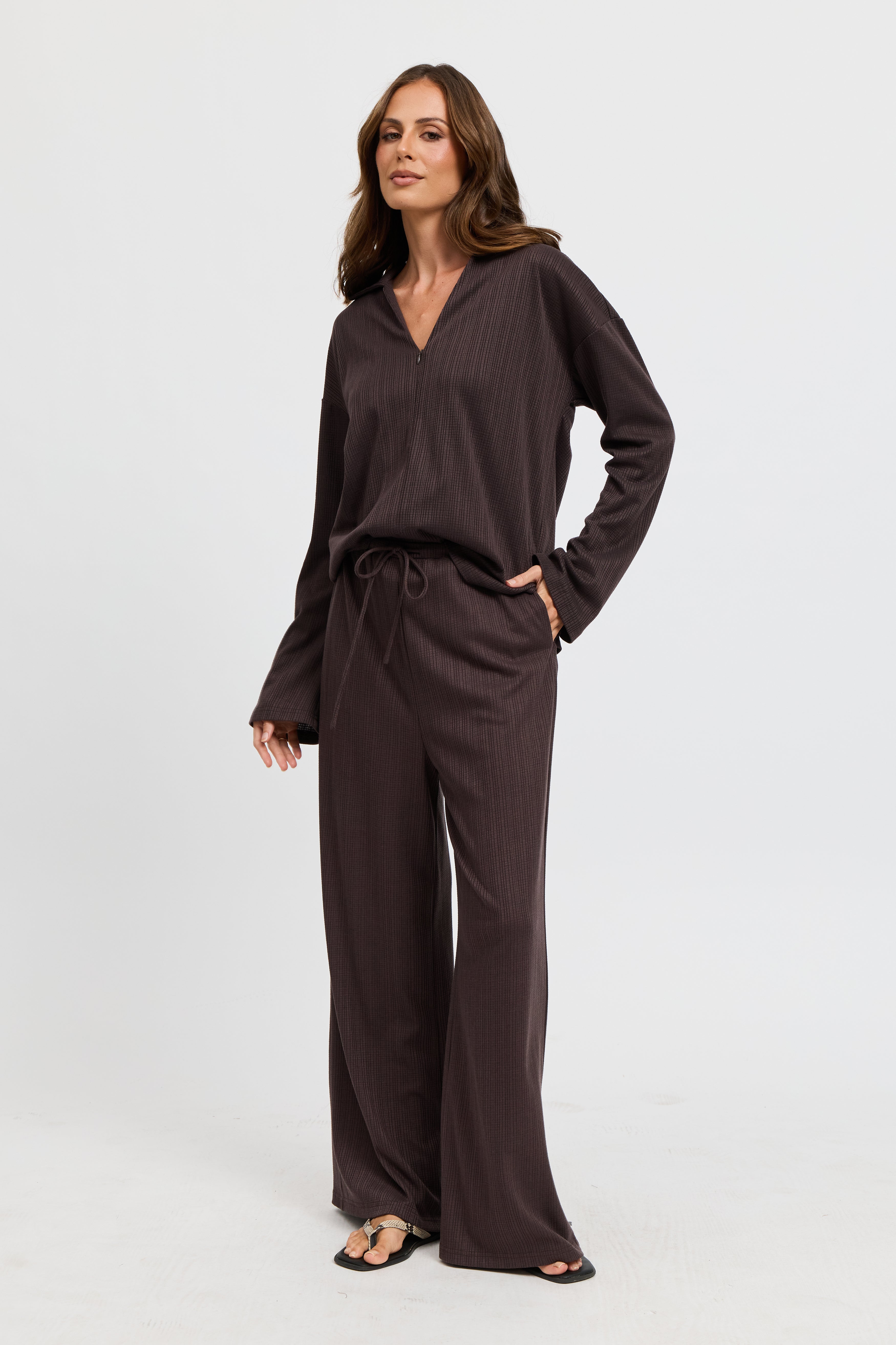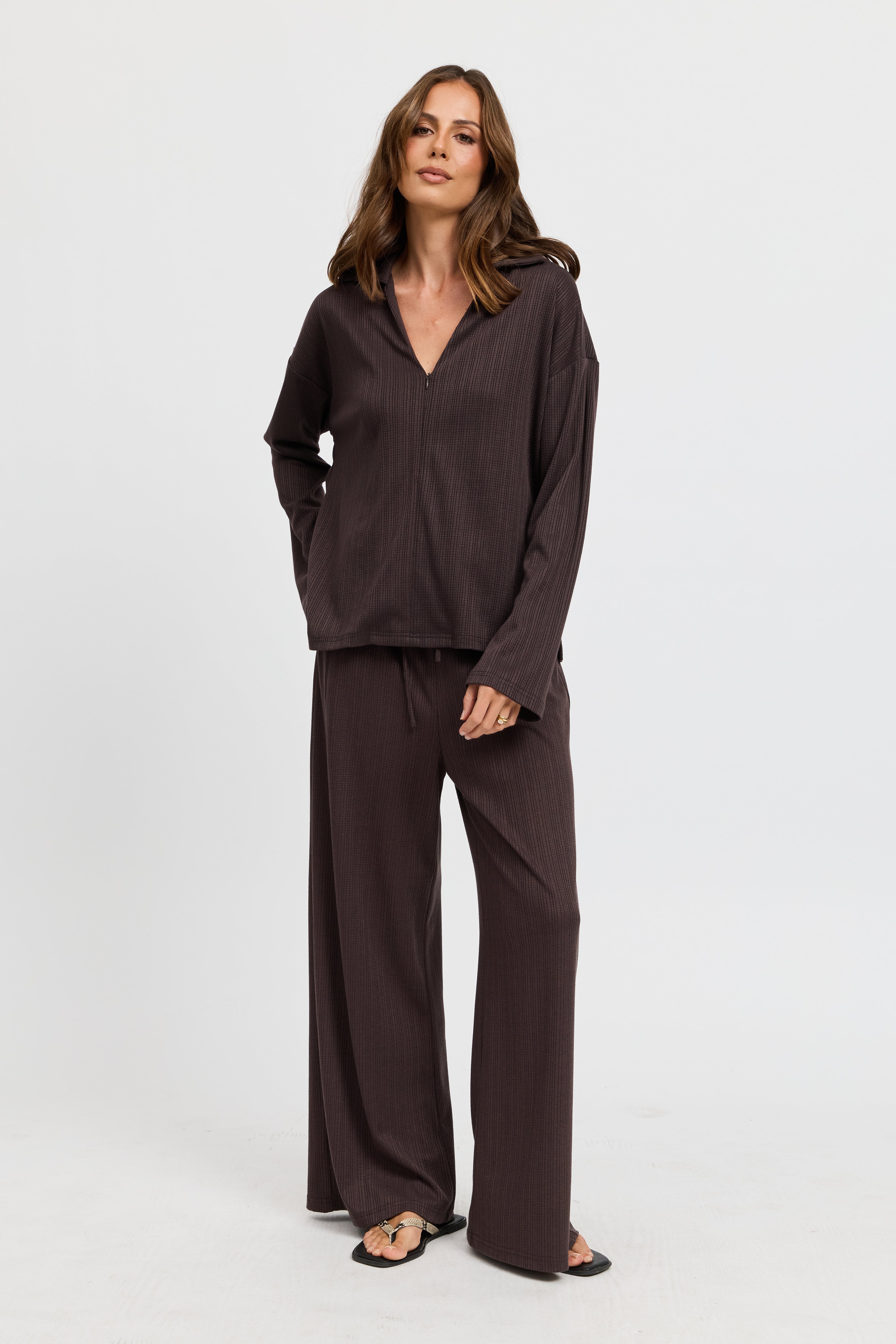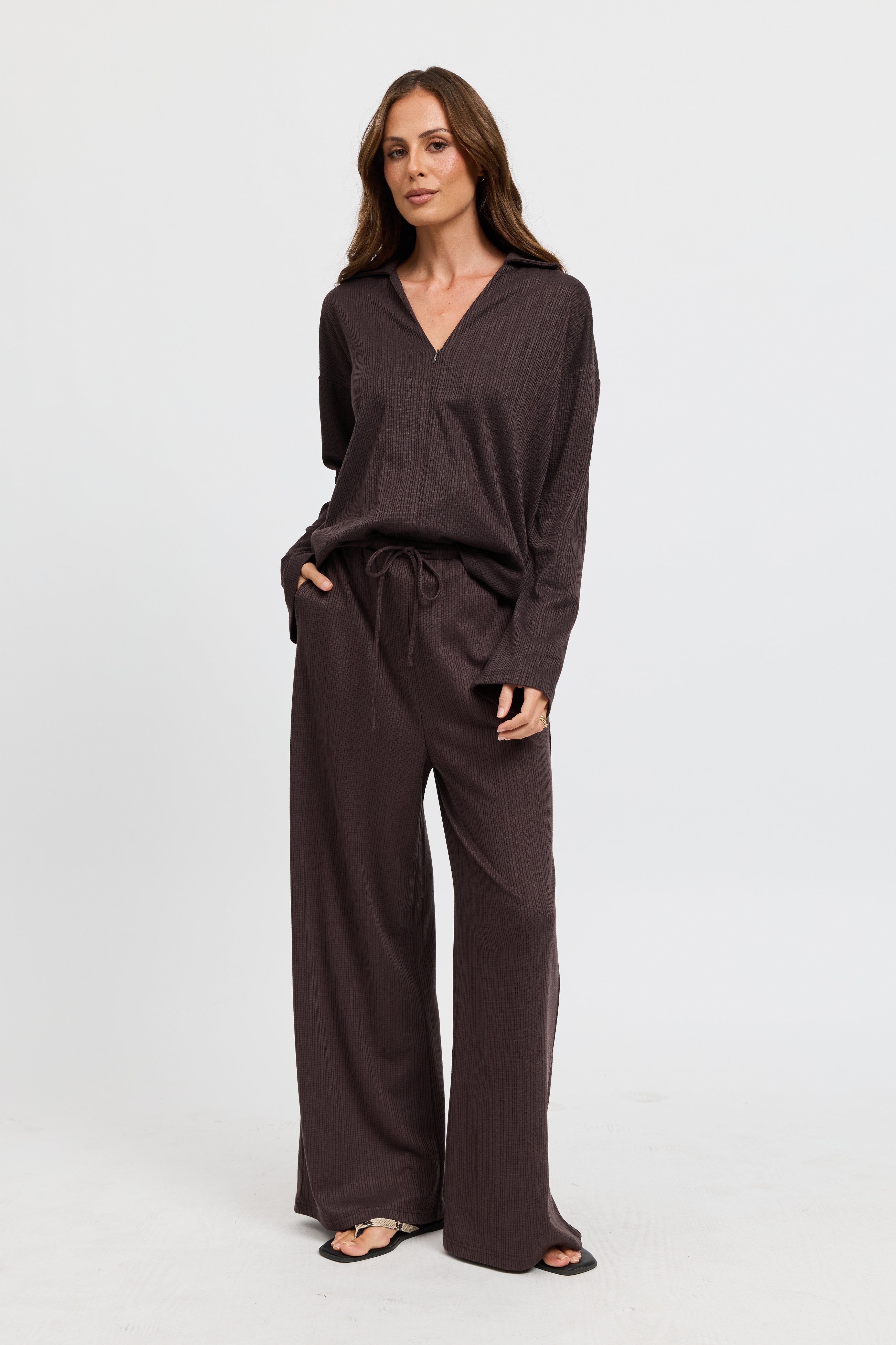 Ivy Waffle Zip-Front Top - Chocolate