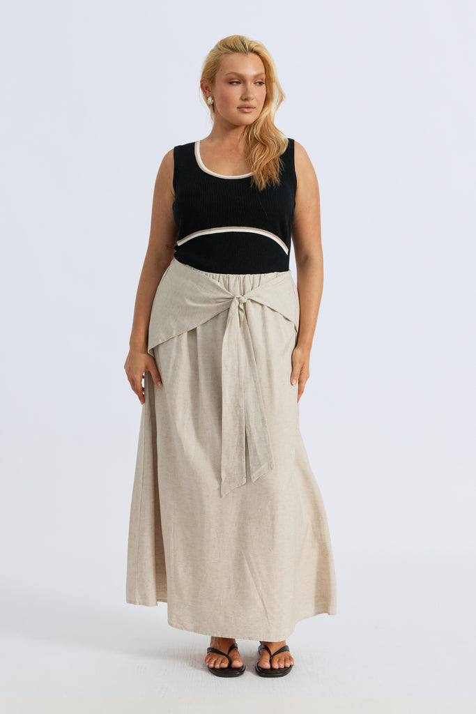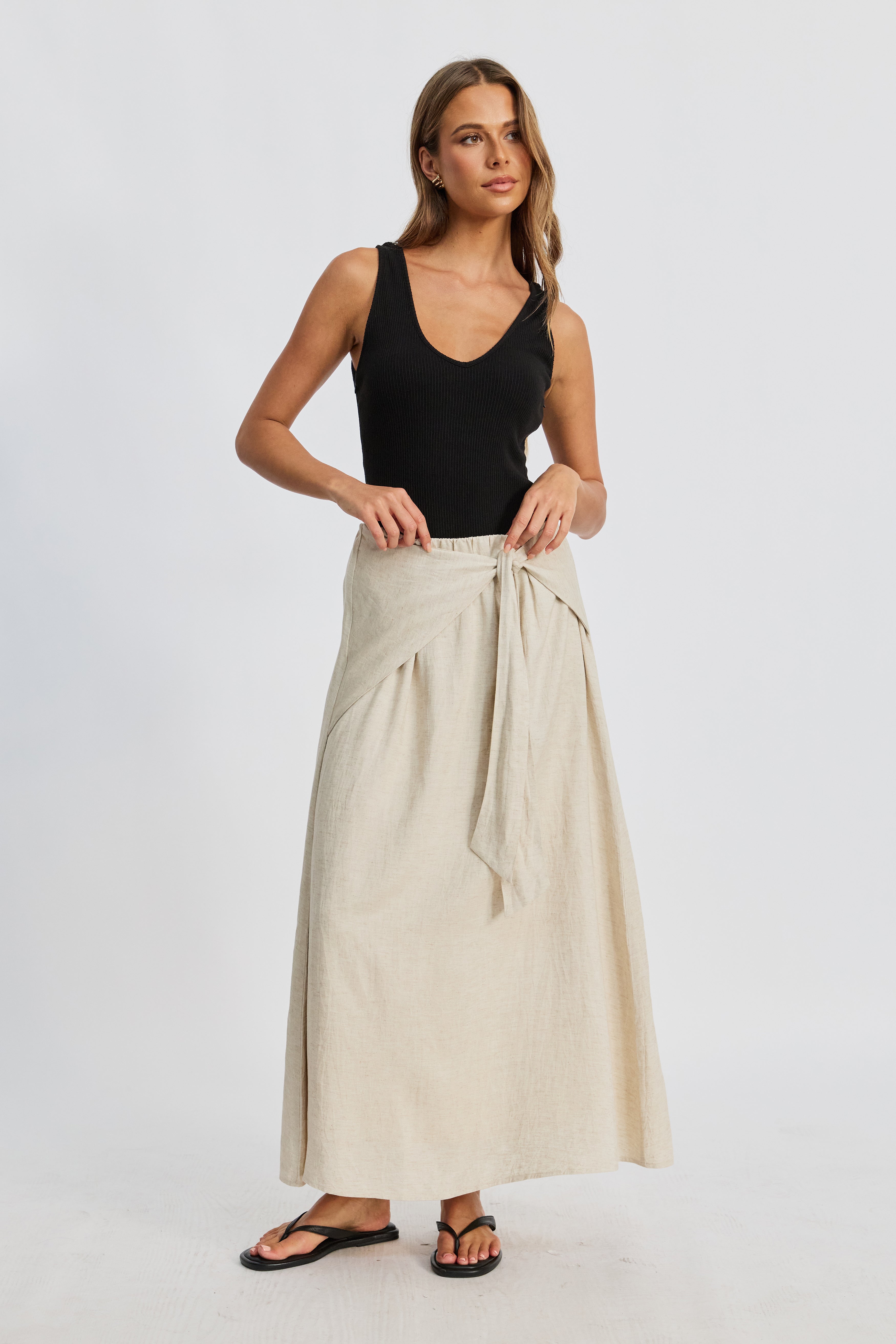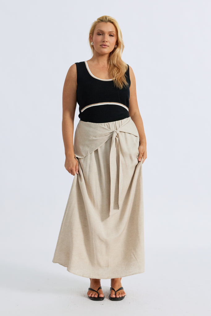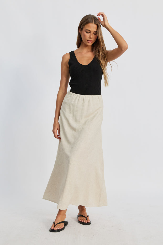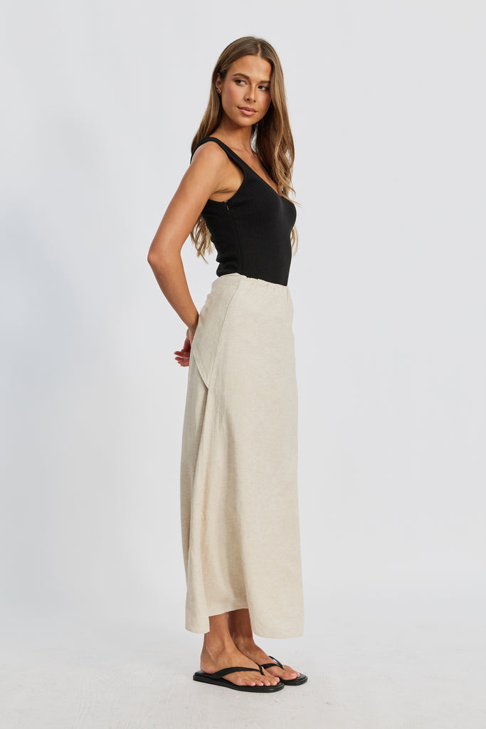Falling to a long midi length, the full circle skirt moves beautifully with you, while the natural beige hue with linen flecks brings warmth and dimension to your look. Fully lined for comfort and coverage, Junie is your go-to for effortless sophistication—whether paired with a baby tee or a ribbed tank.