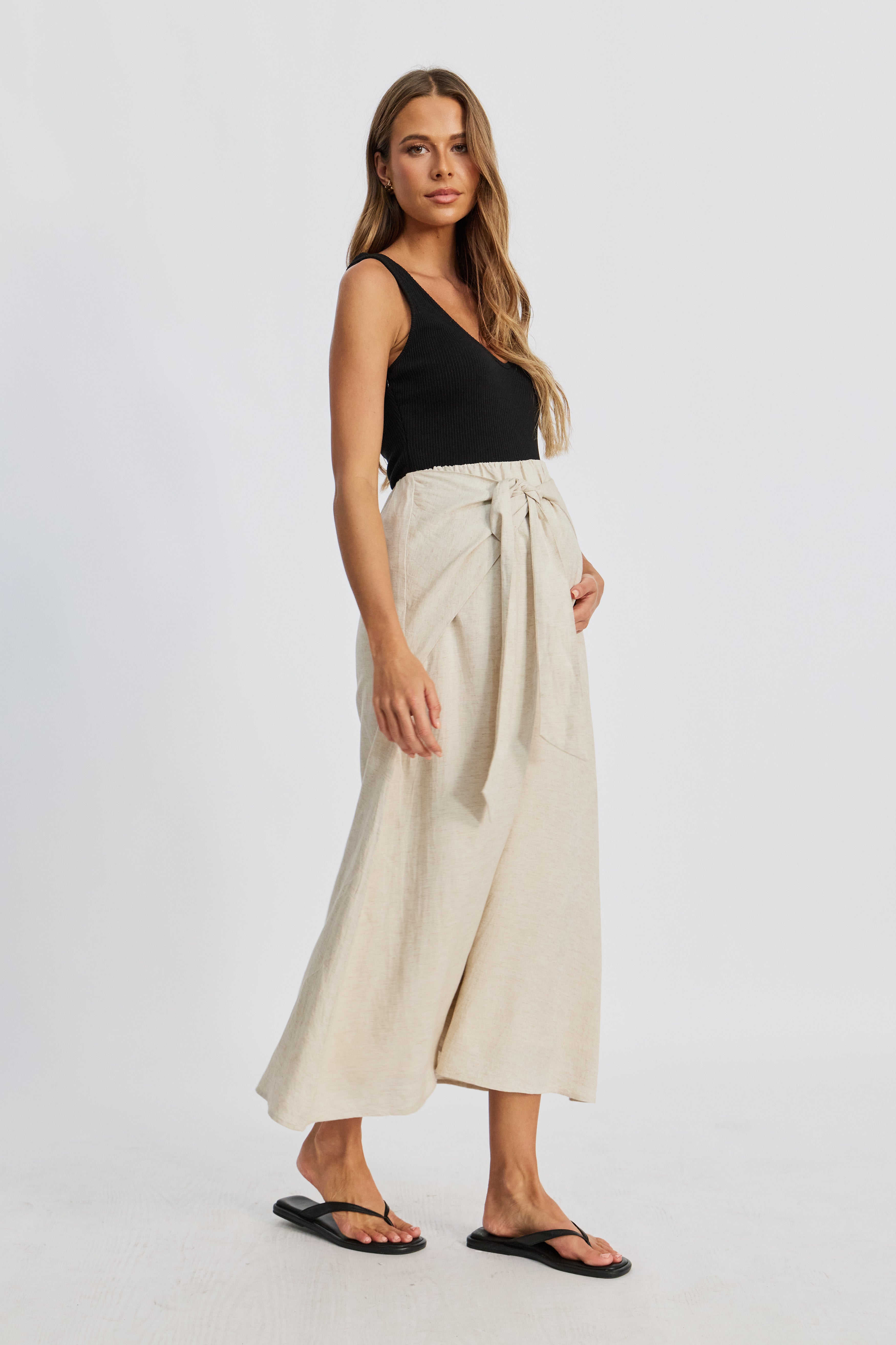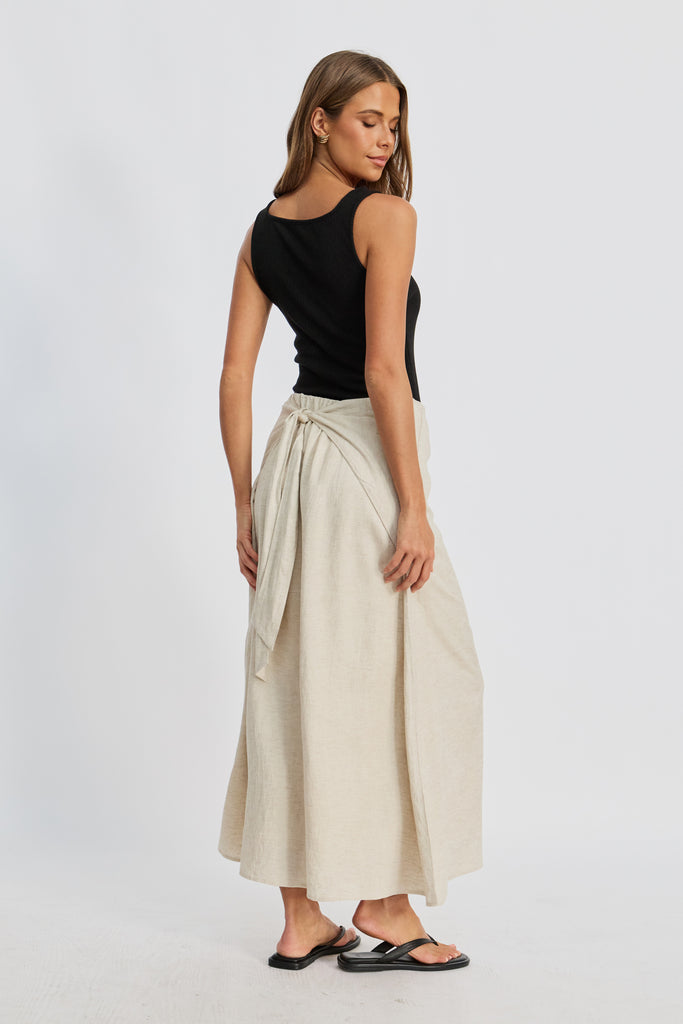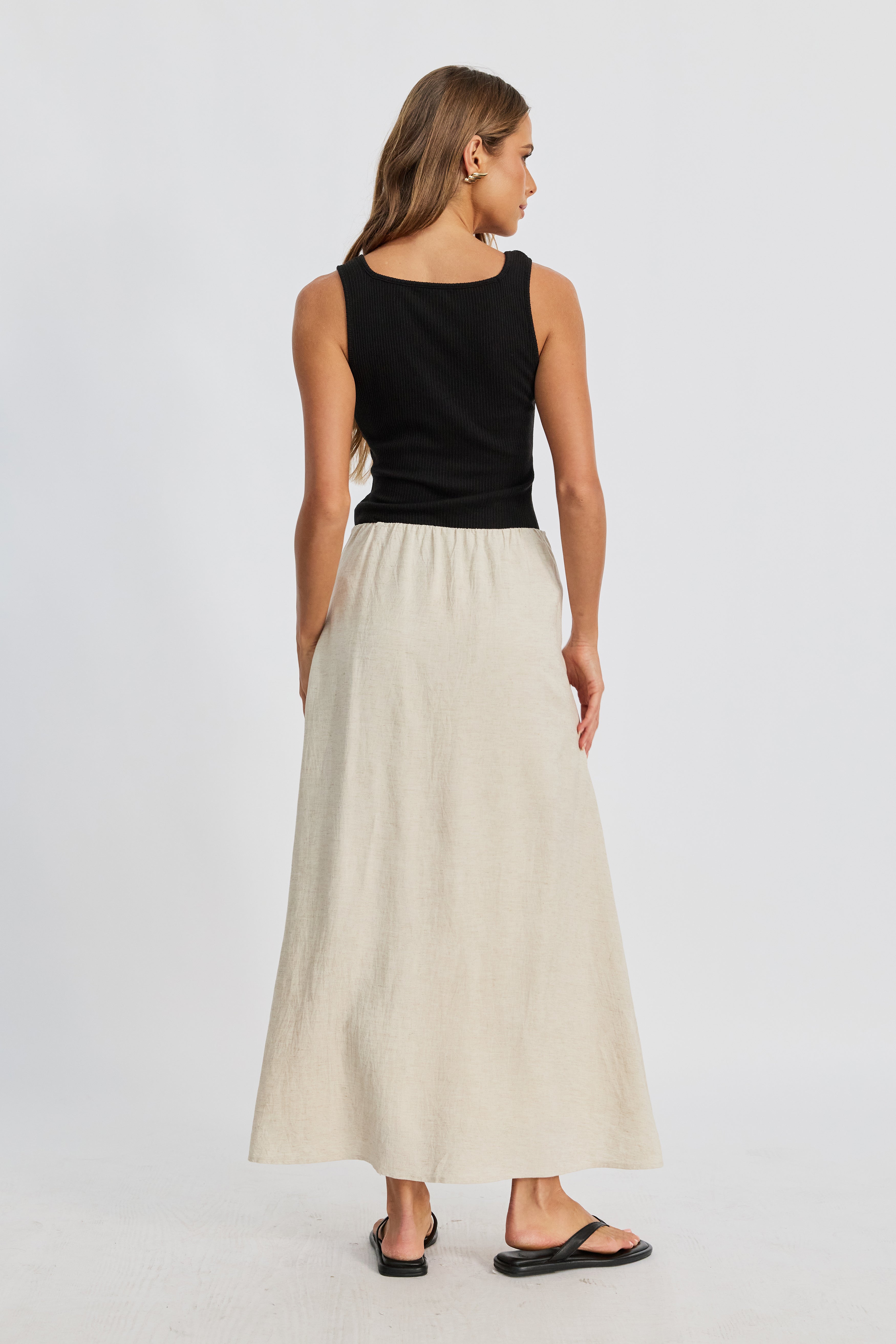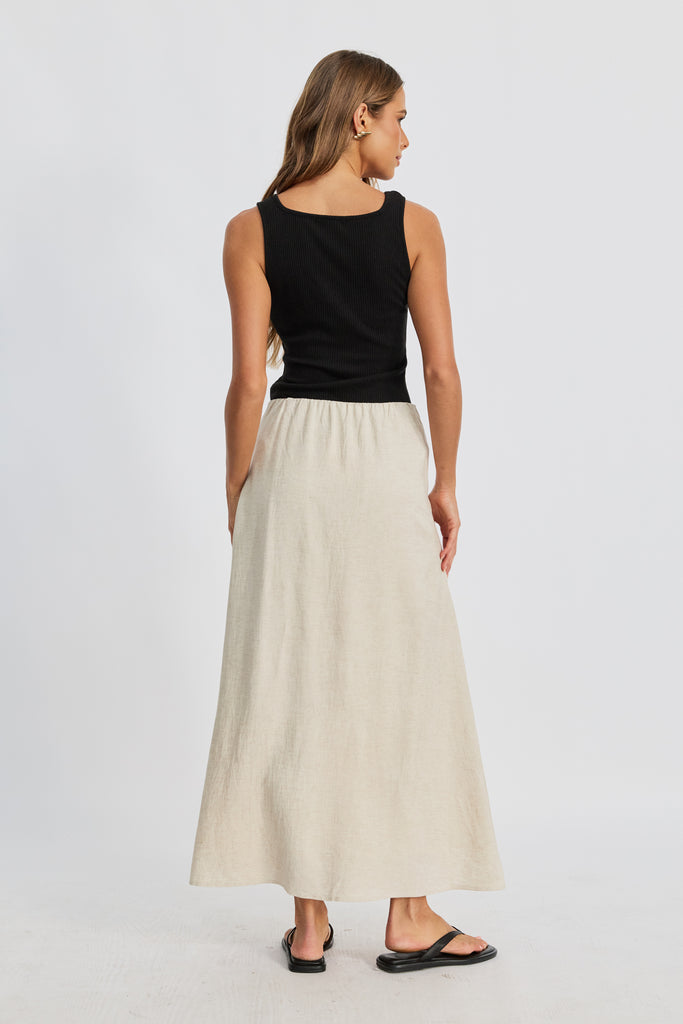 Falling to a long midi length, the full circle skirt moves beautifully with you, while the natural beige hue with linen flecks brings warmth and dimension to your look. Fully lined for comfort and coverage, Junie is your go-to for effortless sophistication—whether paired with a baby tee or a ribbed tank.