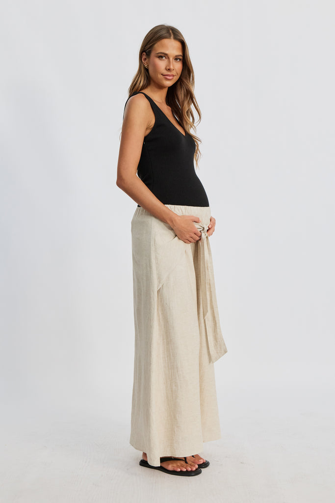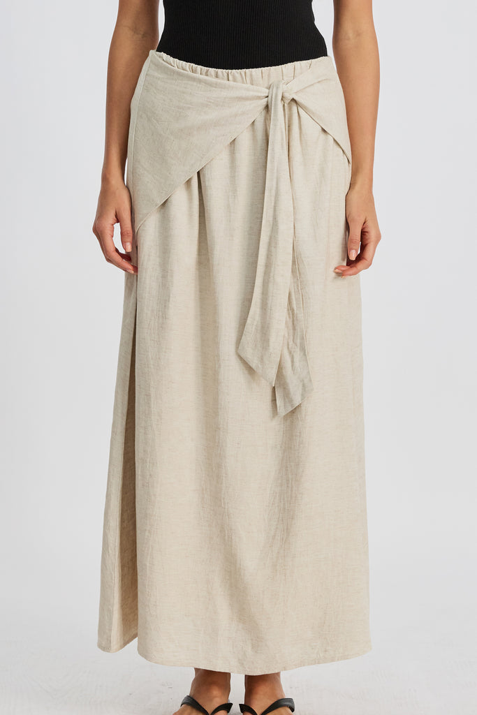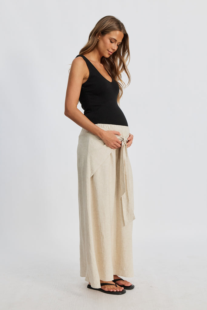 The Junie Tie-Front Midi Skirt in Natural redefines everyday ease with thoughtful design and timeless texture. Crafted from a rayon-linen blend with a touch of nylon to reduce crinkling and shrinkage, this piece blends natural drape with modern practicality—perfect for styling through every stage of motherhood and beyond.