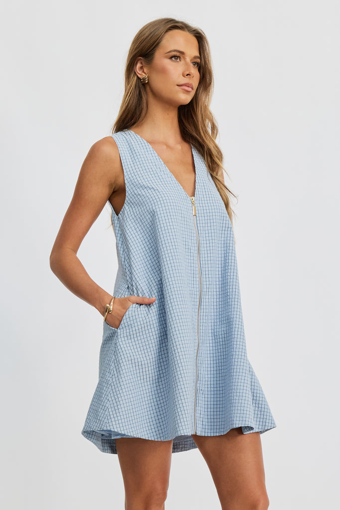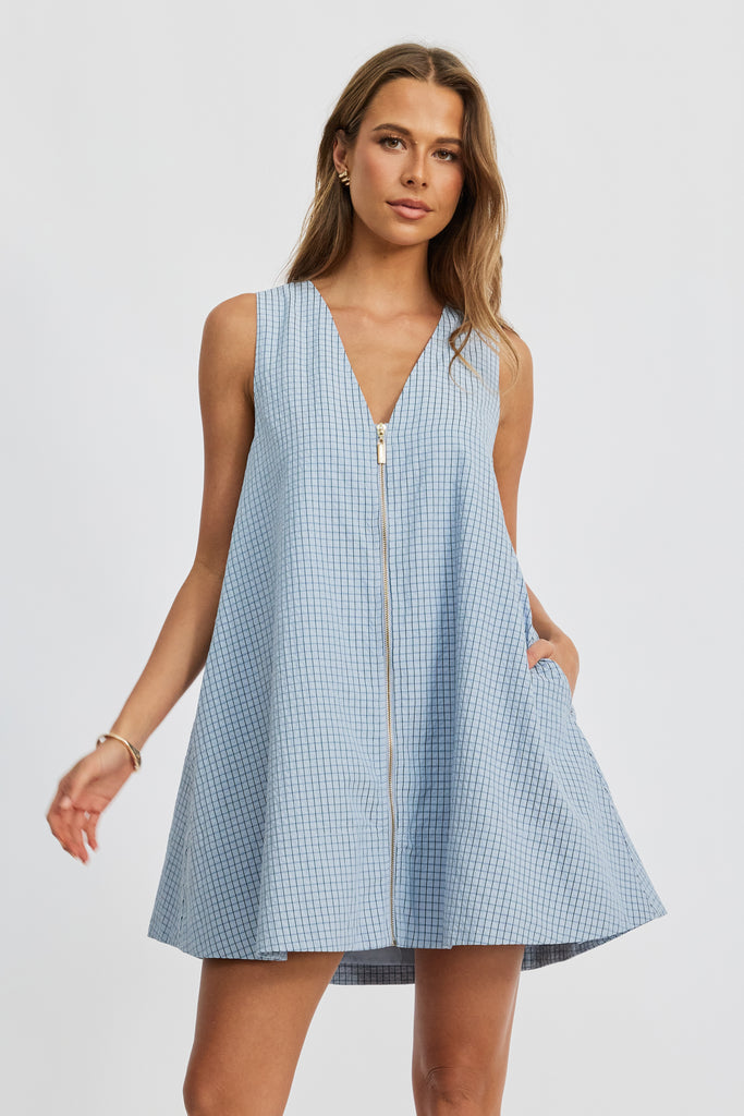 Available in fresh Apple Green and cool Blue, the Lettie Zip-Front Mini Dress will be on high rotation all summer long, perfect for picnics, brunches, and days spent in the sun.
