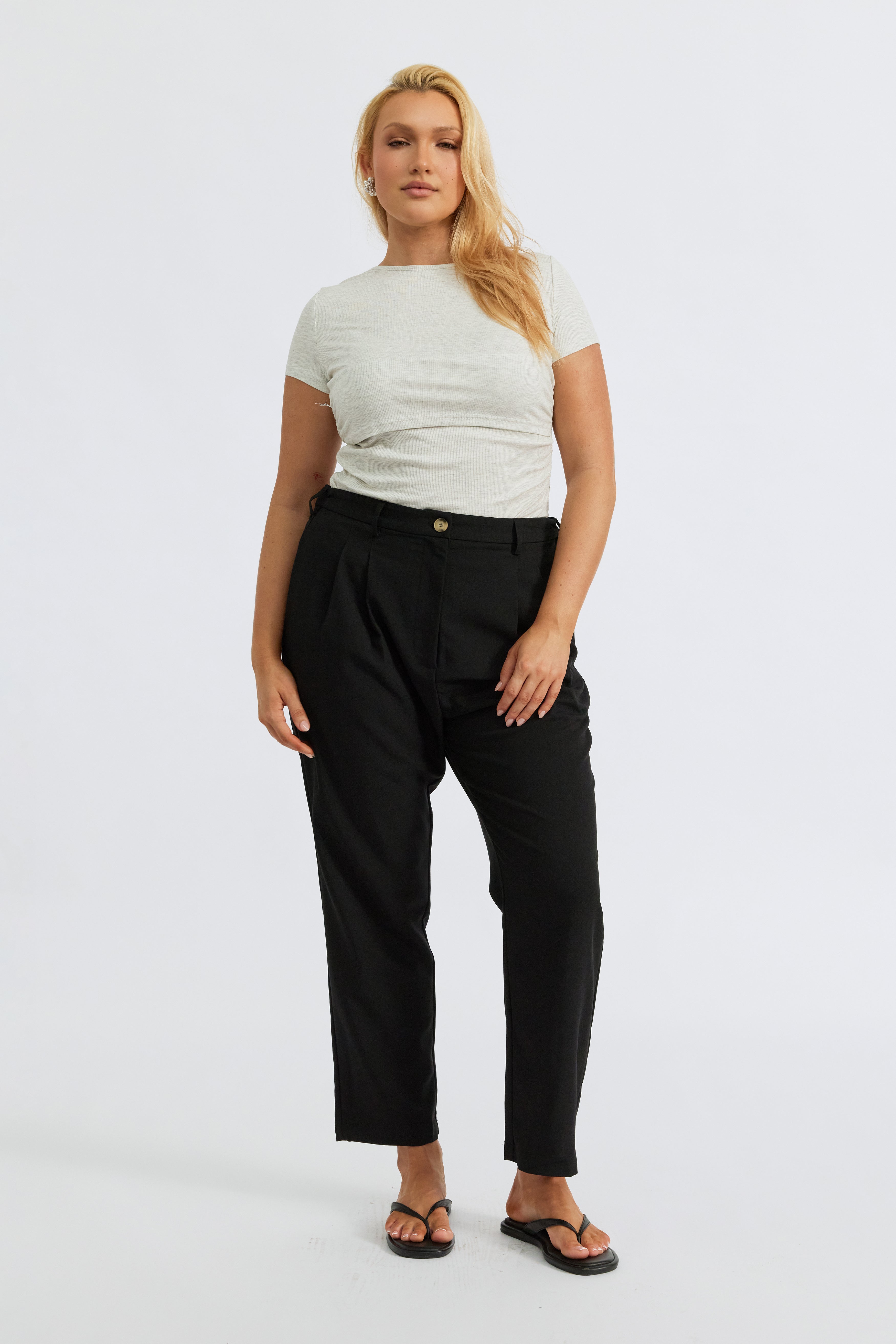 A hidden elastic band has been sewn into the back waistband to cater for a growing baby bump and on the inside of the pants there are two adjustable elastic bands with button holes. To adjust the waist size, simply switch the hole where the internal button on the sides fastens into. Once fastened in the comfortable buttonhole, we recommend adjusting the ruching at the back waistband to neaten up the sides for a clean and finished look.