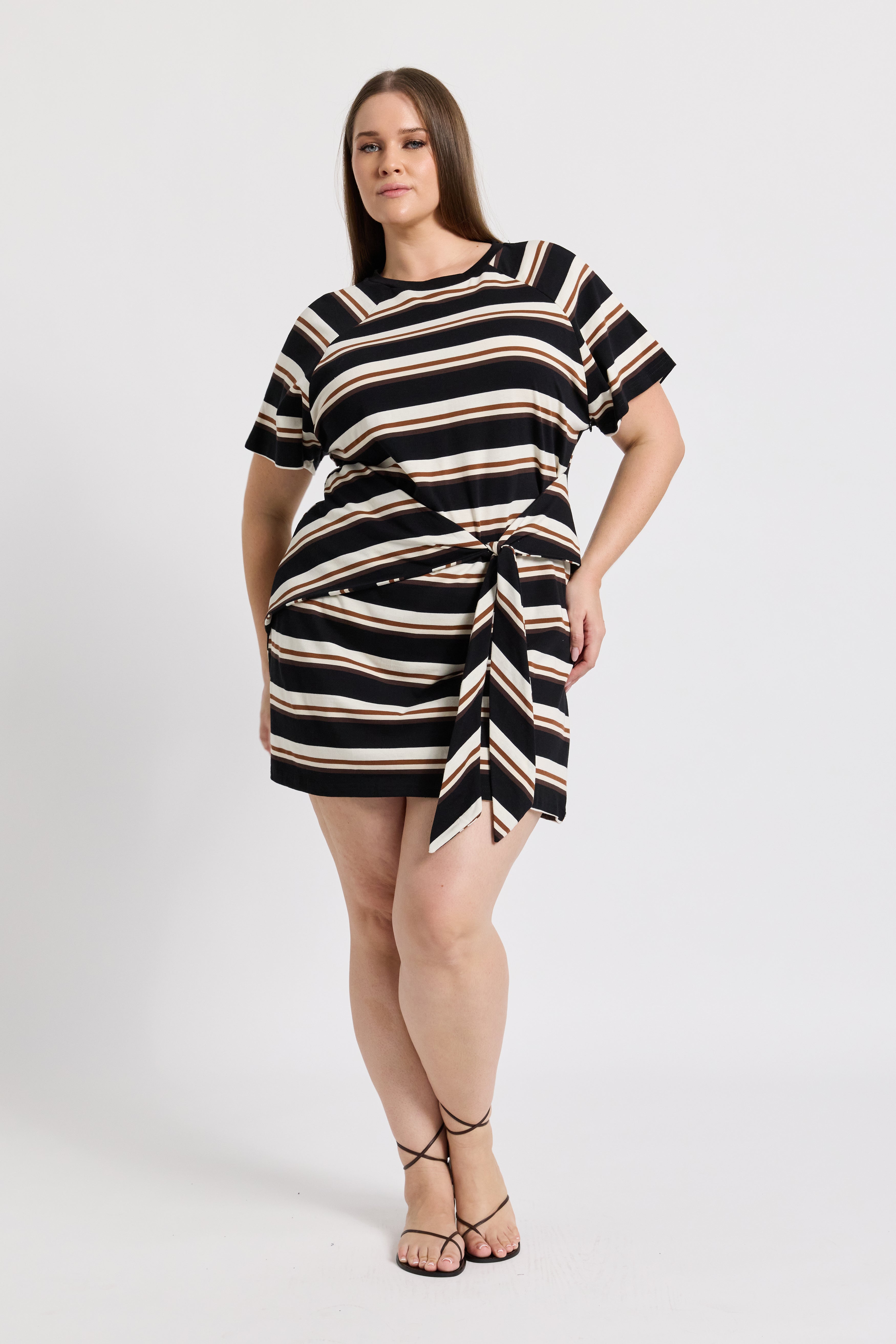 Asymmetric tie panels at the sides allow you to cinch the waist for a flattering silhouette and add subtle visual interest to the design. Made from heavyweight cotton jersey, the Sydney Dress is structured yet breathable, with a mini length, round neckline, and neutral stripes for effortless, bump-to-beyond style.