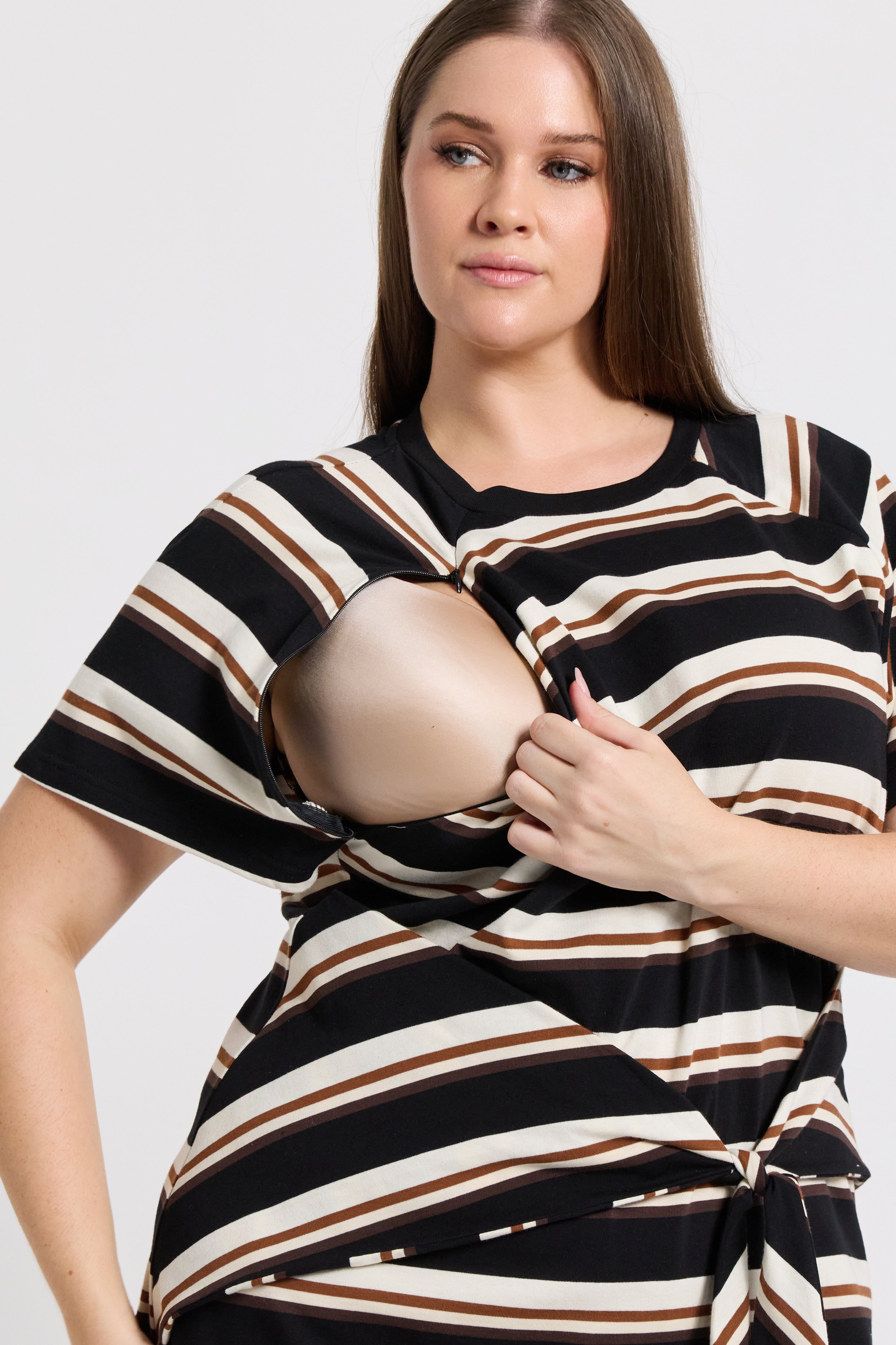 The Sydney Stripe Tee Dress blends effortless style with practical functionality for pregnancy, breastfeeding, and beyond. Invisible zippers hidden in the front bias armholes provide discreet nursing access, while the relaxed box-cut shape and short raglan sleeves ensure all-day comfort.
