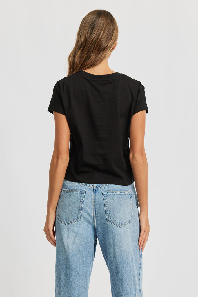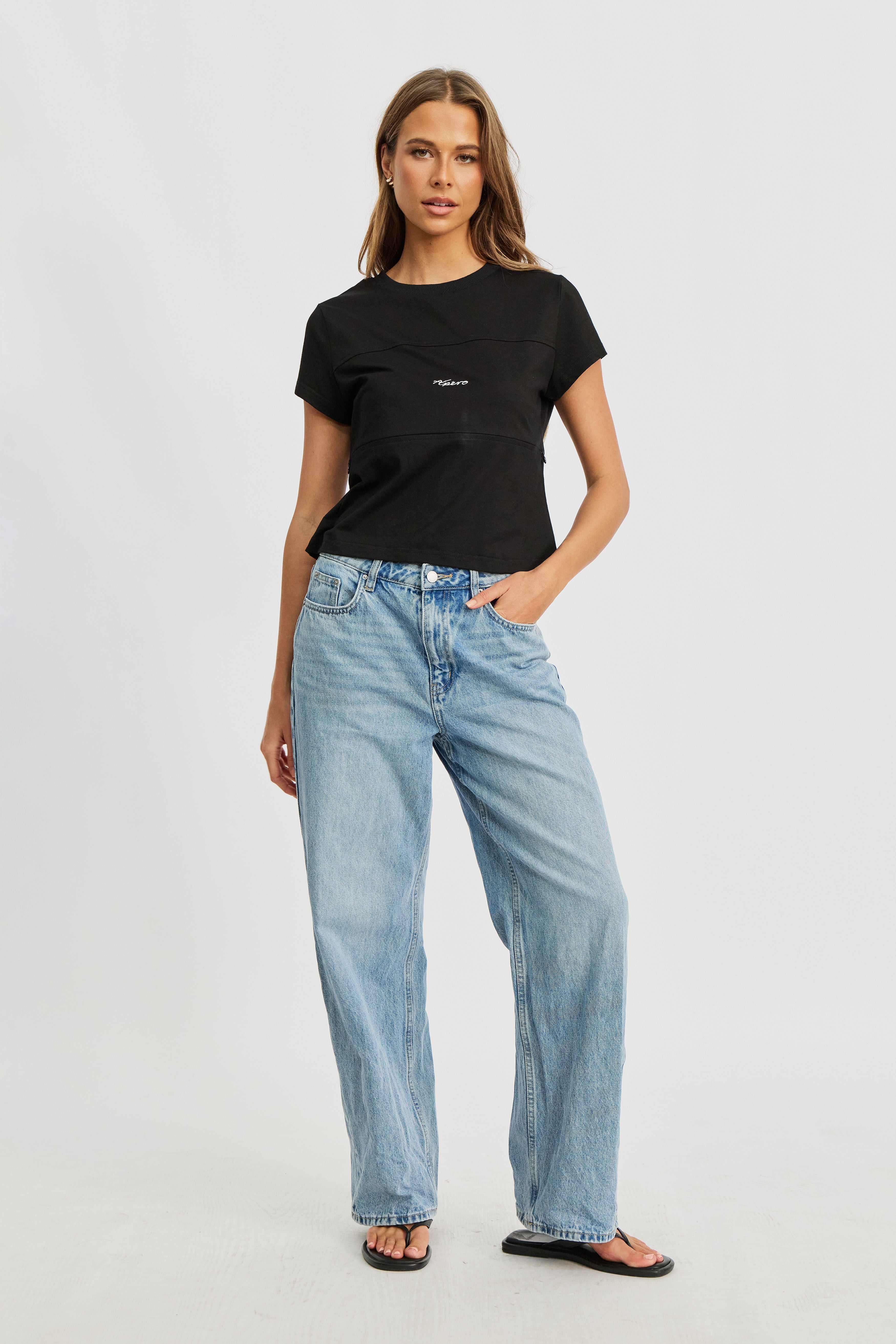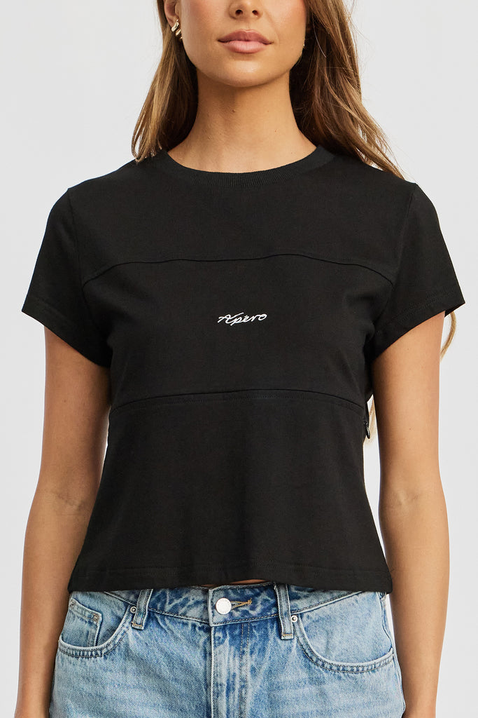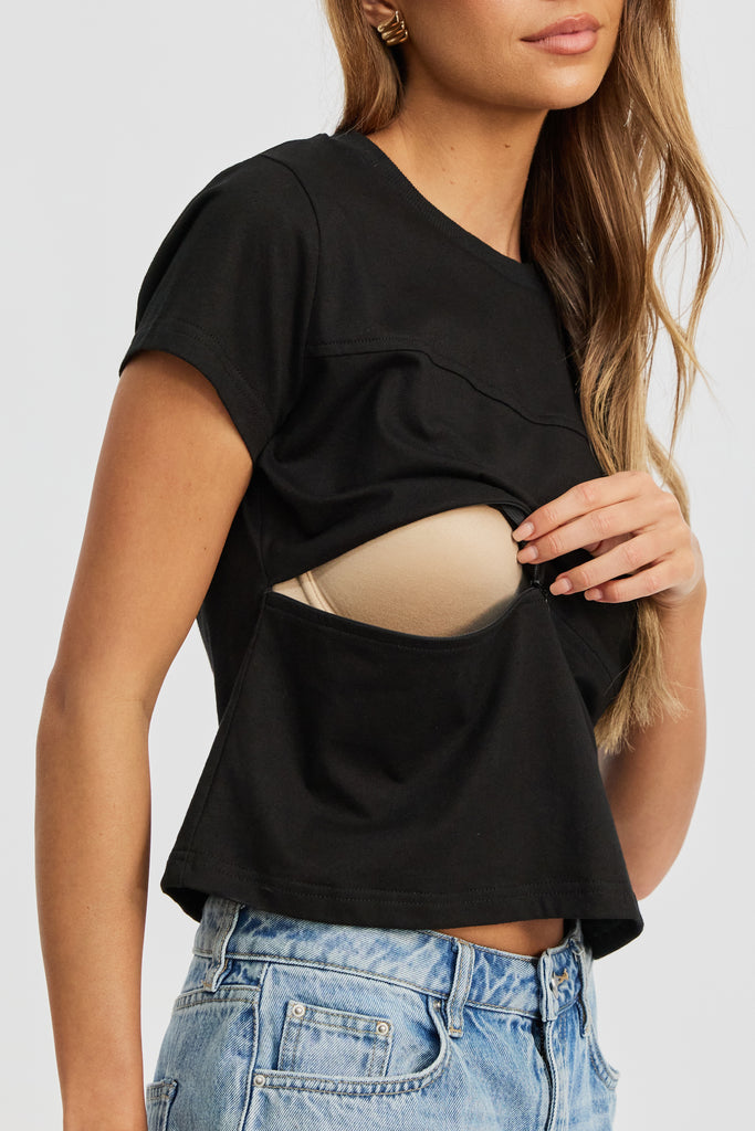 The Wren Panelled Baby Tee in Black offers a modern take on the classic baby tee with thoughtful features for motherhood. Made from soft cotton jersey, it has a slimmer body fit that creates a traditional, flattering silhouette, while a semi-cropped length sits just above the hips.